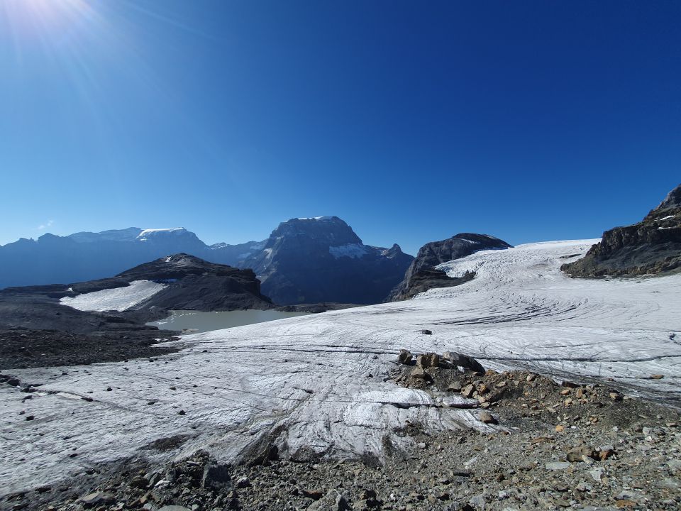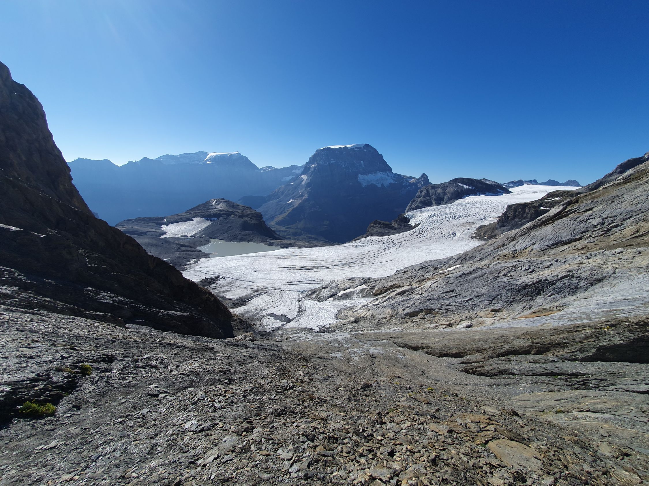 Die Gletscherquerung (wenige Meter) ging ohne Steigeisen (das kann aber evtl. je nach Verhältnisse auch anders sein). Im Rucksack schaden sie nicht.