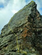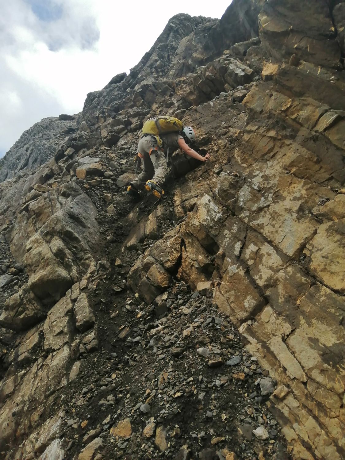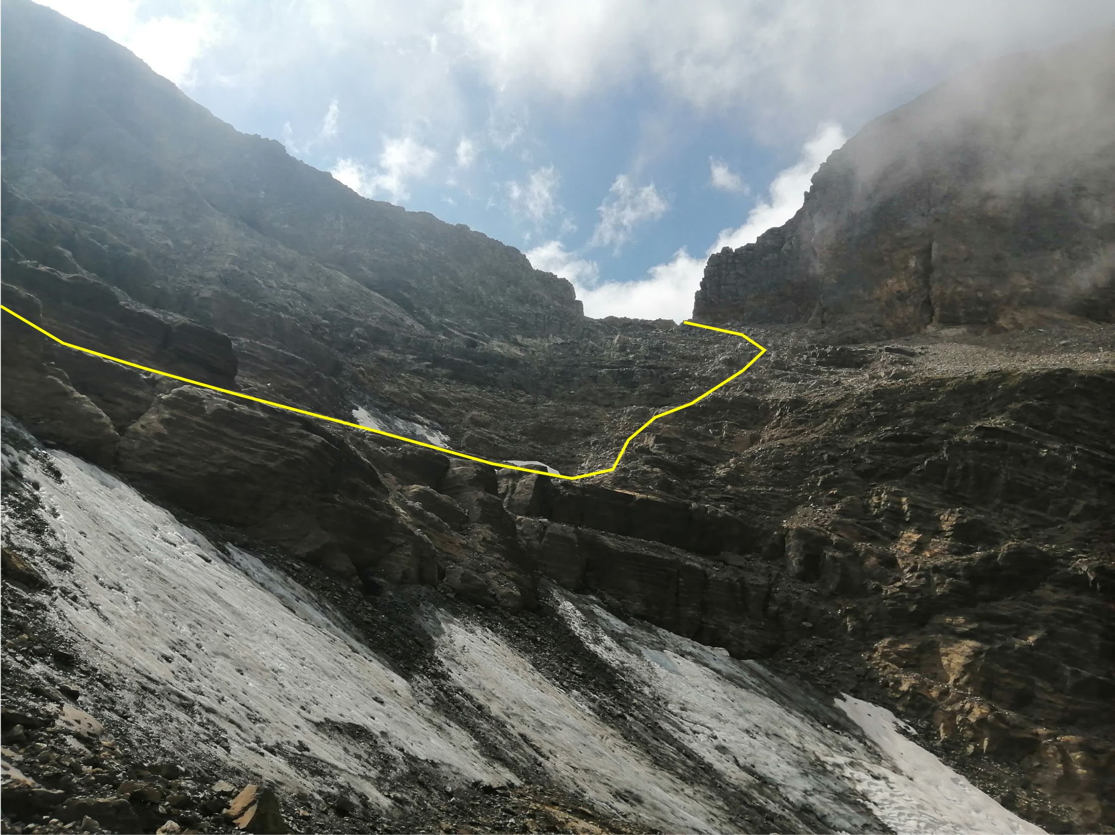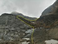Ist die Flanke wie jetzt ausgeapert ist es sicher komplizierter den Sattel zwischen Oberberg und Hasenstock zu erreichen als im Frühsommer mit reichlich Schnee. Etwas östlich des Haupttrichters zieht sich zwischen hellerem und dunklerem Gestein ein gut begehbares und vor Steinschlag recht gut geschütztes Band hoch. Dieses Band erreicht man über eine steile Kraxelpassage in steilem Schutt (II, ca. 5 m). Wenn das Eis weiter abschmilzt, könnte diese Passage entsprechend länger werden. Ab dem Ende des Bandes haben wir die Route mit Steinmännchen markiert. Man zieht wieder zurück in den Trichter, überquert diesen und erreicht einfach den Sattel.