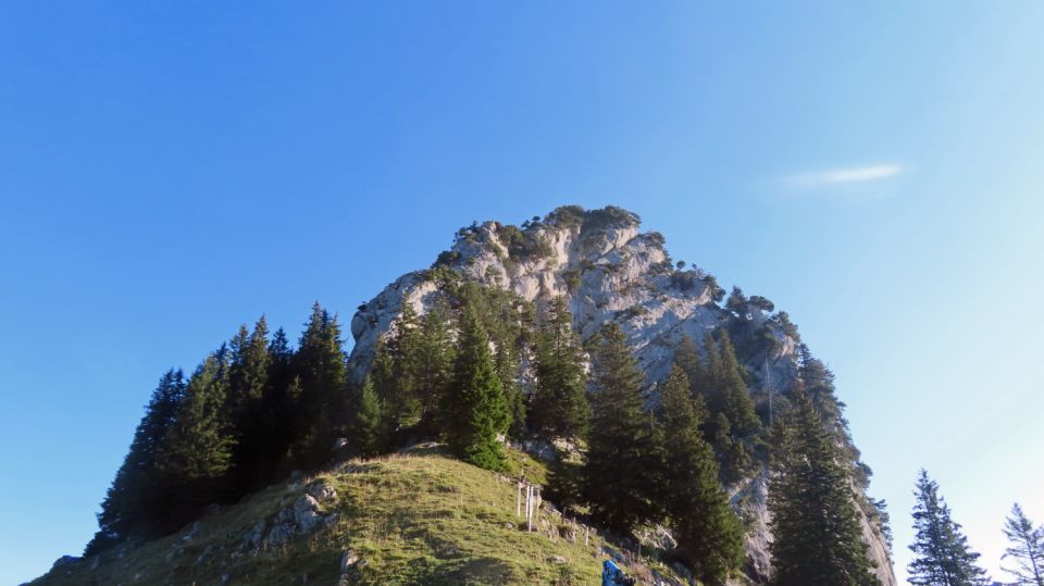 Die anspruchsvollen Passagen befinden sich am Mittler Goggeien. Die fußbreite Traverse nordseitig im Steilhang unter dem Grat erscheint durch den Bewuchs nicht so ausgesetzt. Vorsicht ist dort aber besonders geboten.
