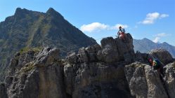 Rasch erreichen wir anschliessend den Einstieg zum eigentlichen Elferkofel-Klettersteig. Schon hier wird sichtbar, dass das mit Sicherheit kein Spaziergang ist. Mit dem Einstiegskamin (C) geht es gleich ordentlich zur Sache. Der Steig fordert sofort Armkraft, Technik und absolute Immunität für die atemberaubende Ausgesetztheit der Tour. Am Gipfel der Elferspitze ist mir das Erfolgserlebnis dann ins Gesicht geschrieben. Hier aufzuatmen wäre aber zu früh. Denn jetzt geht's erst richtig los. Die Überschreitung mehrerer senkrechter Felstürme im Elferkamm ist eine Achterbahn der Gefühle. Spreizschritte direkt auf der Gratkante über himmelhohen Abgründen, senkrechte Wände an denen man sich mit seiner eigenen Armkraft hinunterlassen muss, nur mit Technik durchsteigbare Passagen durch Felsspalten und das stetige auf- und ab im höchst ausgesetzten Gelände, fordern auch geübte Klettersteiggeher.