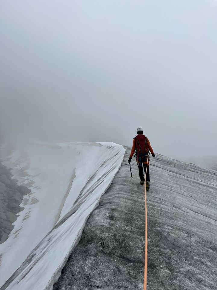 Homattugletscher bis zum Breithornpass komplett blank mit Felspassagen zwischendurch. Seilfrei gut und schnell begehbar. Rüber zum Alpjergletscher über Felsen und nahe P. 3392m angeseilt den Gletscher betreten, der dort eine Art breiten Blankeisgrat (siehe Photo) gebildet hat, der gut zu laufen war. Gletscher dann komplett im Nebel. Einige sehr große Spalten, aber alles offen und gut passierbar. Haben erst nach einer Möglichkeit gesucht vom Gletscher auf den Westgrat zu gelangen, was sich wegen des Gletscherrückgangs als unmöglich erwiesen hat. Dann rüber zum Südgrat gequert, um nach einer passenden Stelle zum Aufstieg auf diesen zu finden. Der Bergschrund war kein Problem und quasi nicht vorhanden. Durch die starken Regenfälle der vergangenen Tage und des Gletscherrückgangs ist recht viel aus den Gratflanken abgebrochen und es war ziemlich schwierig und etwas heikel durch sehr brüchigen Fels auf den Grat zu klettern. Sind kurz überhalb von P. 3320 auf den Grat hoch (von unten ist eine Schlinge sichtbar). Sind dann auf ca. 3400m umgedreht, weil wir komplett im Nebel hingen, die Wegfindung dadurch nicht einfach war (sind eher über die ersten Türme geklettert, als um sie herum zu laufen, was wohl sinnvoller gewesen wäre). Der Fels war recht schmierig und total brüchig. Haben dann an einer Schlinge wieder auf den Gletscher runter abgeseilt und sind diesmal etwas tiefer haltend auf ca. 3300m wieder auf den Felsen und im Gegenanstieg zurück zum Breithornpass gegangen. Haben dann das Breithorn noch mitgenommen, was auch total im Nebel hing und uns ebenfalls mit komplett blanken Gletscher, einer heiklen Querung im Eis und komplett brüchig-schuttigem Felsen empfing.