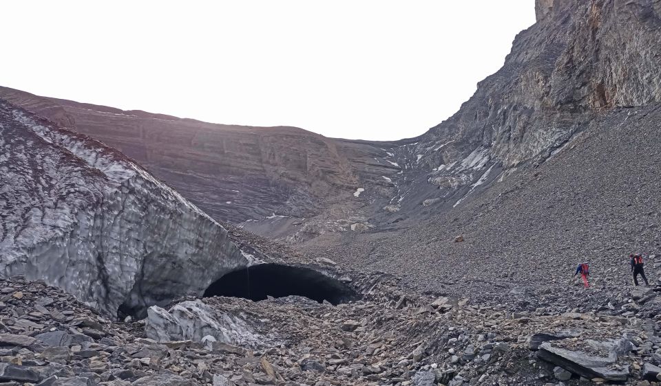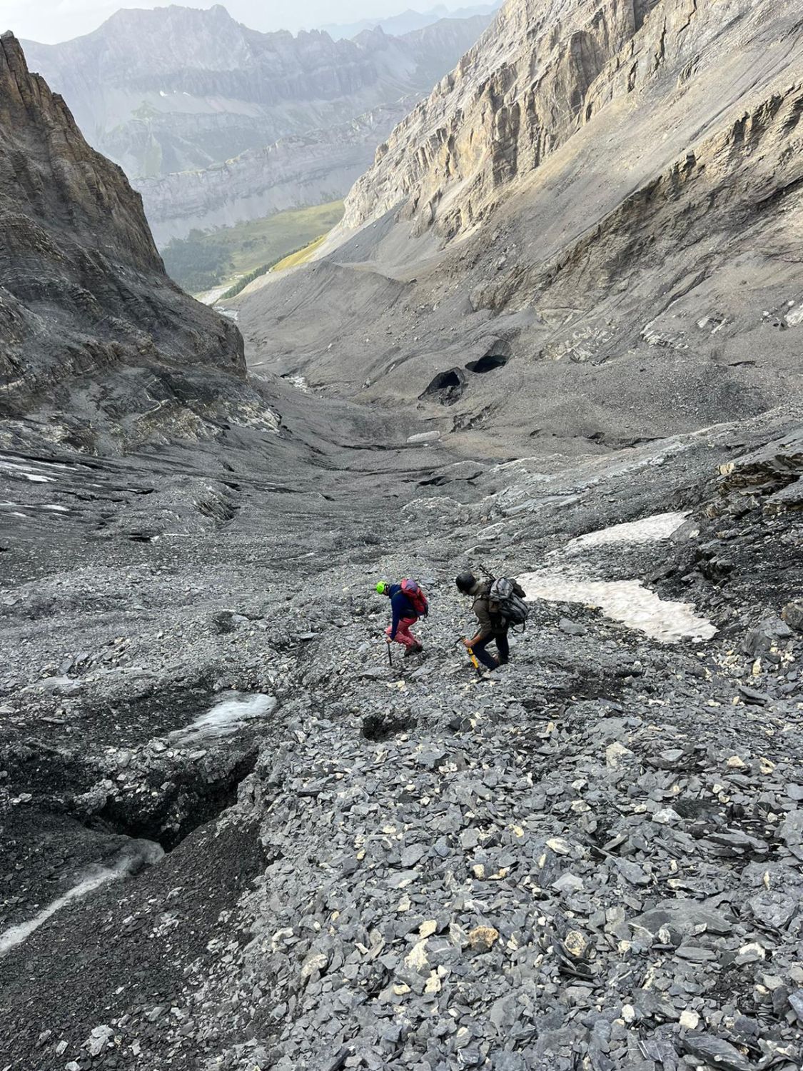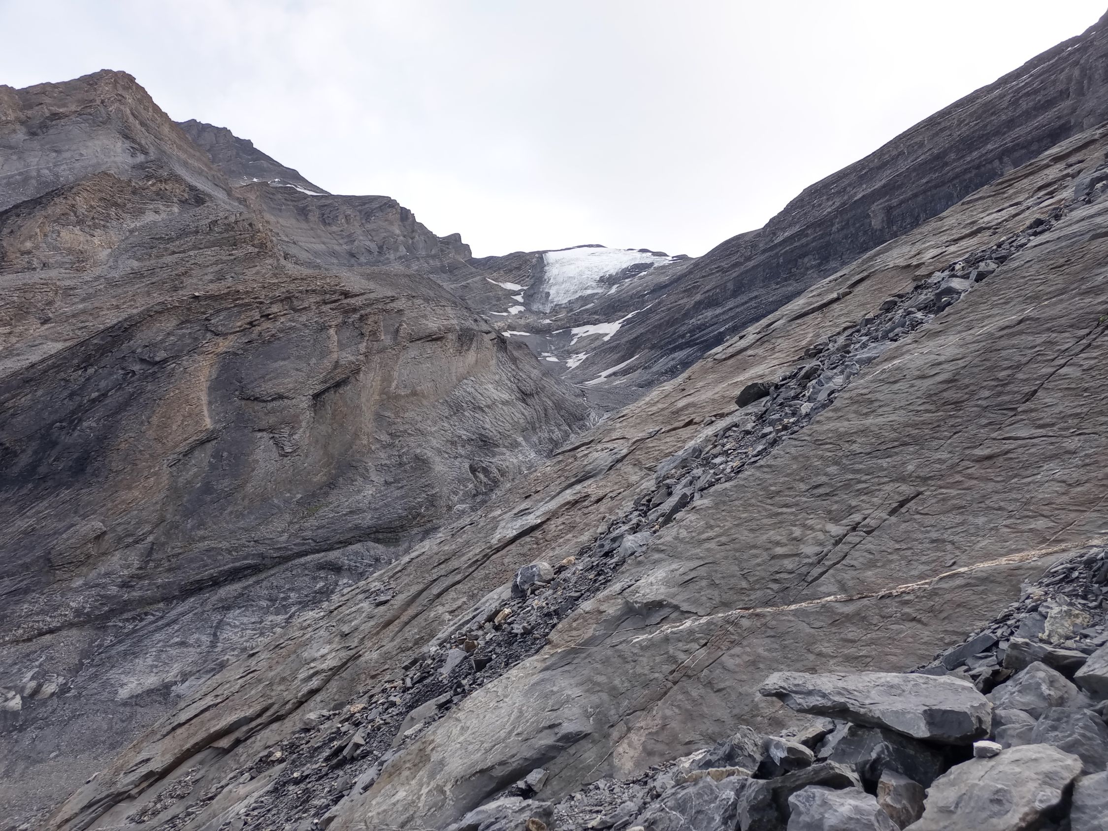 Es hat auch einige ziemlich grosse Spalten/Löcher/Unterspülungen in der Flanke, die Vorsicht erfordern. Falls hier einmal wieder Schnee liegt, wäre Anseilen anzuraten. Wir sind auf ca. 2900 über steiles Blankeis nach links zuerst auf nassen, glatten Platten, dann in die Geröllflanke gequert. Hier leiten Steinmänner auf einem rutschigen Pfad nach oben, er mündet bei etwa 3000m in den in der LK eingezeichneten Weg. Den Pfad haben wir allerdings erst im Abstieg entdeckt, im Aufstieg sind wir mehr oder weniger direkt über brüchiges Gestein gekraxelt.