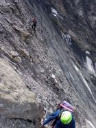 Die Schwierigkeiten befinden sich im Erreichen des Zackenjochs. Die ganze Flanke besteht aus Blankeis, reichlich mit Geröll übersäht und nicht angenehm zu gehen. Das Gute dabei: Steinschlag ist kein Thema, der wird im Geröll sofort gebremst. Wir haben auch keinen Steinschlag wahrgenommen.