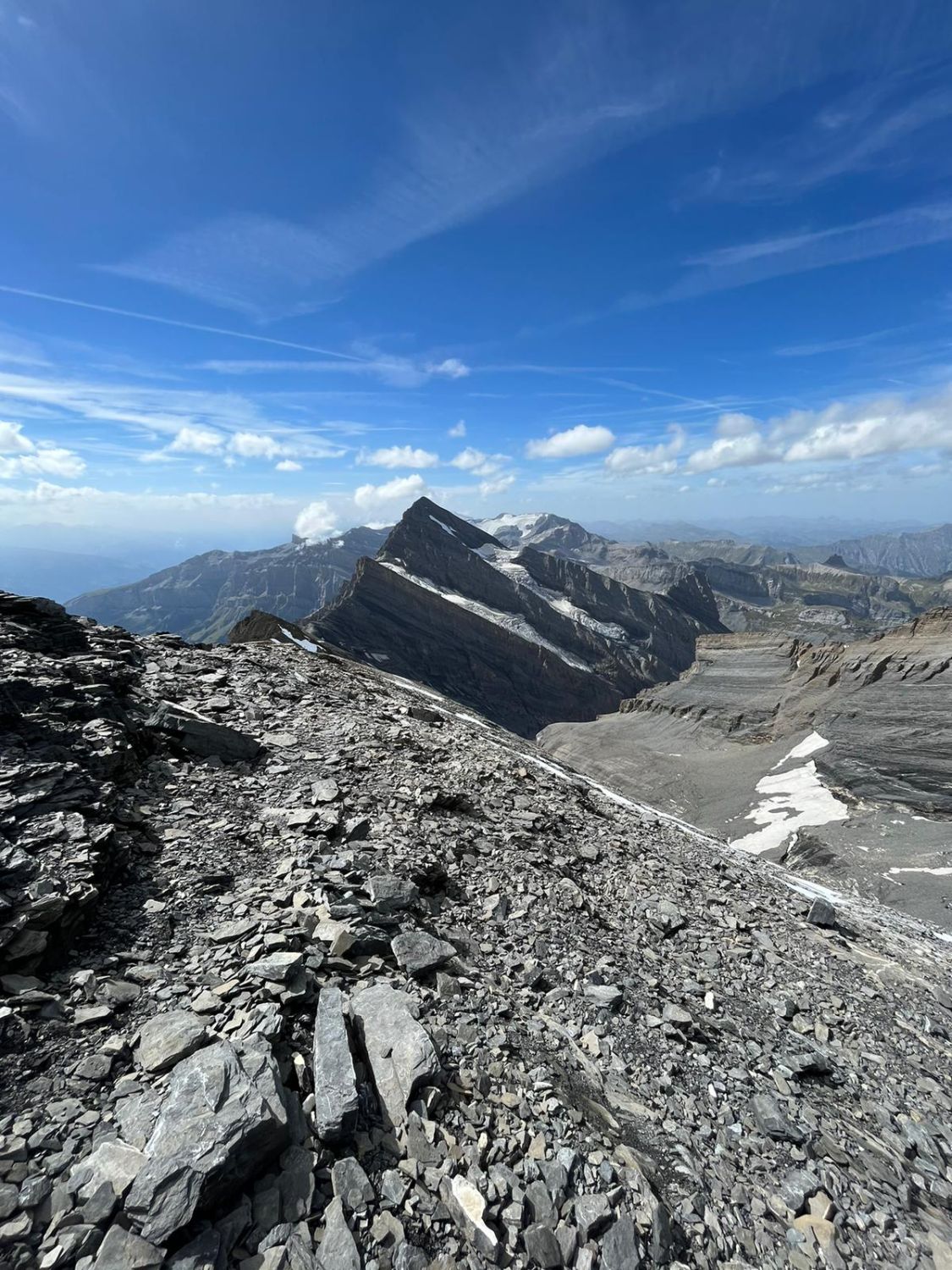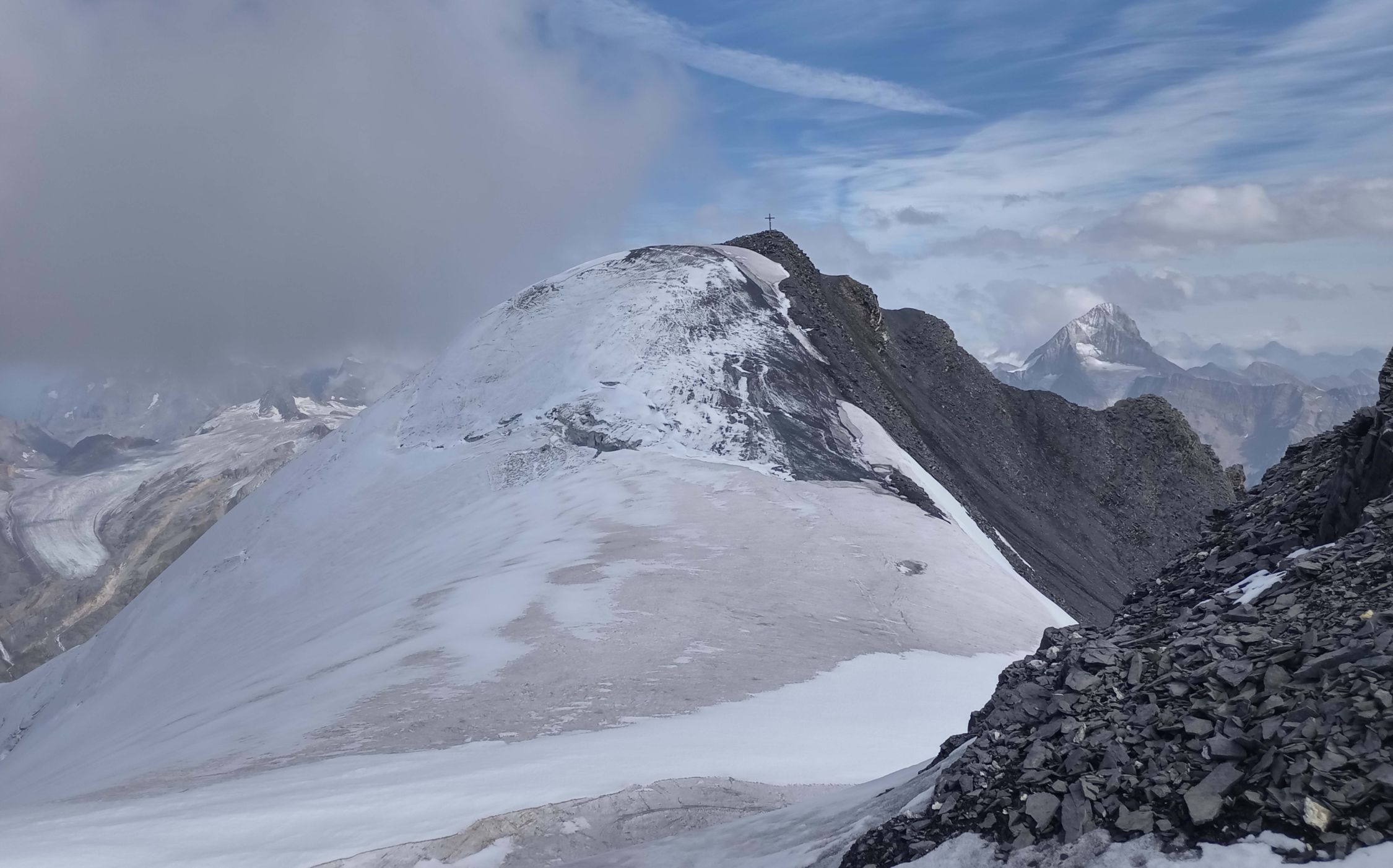 Der eigentliche Zackengrat ist sehr gut zu begehen, alles ist trocken. Es gibt noch eine letzte, 50m lange Blankeisstelle auf ca. 3600m. Firn hat es nirgendwo mehr, selbst nicht auf dem Übergang zum Hauptgipfel.