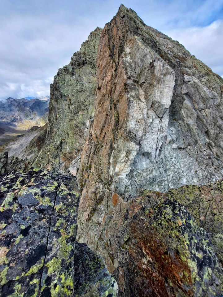 Leider finden sich nur wenig Einträge zur Überschreitung des Piz Radönt über den Ostgrat seit dem Felsausbruch im Netz. Wir haben die Überschreitung am Sonntag gemacht und folgendes (in Ergänzung zum Topo Silbernagel). Nach dem 2. Turm wird die Ausbruchstelle sichtbar. Von hier eine Seillänge abseilen in die Scharte oder noch eine Seillänge (Muniring auf einer Platte) bis ins Couloir. Kann auch abgeklettert werden. Insgesamt finden sich ab der Abseilstelle folgende Absicherungen beim Abseilen in die Scharte: Bolt mit Maillot, Repschnüre um markanten Zacken, Bolt auf Querung, Bolt oberhalb Riss, Repschnur. Die Tour im Silber wird mit 3c angegeben. Die neue Route ist definitiv schwieriger, schätze im 5er Bereich, die Passage ist senkrecht und teilweise brüchig. Alternativen: nach dem 1. Turm in die Flanke links absteigen und über ein Band ins Couloir einsteigen, das zum Einstieg Turm 3 führt (Umgehung der Abseilstelle). Wem der 3. Turm zu schwierig ist steigt das schuttige Couloir direkt hoch auf den Gipfel, max. T5.