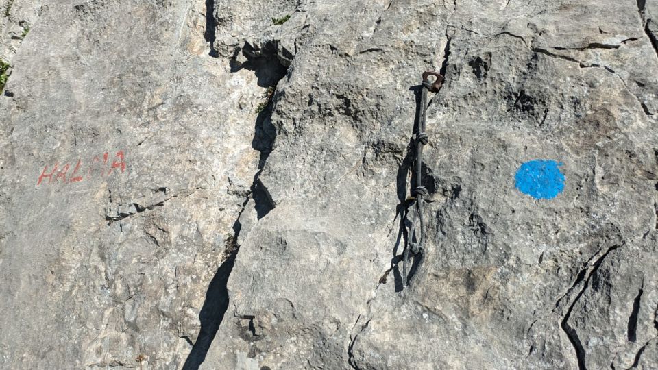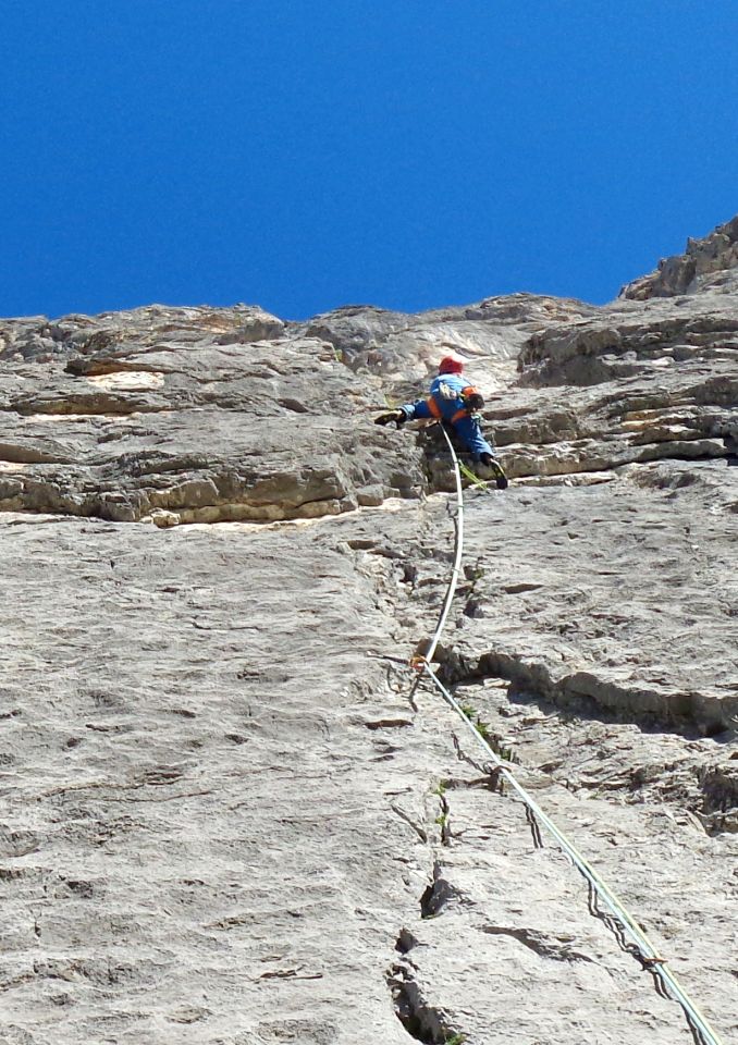 Charakter: Eine der best-abgesicherten alpinen Routen, die ich kenne (ich bin dankbar für Tipps zu ähnlichen Routen), und durchgehend perfekter Fels. Extrem athletische Kletterei, aber begeisternd interessant. Reine Reibungsplatten kommen nicht vor. Es gibt keine klare Crux-Länge, aber es gibt auch kaum mal ein paar Meter die geschenkt sind. Halma heißt von unten bis oben dranbleiben und weiterspringen..... Routenfindung ist wegen der vielen Bh kein Problem. Unten ein paar Detailbemerkungen (Spoiler; muss man ja nicht lesen)