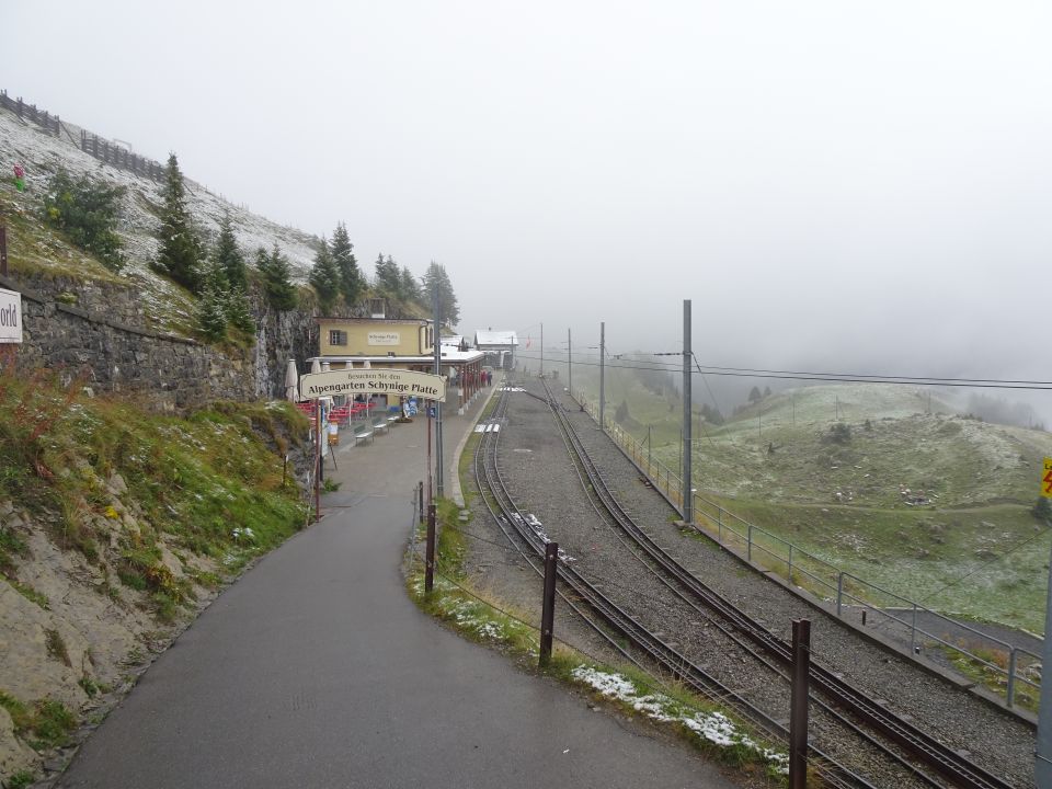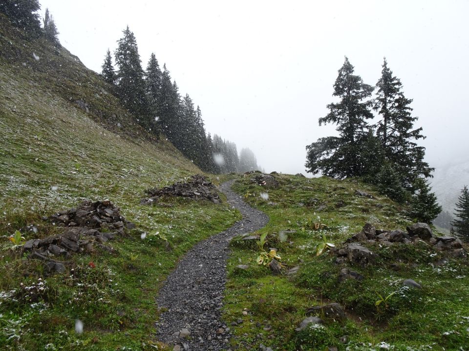 Beim Start leichter Nieselregen, später Schneefall, dann Wetterbesserung aber leider oft Nebel, ab ca.2030m Schnee rasch zunehmend, nur Schwachwindig aus NW, Wege entsprechend nass und rutschig,