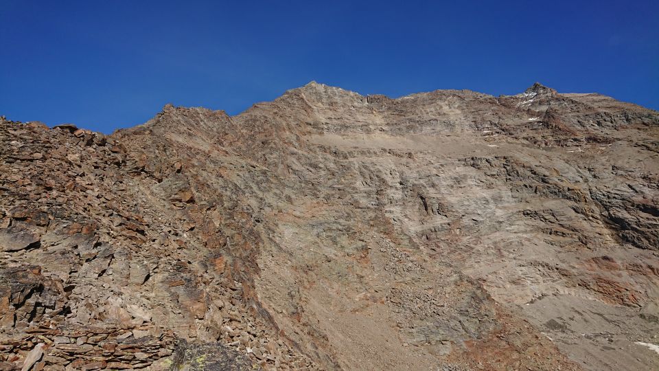 Bis 5 Minuten vor dem Gipfel alles trocken und schneefrei. Für den letzten Aufschwung haben wir Steigeisen und Pickel benötigt.