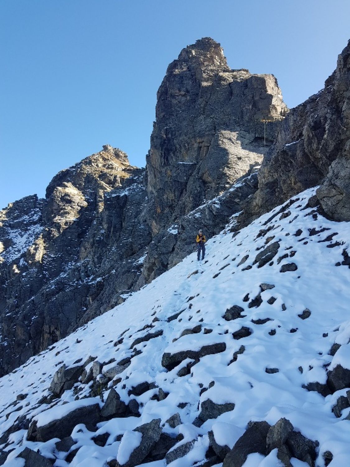 Im Zustiegscouloir ist Vorsicht geboten, viele lose Blöcke.