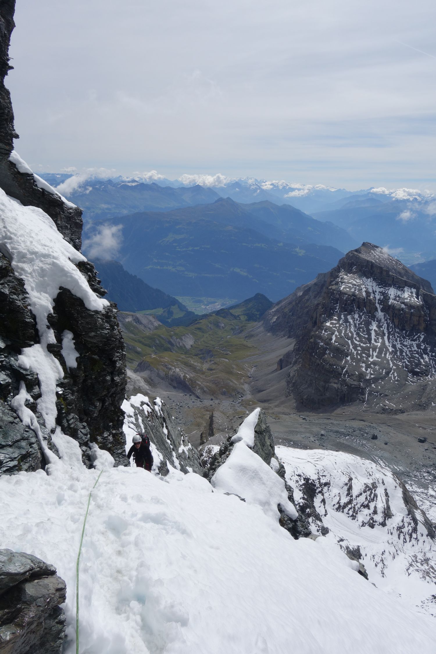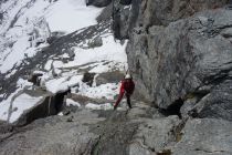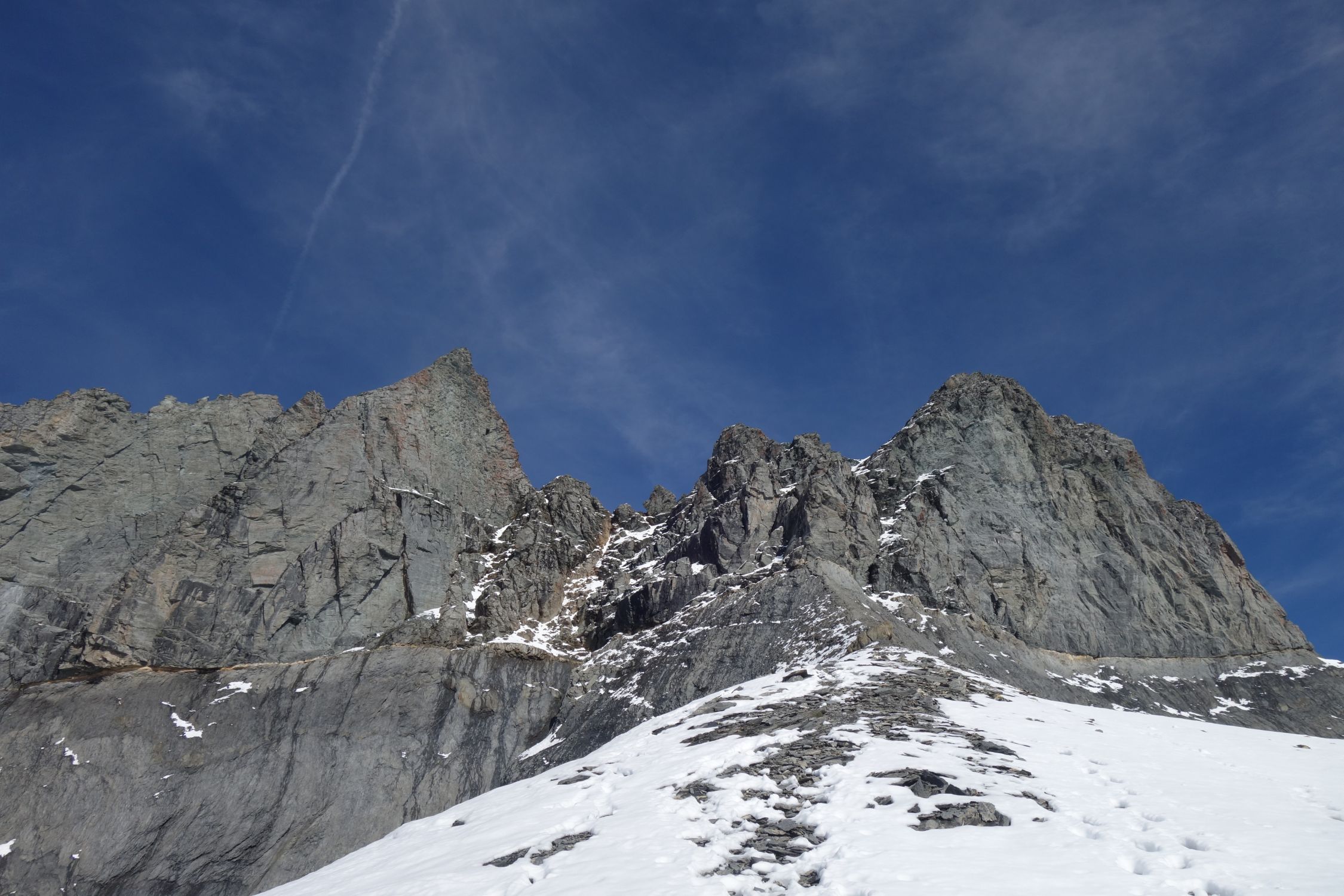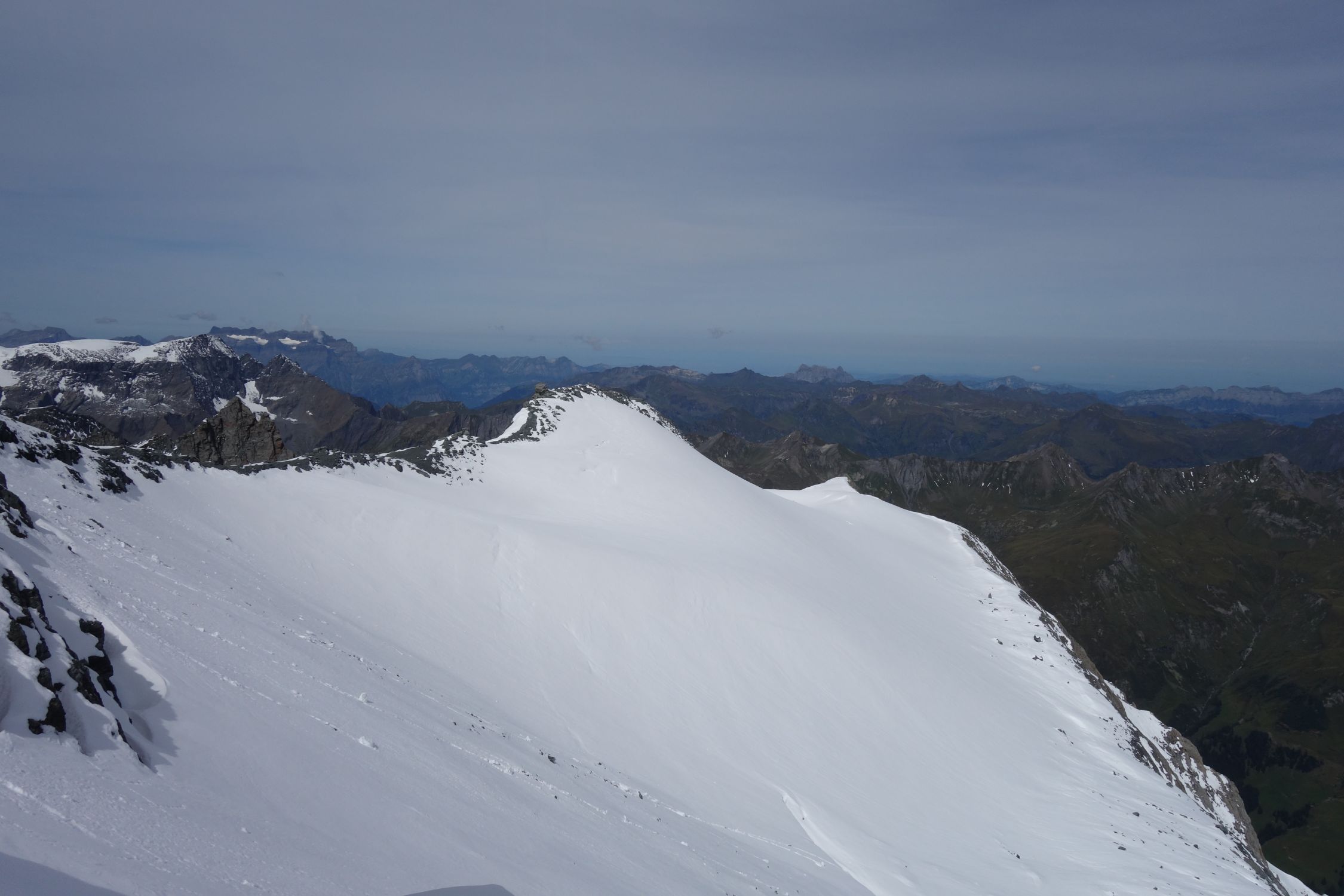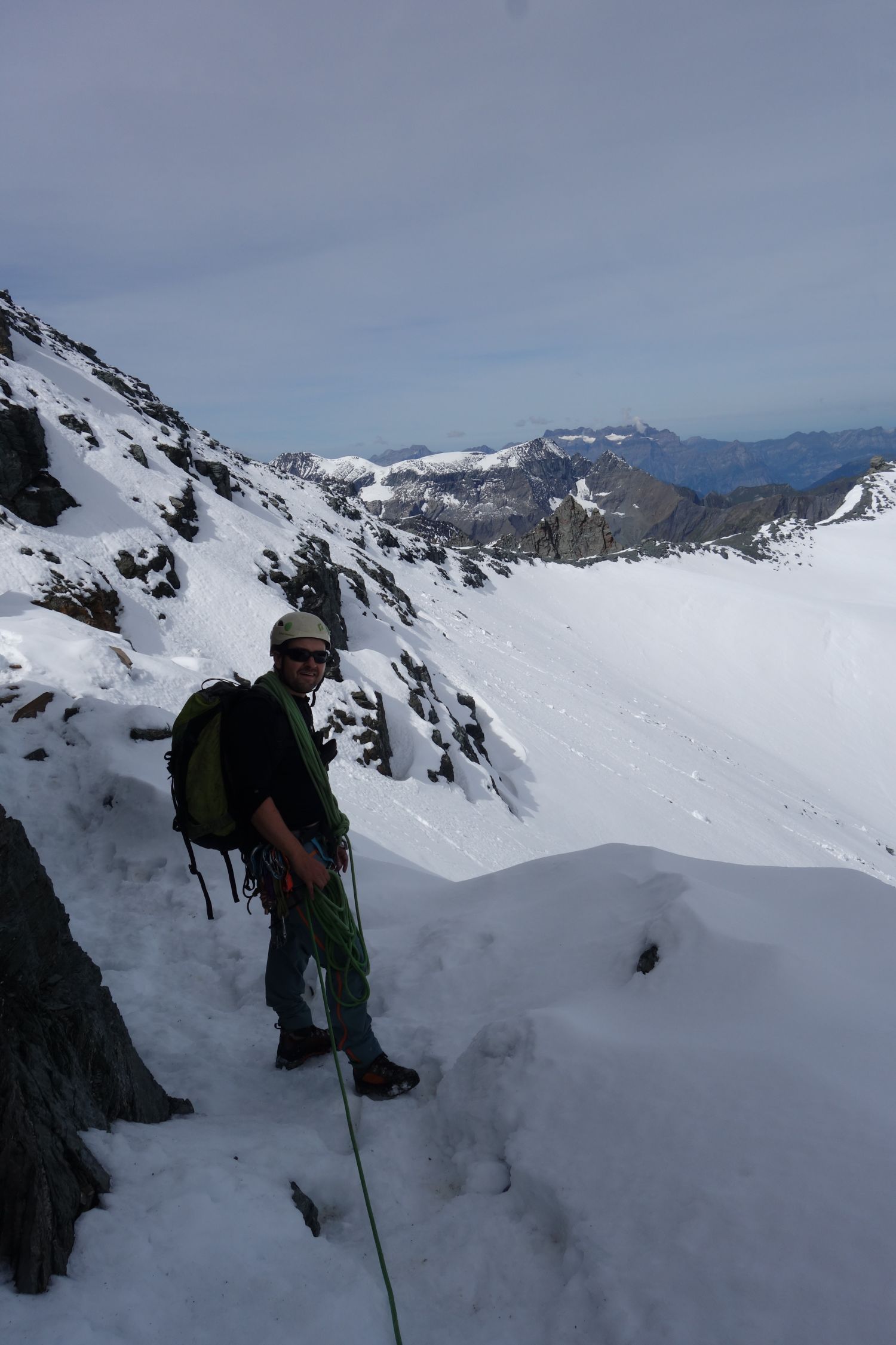 Start um 5:45 am Kunkelspass. Um ca. 10:30 beim Einstieg am Grat, bis dahin ab ca. 2800m gefrorener, griffiger Schnee, noch keine Steigeisen nötig.