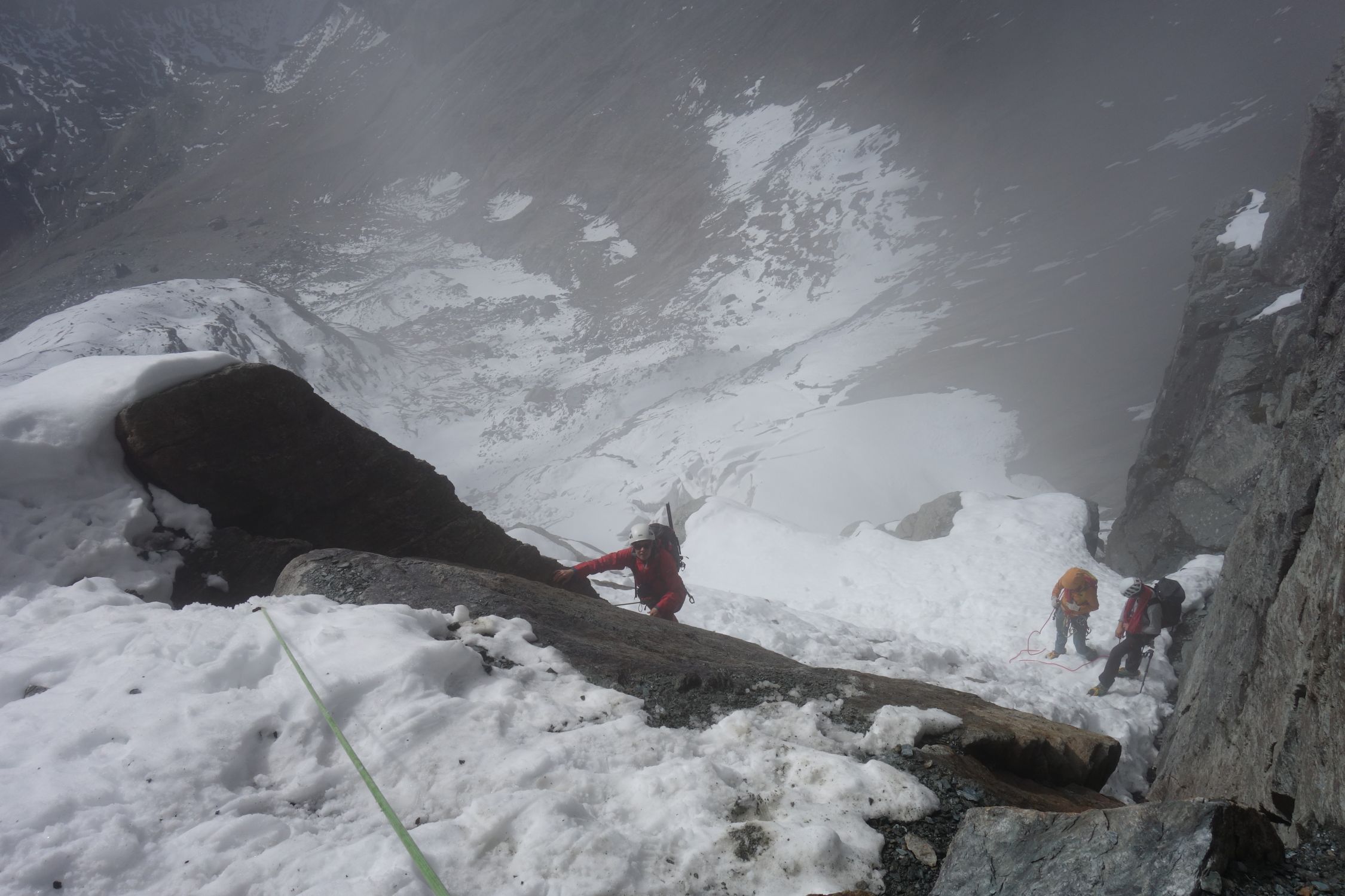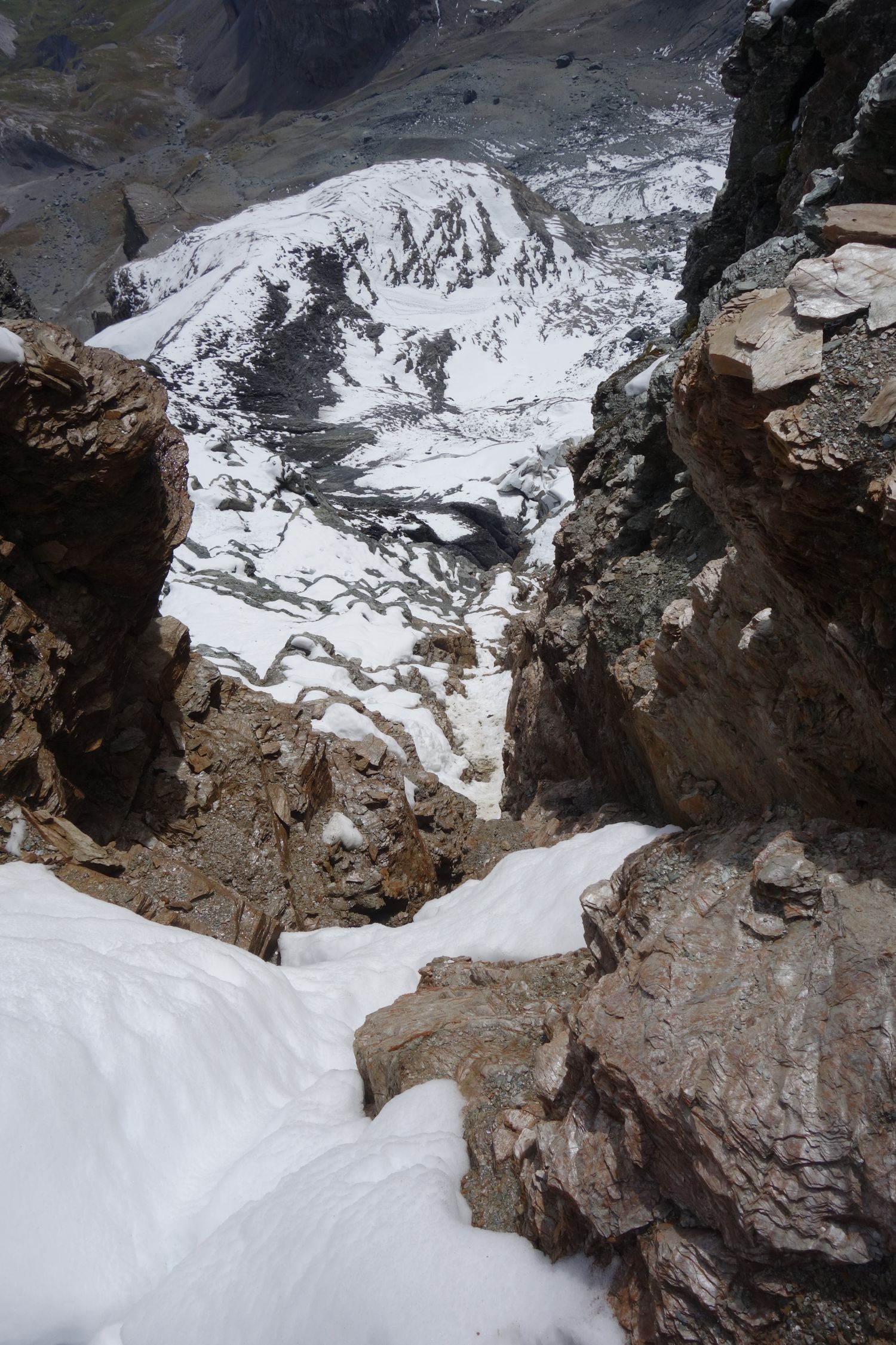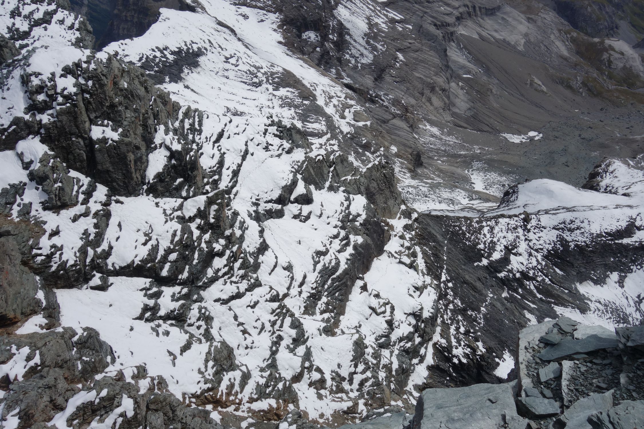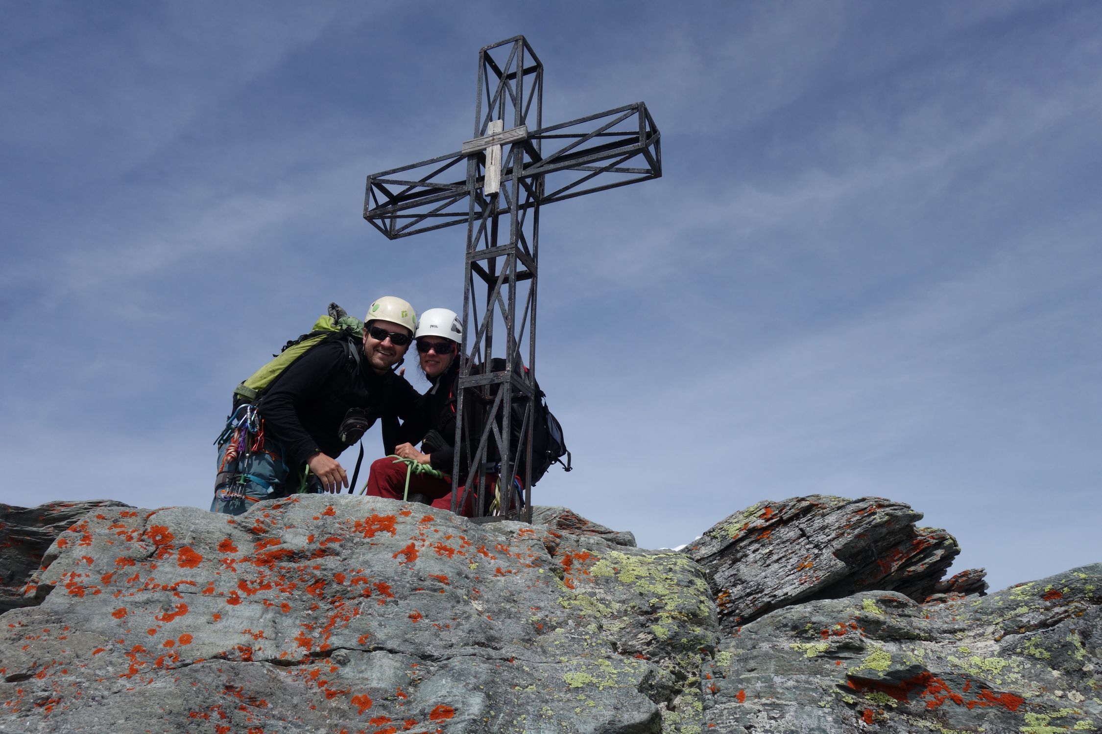 Start um 5:45 am Kunkelspass. Um ca. 10:30 beim Einstieg am Grat, bis dahin ab ca. 2800m gefrorener, griffiger Schnee, noch keine Steigeisen nötig.