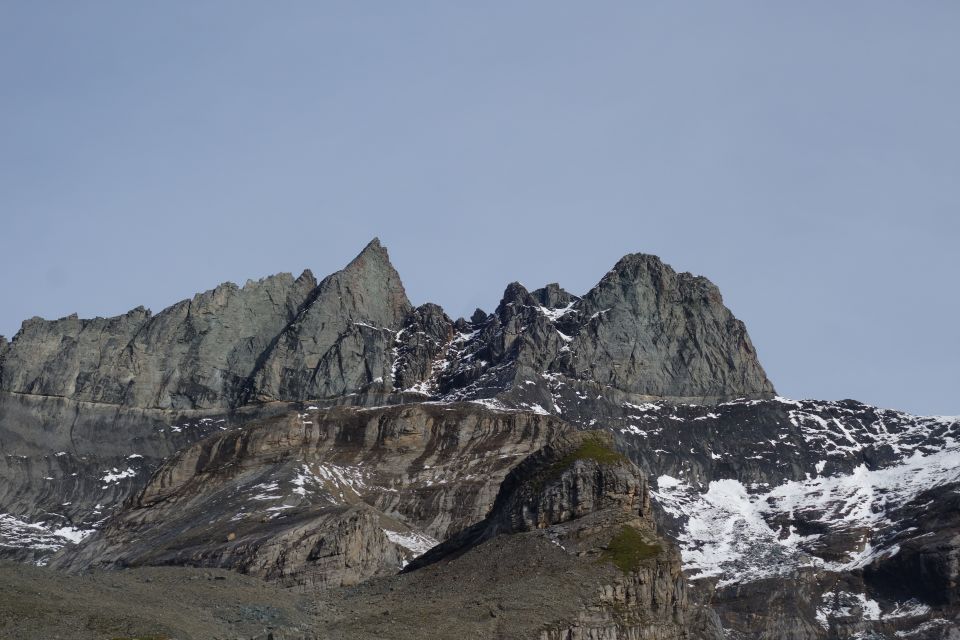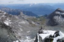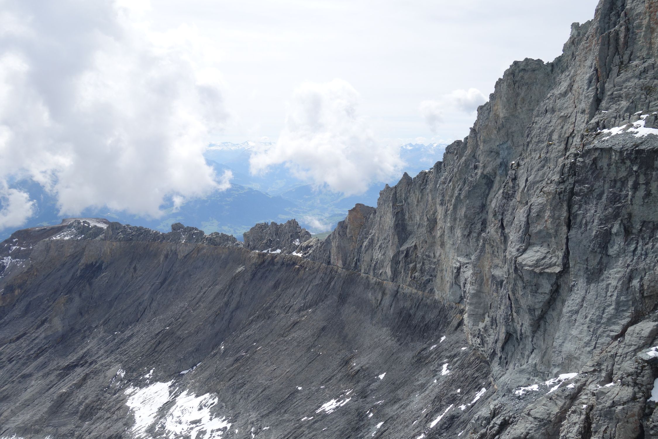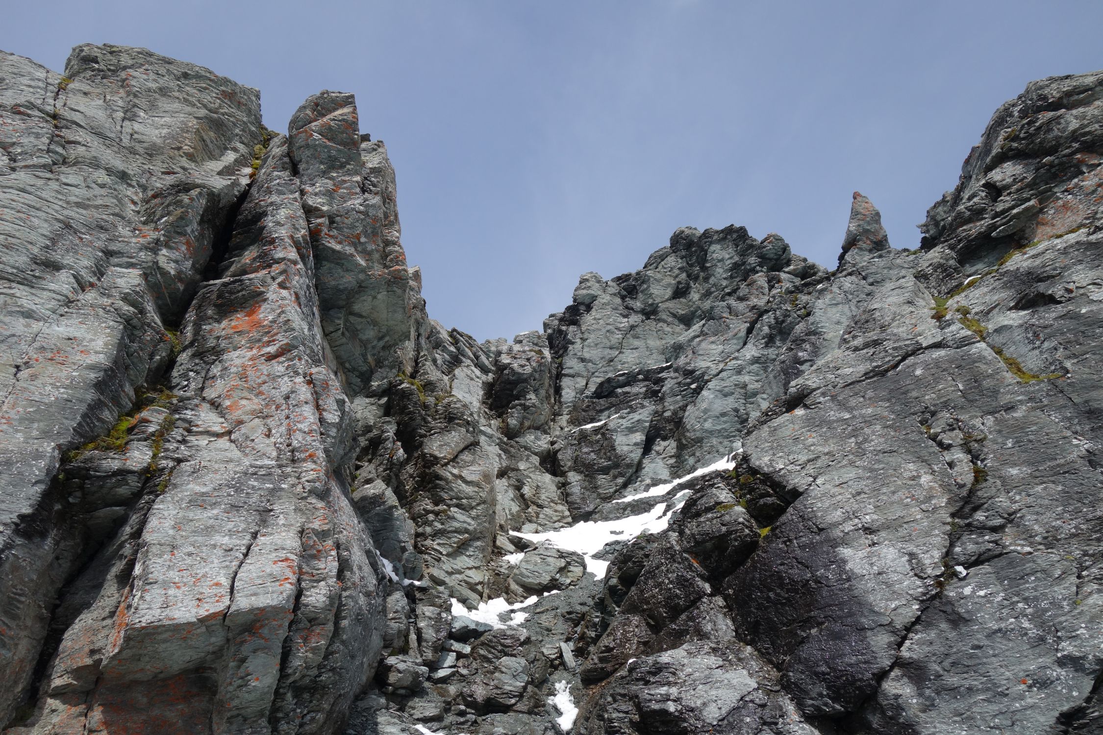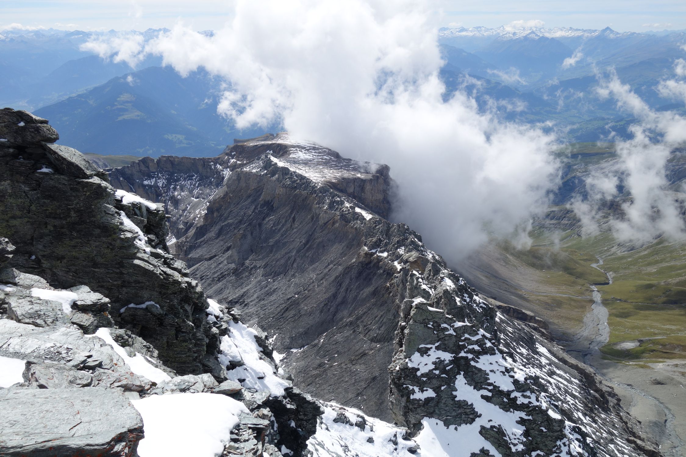 Start um 5:45 am Kunkelspass. Um ca. 10:30 beim Einstieg am Grat, bis dahin ab ca. 2800m gefrorener, griffiger Schnee, noch keine Steigeisen nötig.