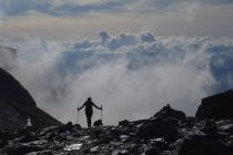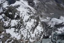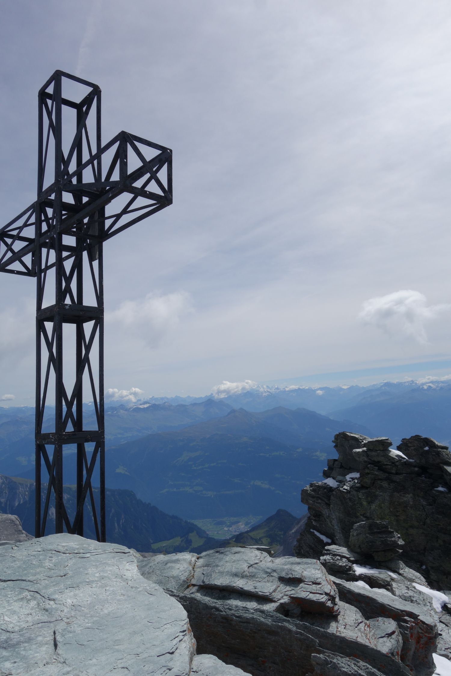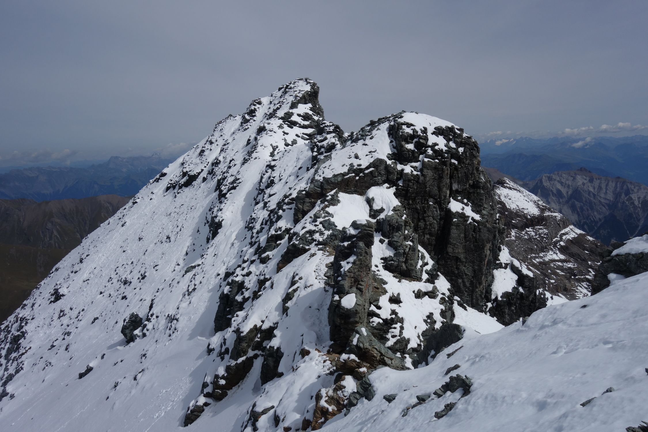 Fels weitestgehend trocken, in den Traversen guter Trittschnee, nur für die letzten paar Meter hinterm Gipfeltum haben wir die Steigeisen montiert. Die exponierte 3er Stelle ist mit zahlreichen Bohrhaken fast schon zu gut abgesichert, das Stahlseil wurde entfernt. Am Gipfel um ca. 13:00, leichter Wind und fantastische Aussicht.