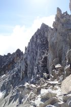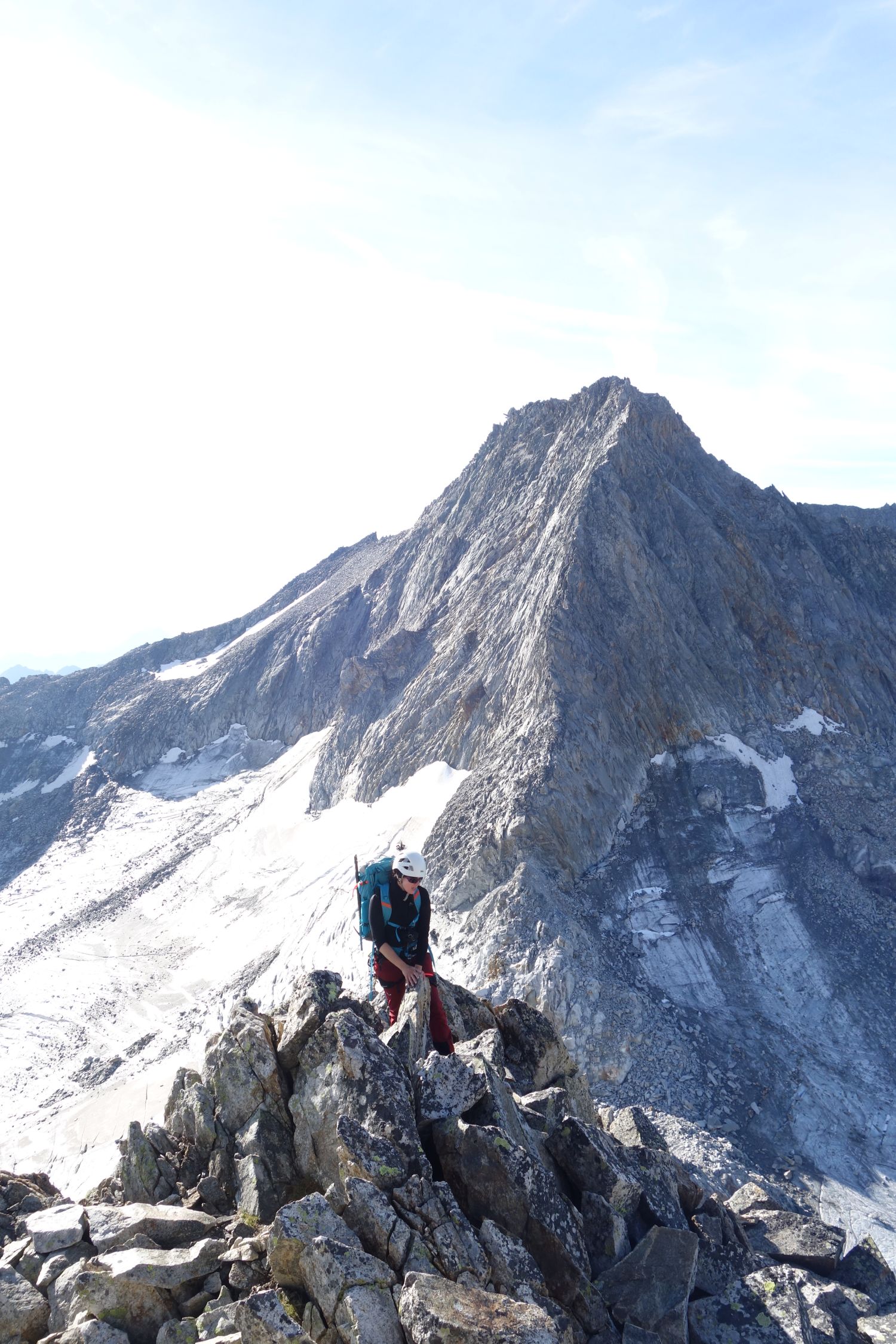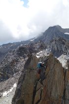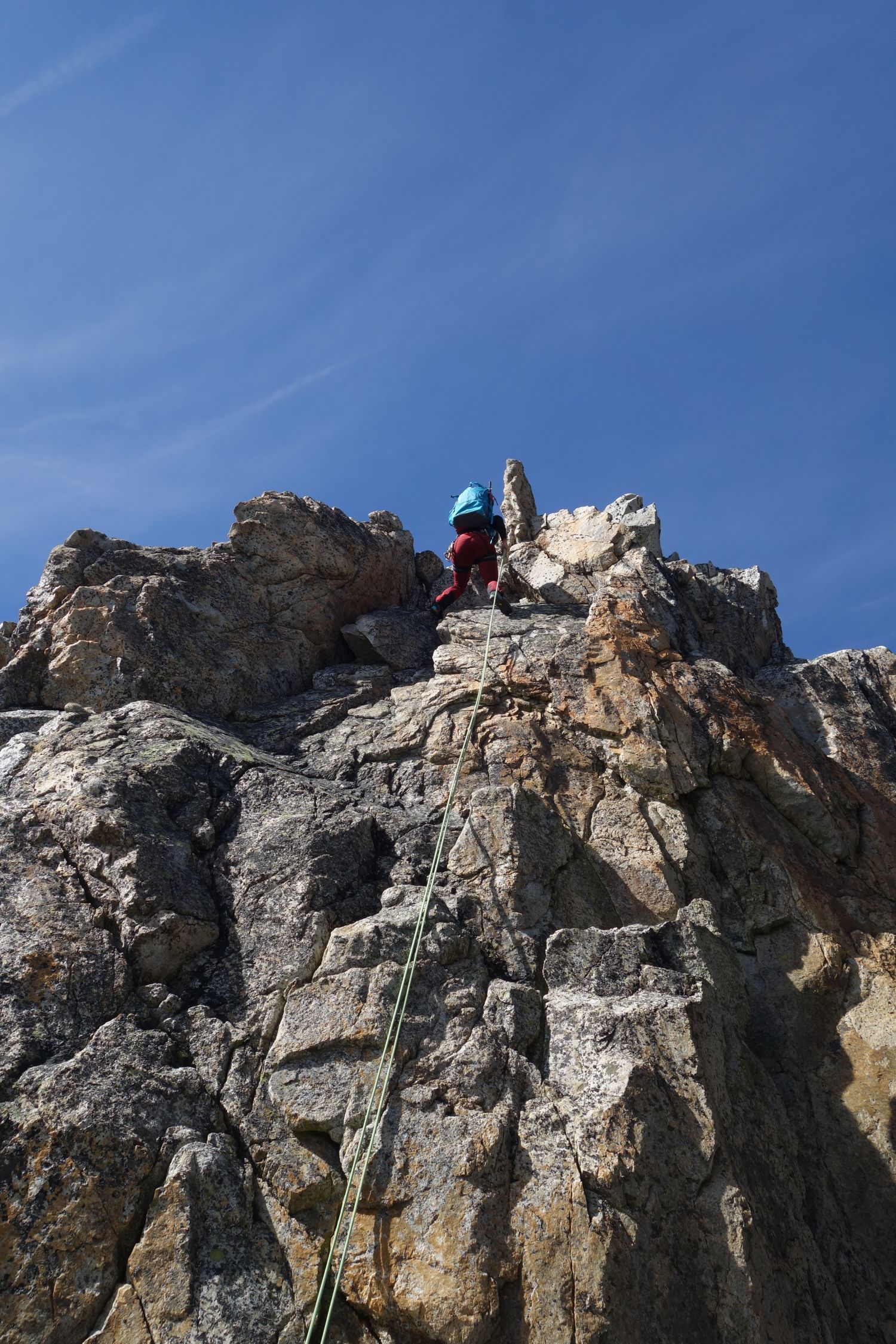 Start um 5:30 vom Oberstafel um ca. 8:00 am Witenwasserenpass. Unschwierig sind wir die ersten Aufschwünge seilfrei geklettert, bis das Gelände den I-II Grat erreicht, kurz darauf folgt ein Turm, III und wieder 15m abseilen. Spätestens dann fragt man sich ob die Tour noch WS+ ist =) wie im einschlägigen Führer beschrieben ist.