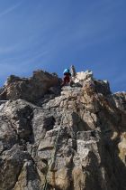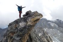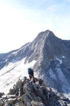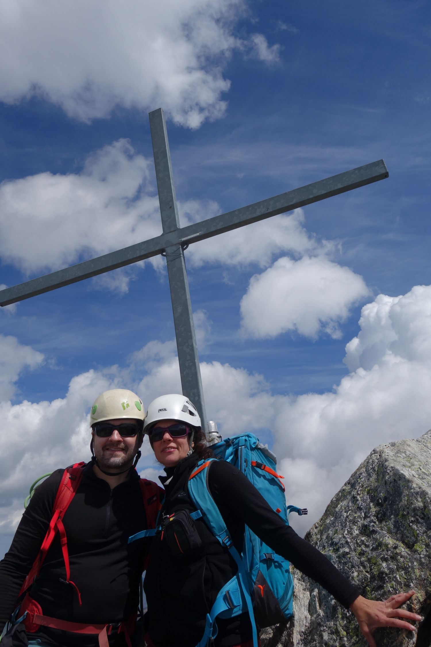 Am Gross Leckihorn Aufschwung angekommen wartet schöne Kletterei ca. 30m III mit neuen Bohrhaken. Anschleissend folgt schöne Gratkletterei, etwas ausgesetzt. Am ca. 12:45 am Gipfel vom Gross Leckihorn, Kreuz ist ca. 5m Unterhalb.