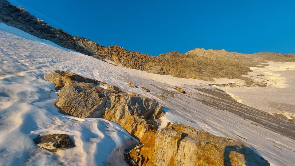 Der Gletscher ist weitestgehend aper, der Bergschrund immer noch geschlossen. Auf dem Grat liegt kein Schnee lediglich noch bisschen in den Flanken. Abstieg über Westgrat ebenfalls schneefrei. Bedingungen könnten kaum besser sein.