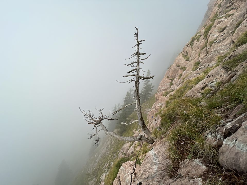 Der Nebel war hartnäckiger als angenommen, daher auch einige Stellen noch nass. Bei diesen Verhältnissen grundsätzlich nicht zu empfehlen, da die Tour so heikler ist. Allgemein ist diese Route nur sehr erfahrenen und trittsicheren Tourengängern zu empfehlen, welche sich im T5 Bereich wohl fühlen. Der Schafweg ist ansonsten eine sehr lohnende und eindrückliche und auch ernst zu nehmende Bergtour am Grossen Mythen.