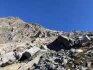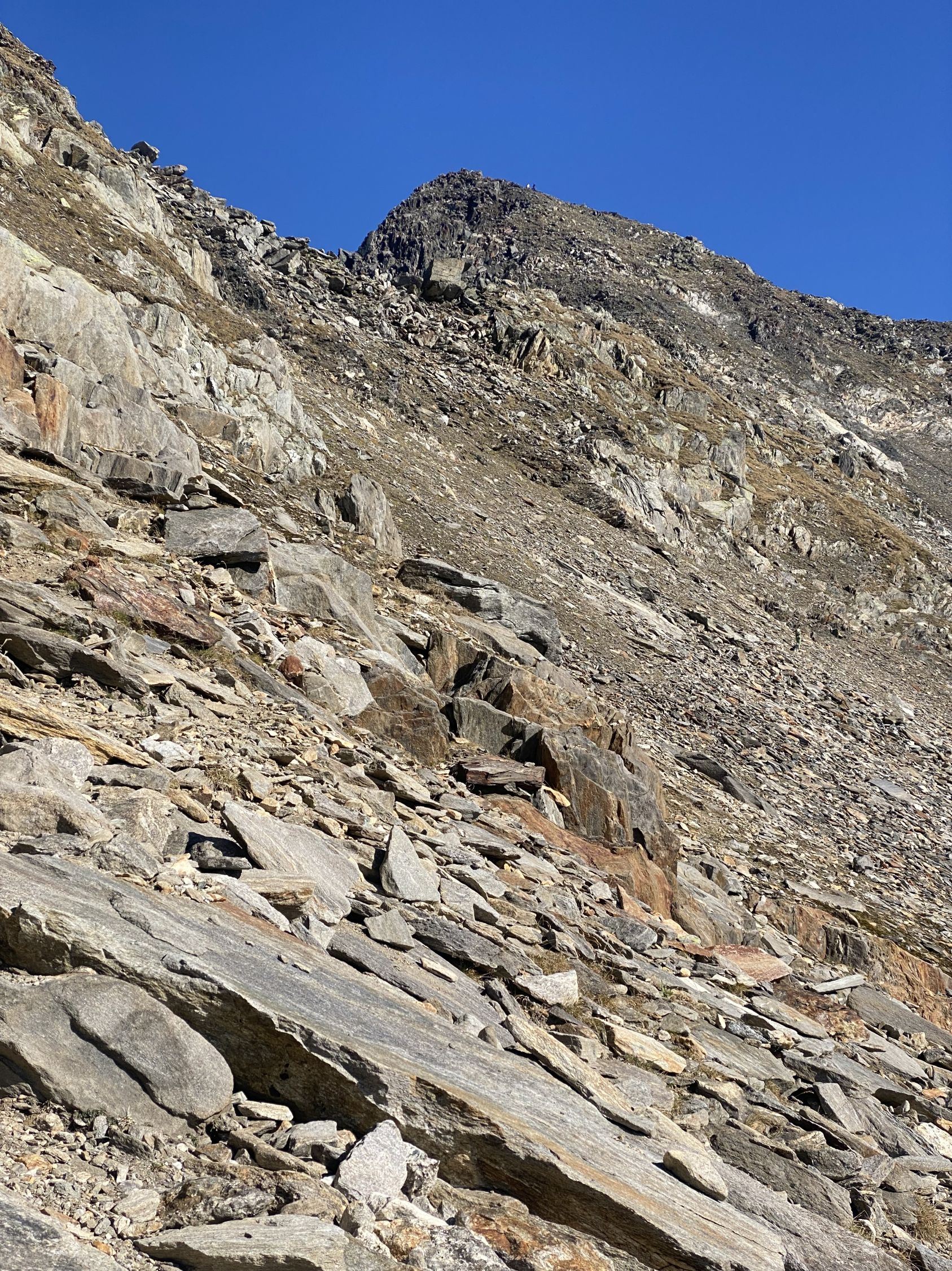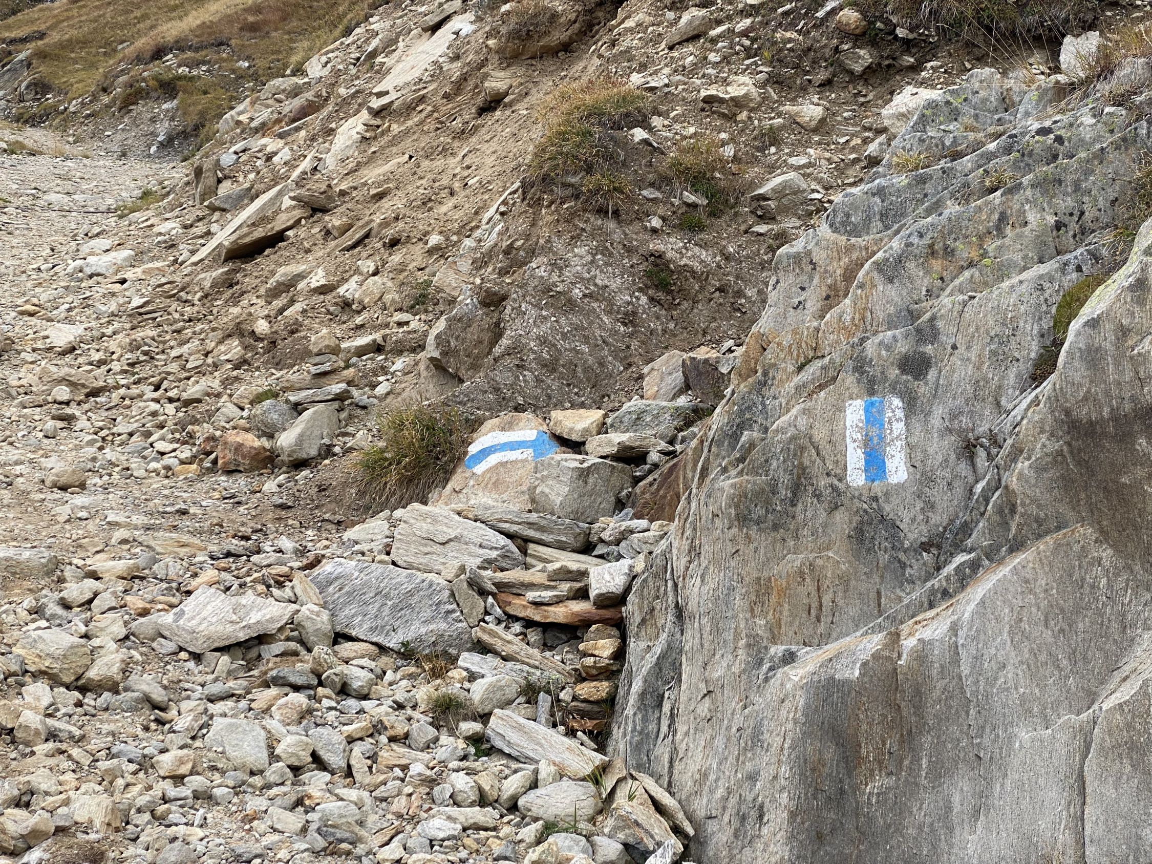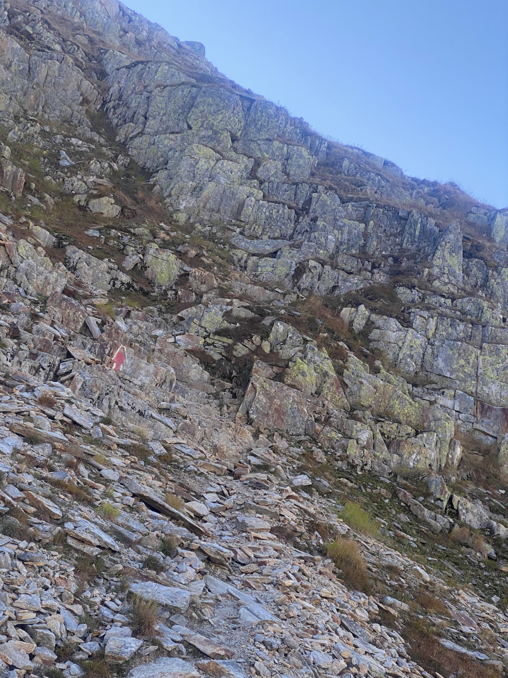 Wunderschöner Tag am Gotthard. Der Weg ist nur am Einstieg blau-weiss markiert, aber meistens gut zu erkennen. Man sieht ihm an, dass er nicht so oft benutzt wird. Nach dem Aufstieg durch das Felsband (durch grossen roten Pfeil markiert) weisen Steinmändlis den Weg.