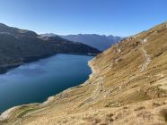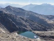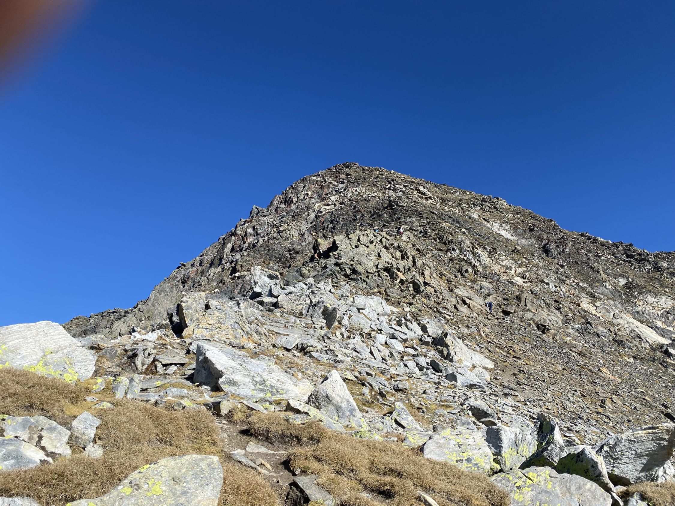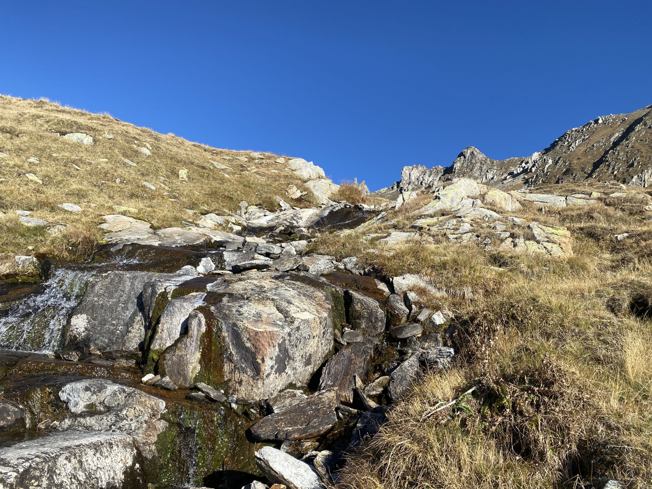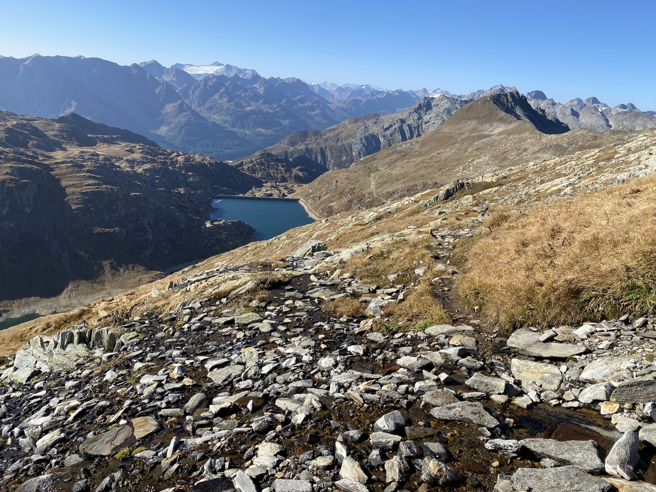 Wunderschöner Tag am Gotthard. Der Weg ist nur am Einstieg blau-weiss markiert, aber meistens gut zu erkennen. Man sieht ihm an, dass er nicht so oft benutzt wird. Nach dem Aufstieg durch das Felsband (durch grossen roten Pfeil markiert) weisen Steinmändlis den Weg.