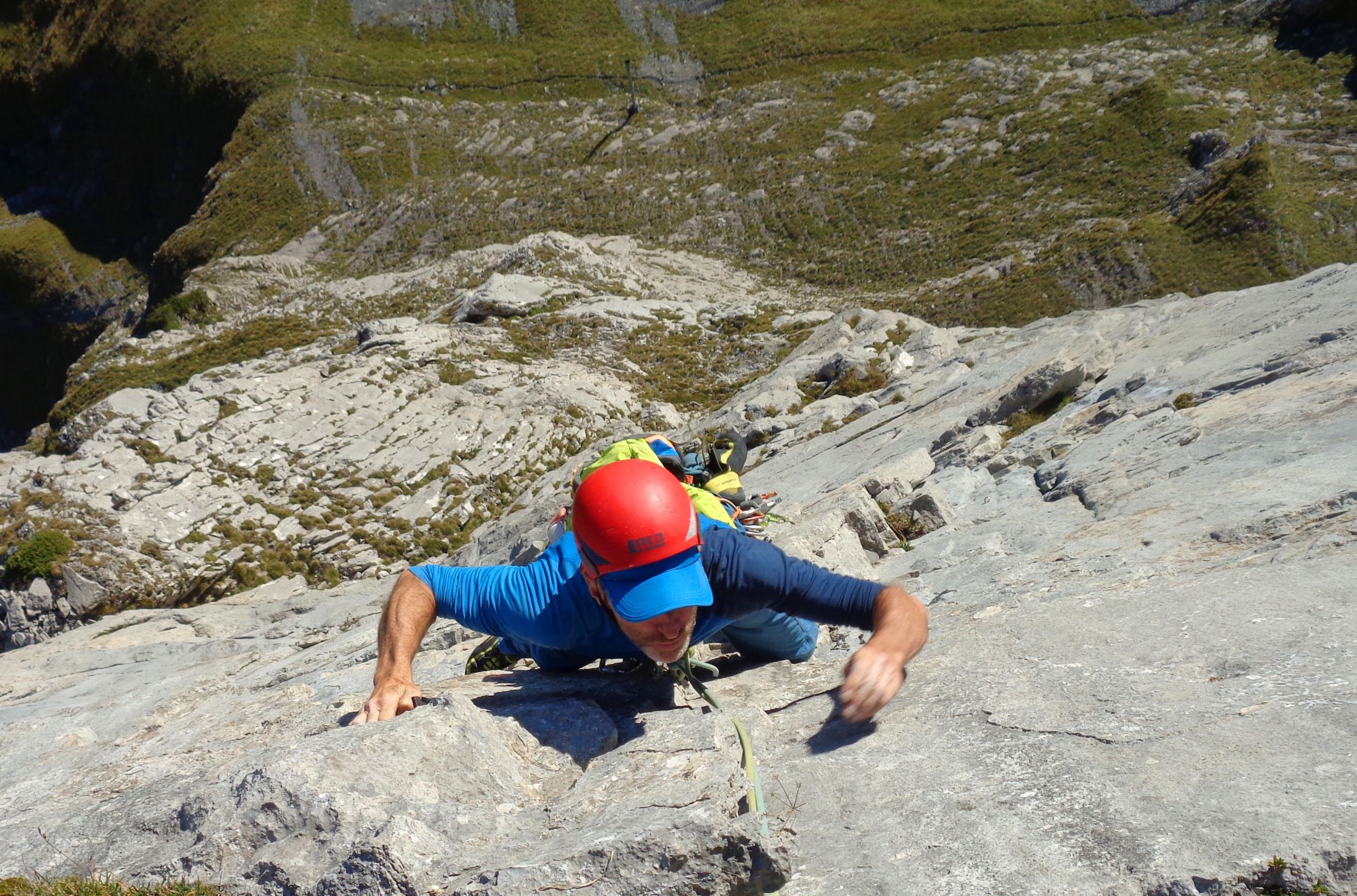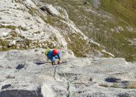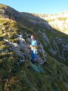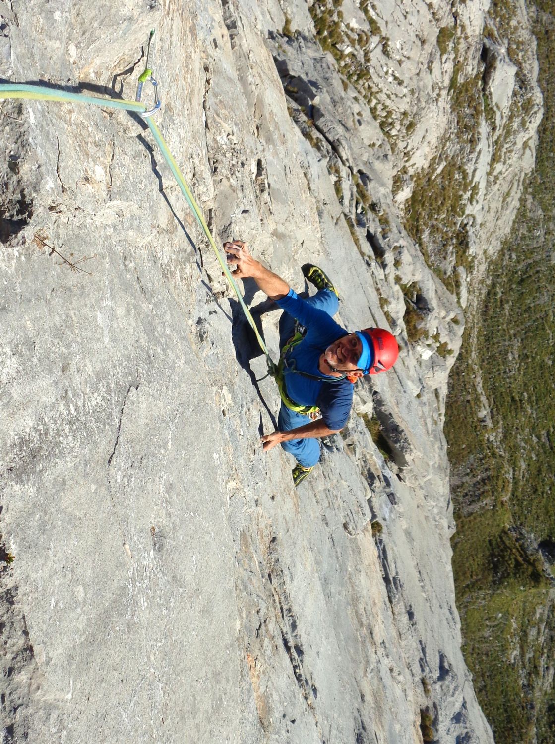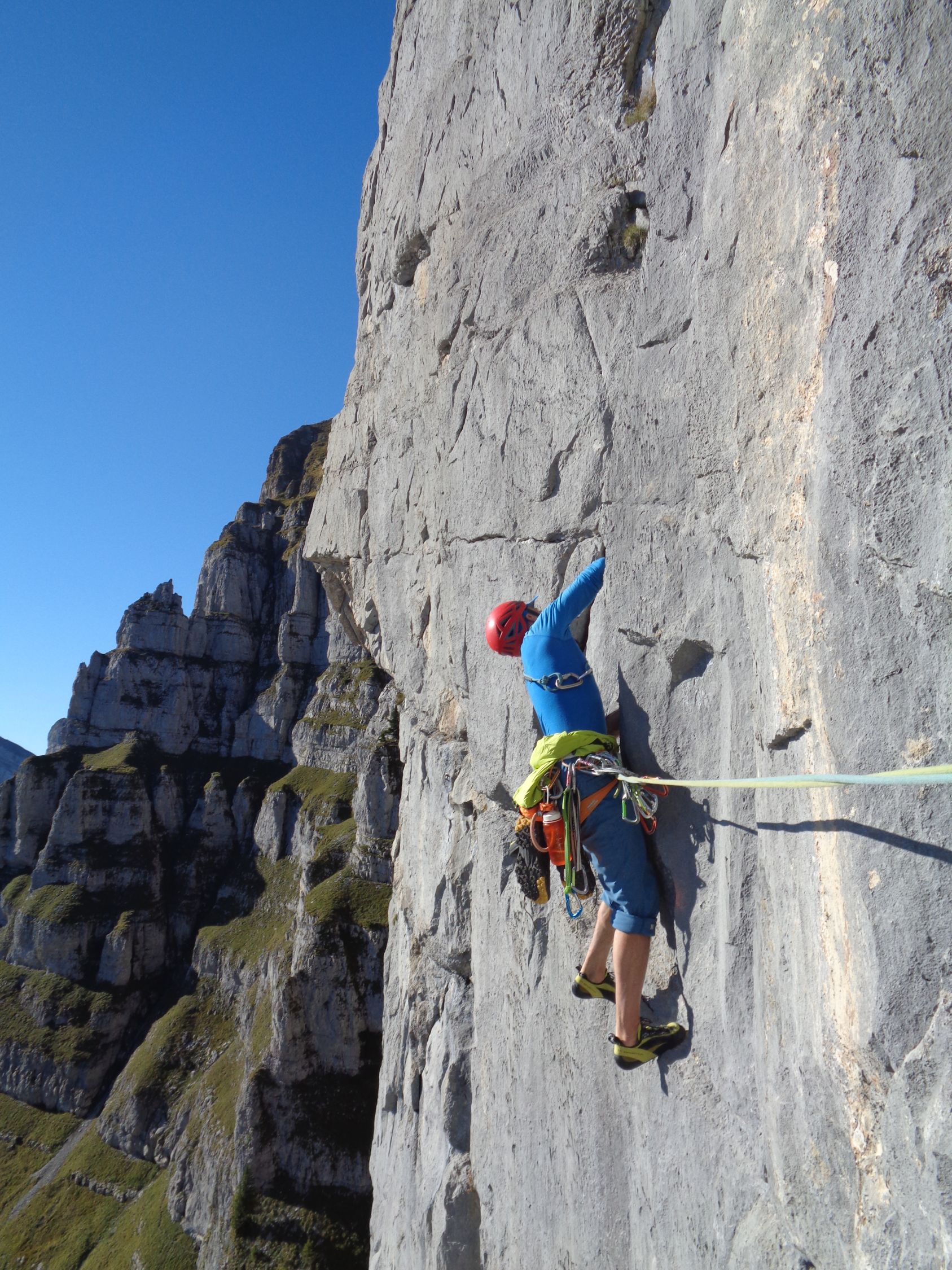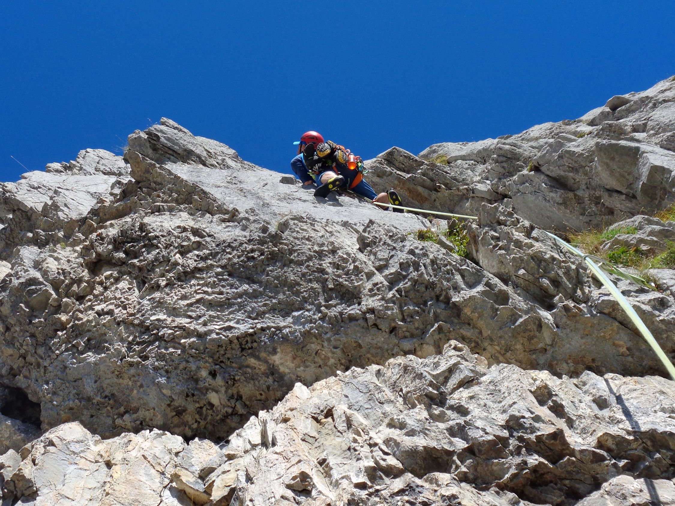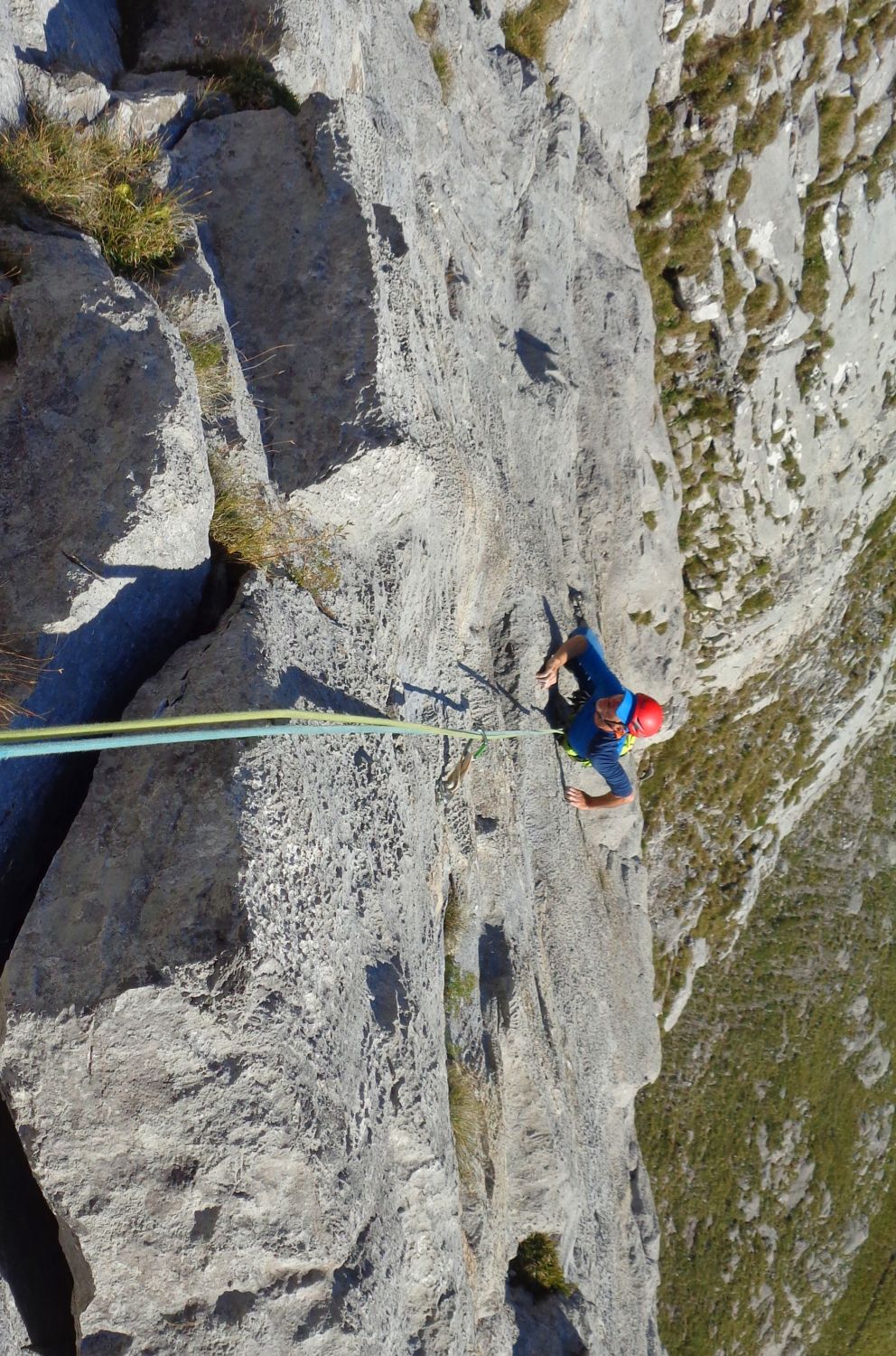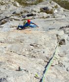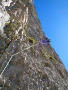 Felseindruck/Kletterei: etwas gemischt. Oben sicher 5 Sterne von 5. Unten erst mal gewöhnungsbedürftig. Mitte (SL3), echt interessant, sehr guter Fels, aber ganz schön athletisch. Die Route scheint recht selten begangen. Man sieht wenig Spuren. Schade für den tollen Fels oben, wo auch die Sicherung sehr gut ist. Die erste SL wäre einladender, wenn man da gleich ein paar Bh sehen würde...