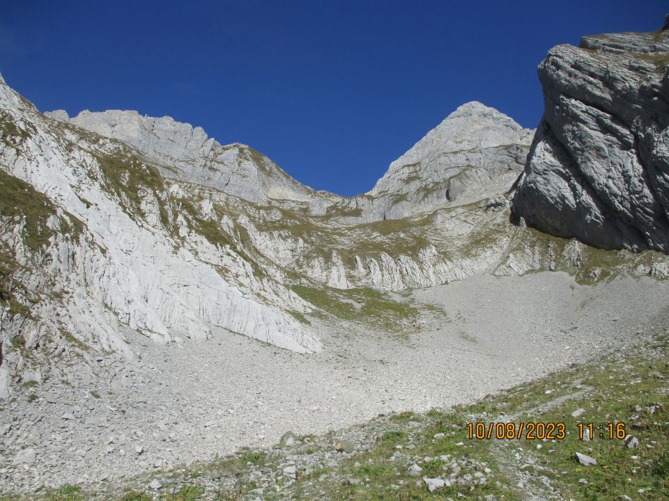 Erwartungsgemäß war ich allein in der Ostwandrinne. Diese habe ich heute zum ersten mal begangen, und ich war begeistert. Im Vergleich zum gestrigen Sänits-Ostgrat deutlich spannender. Leichte, anregende Kletterei in hervorragender Felsqualität. Schrattenkalk mit Wasserrillen wie am Brüggler oder am Mattstock, nur eben einfacher zum Klettern.