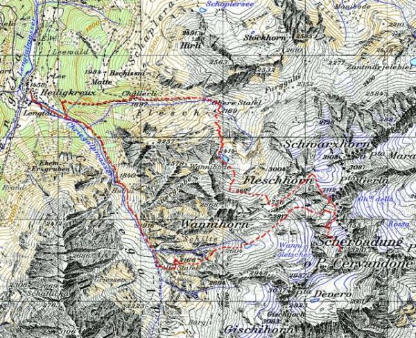 Heiligkreuz/Binntal (1458m)-Ob.Stafel-Fleschsee (2414m)-Halbelfjoch-P.3112-P.Cervandone (3210m)-Wannisee-Chriegalptal-Heiligkreuz