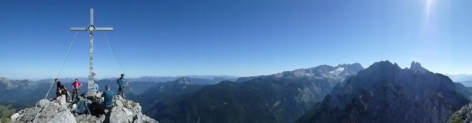 Vom Gipfel erblickt man im Süden den Hohen Dachstein, Links davon die nähere Bischofsmütze. Im Westen präsentiert sich das Tennengebirge. Die Quelle im Zustiegsweg zur Gablonzer Hütte ist im Sommer fast ausgetrocknet. Ansonsten gibt es nirgendwo Wasser. Also ausreichend Getränke mitführen. Einkehrmöglichkeit bei der Gablonzer Hütte, oder in der Stuhlalm, wenn diese geöffnet sind.