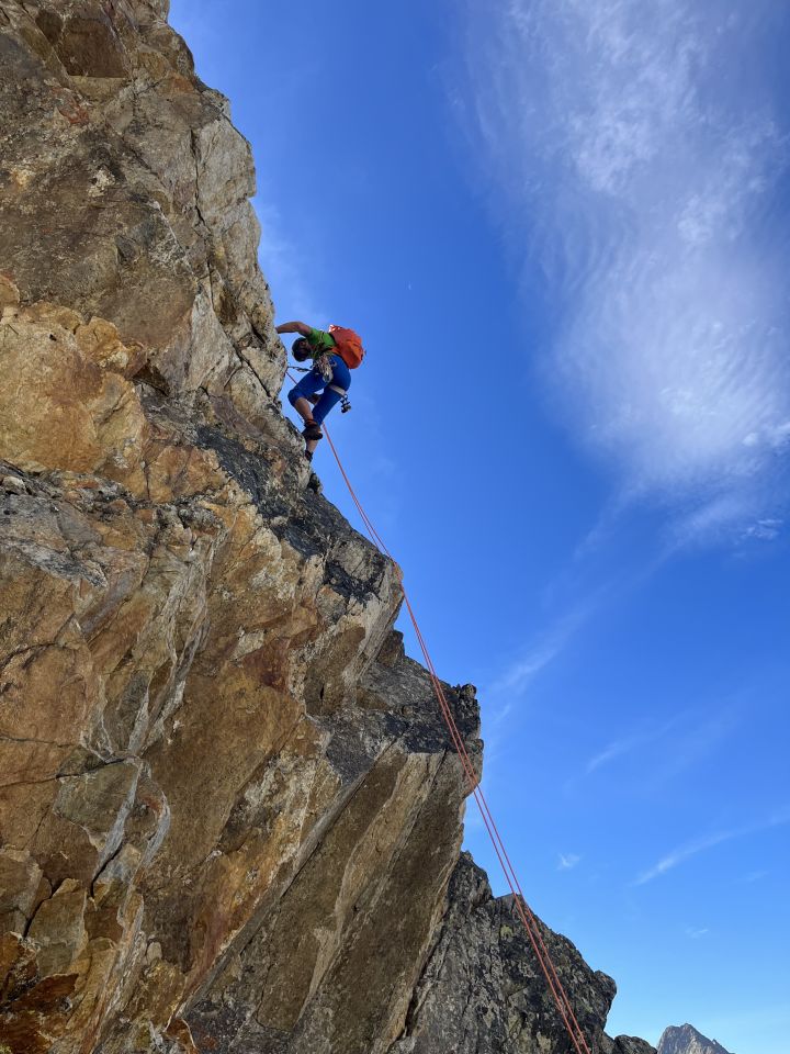 Trockener, griffiger Fels. Abseilstelle mit Bandschlingen und Reepschnüre eingerichtet. Platte mit Bohrhaken übersehen. Route ist auch so gut machbar. Gipfelgrat sehr ausgesetzt aber super zum Klettern.
