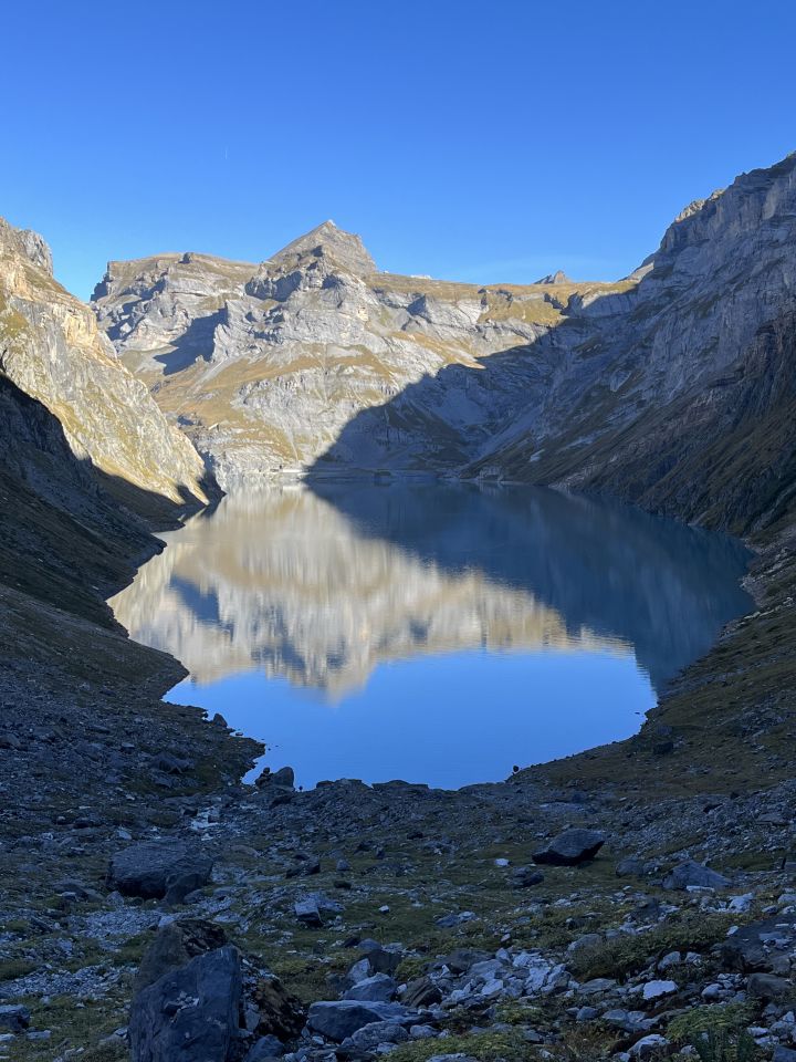 Kein Schnee. Gletscher stark schuttbedeckt und gut begehbar (auch ohne Steigeisen / Pickel). Je nach Gusto bleibt man nur sehr kurz auf dem Gletscher und steigt mehr über Platten und Schutt auf. Fantastische Tiefblicke vom Gipfel. Ziemlich wenig Betrieb, auch um den Muttsee herum recht ruhig.