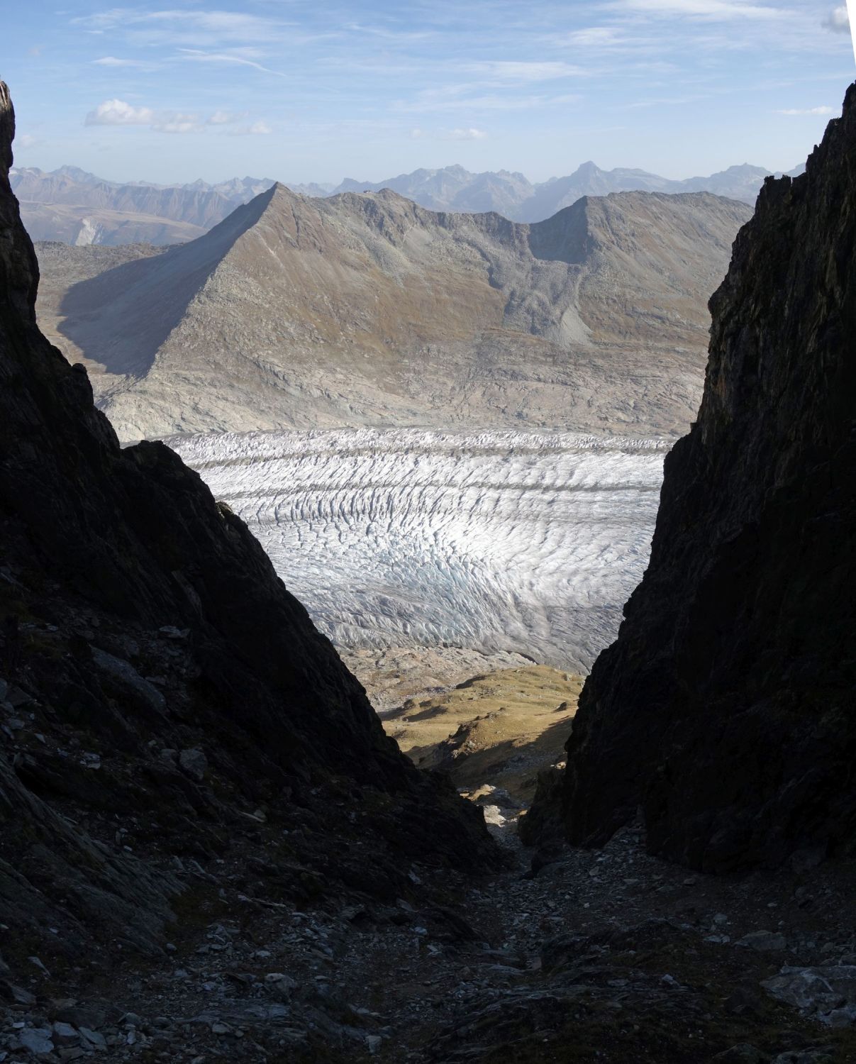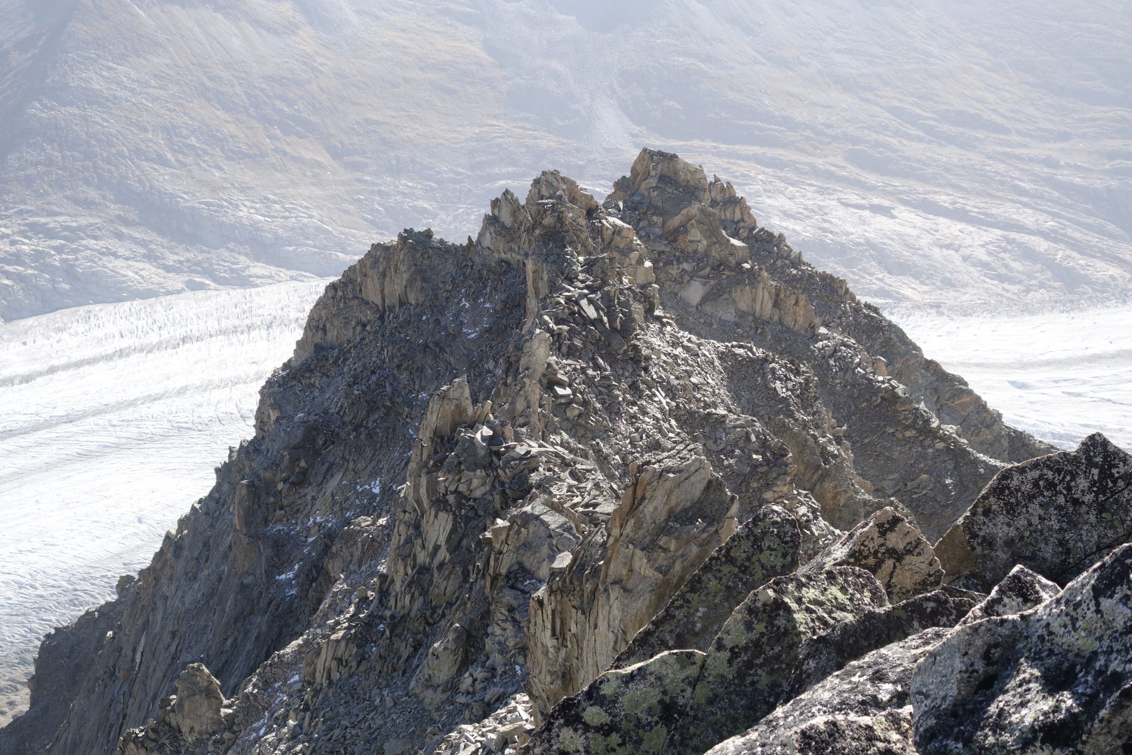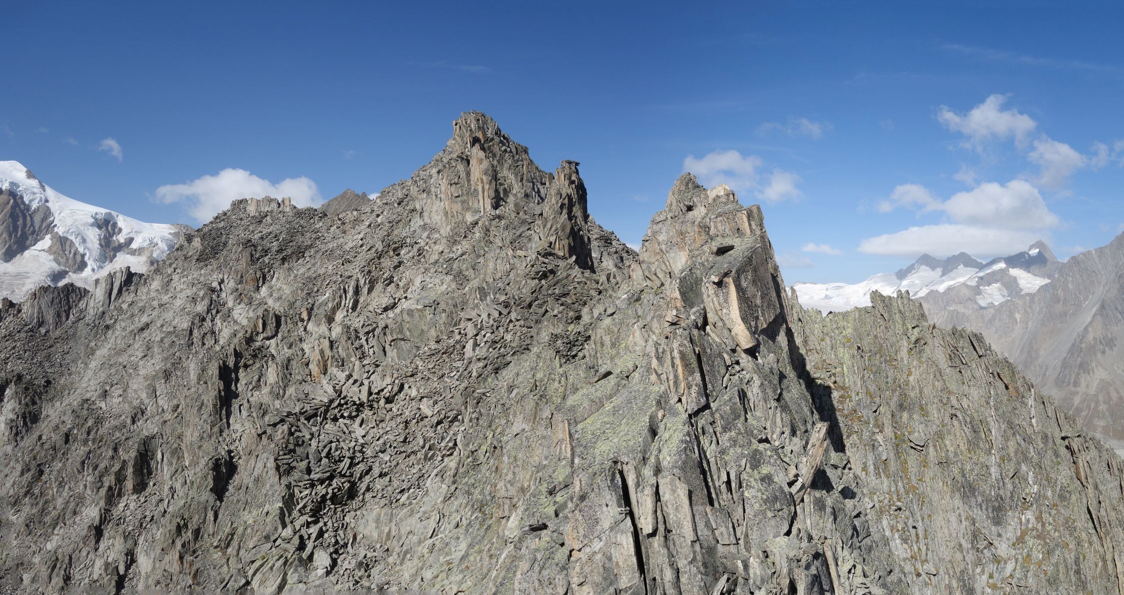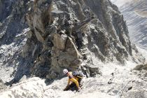 Nachdem die (vermutliche) Erstbegehung des NW-Grates flott lief, haben wir uns entschieden, den ebenfalls sehr selten begangenen Südgrat im Abstieg zu begehen (evtl. erste Begehung im Abstieg?). Dabei erschien es uns schneller durch das grosse Couloir der Olme vom Grat abzusteigen, anstatt den untersten Teil des Südgrates, zwischen P. 2725 und dem Beginn des Couloirs (~3000m), zu begehen.
