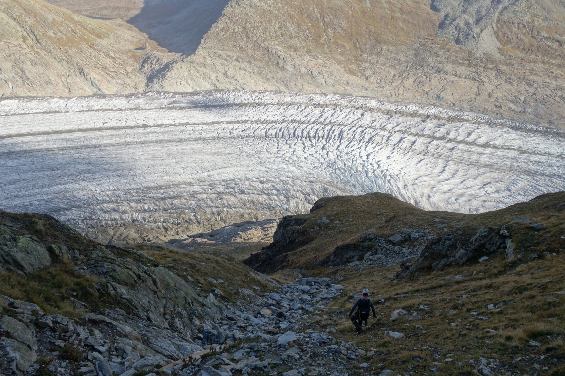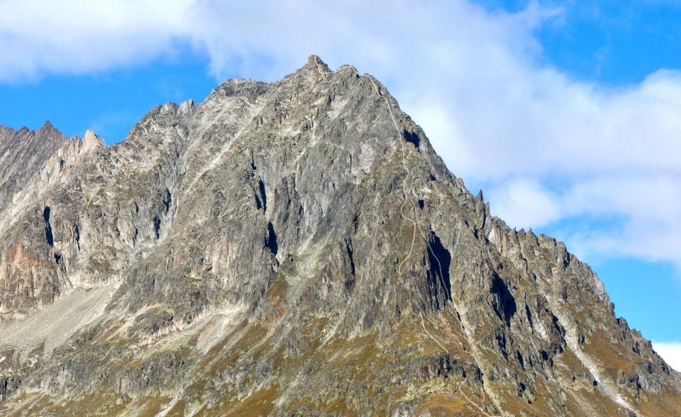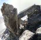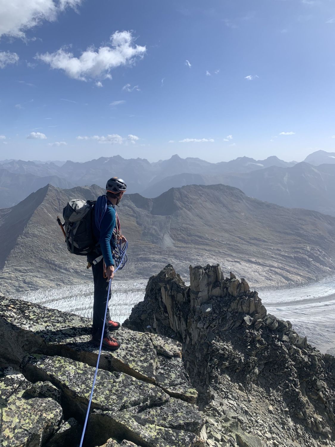 Nachdem die (vermutliche) Erstbegehung des NW-Grates flott lief, haben wir uns entschieden, den ebenfalls sehr selten begangenen Südgrat im Abstieg zu begehen (evtl. erste Begehung im Abstieg?). Dabei erschien es uns schneller durch das grosse Couloir der Olme vom Grat abzusteigen, anstatt den untersten Teil des Südgrates, zwischen P. 2725 und dem Beginn des Couloirs (~3000m), zu begehen.