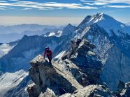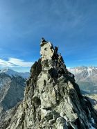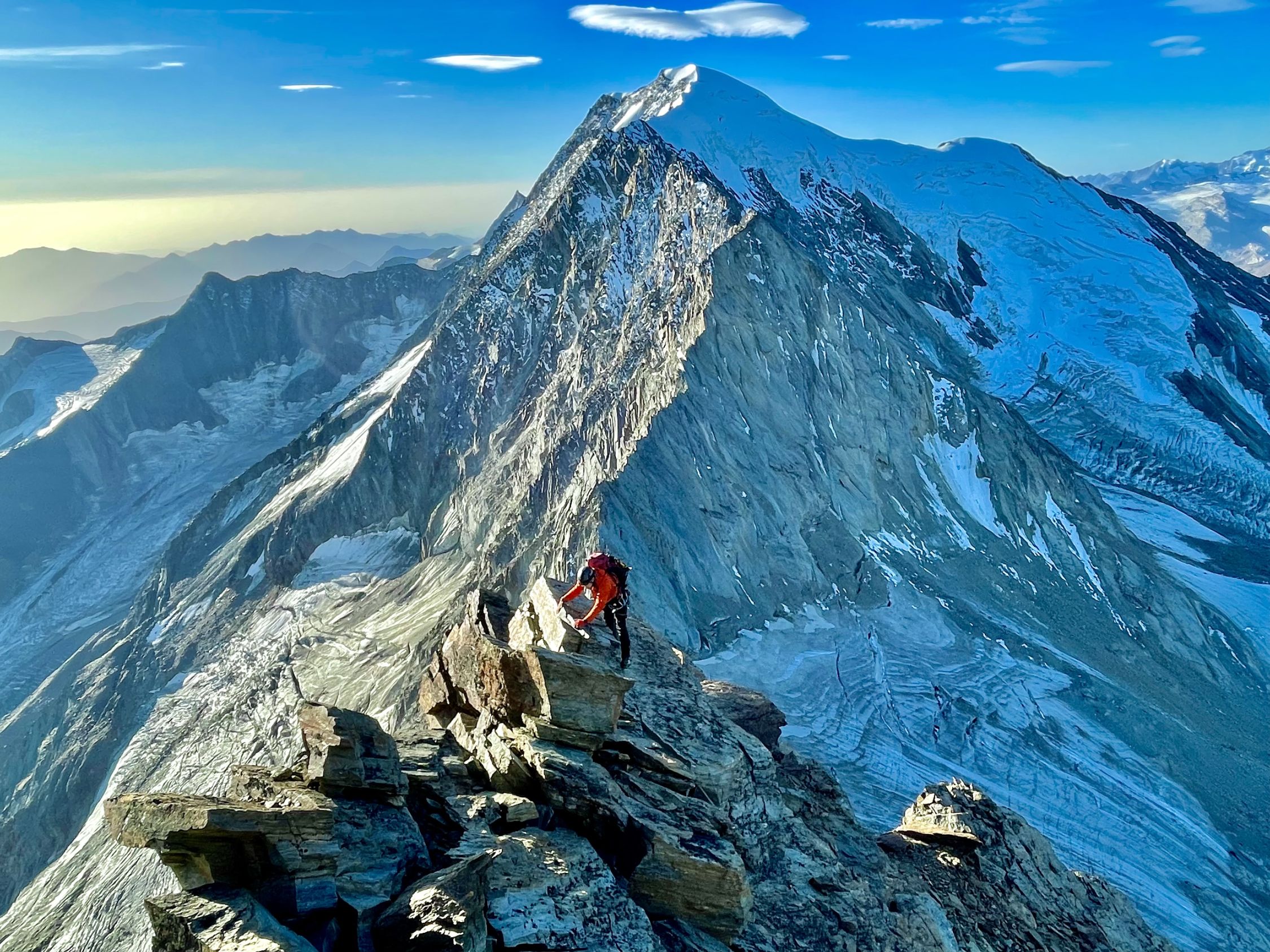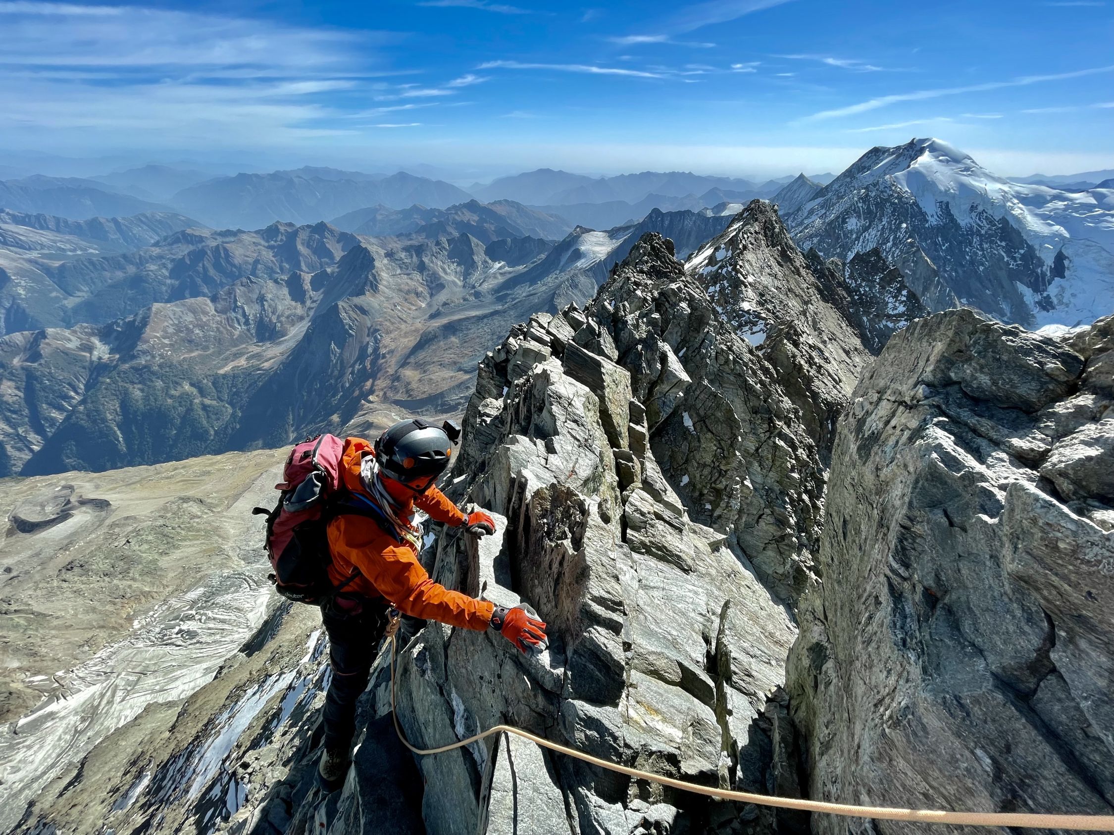 Der Südgrat selbst ist lang, die Orientierung aber immer klar und der Fels überraschend fest. Wir sind bis zum ersten markanten Aufschwung frei geklettert, dann am laufenden Seil. Mit 6-7 Bandschlingen kommt man gut zurecht, Keile und Friends sind sicher nützlich, aber nicht notwendig. Der Weg ist im Vergleich zu anderen 4000ern weitestgehend frei von Bohrhaken. Wir konnten die meisten Abseilstellen gut abklettern, am letzten Gendarm (2c-Stelle) haben wir uns dann aber doch abgeseilt. (30m Seil reicht ganz genau). Ganz oben auf dem Gendarm gibt es eine Abseilöse. Achtung: ostseitig (!) abseilen, bis man nach ca. 12m ein schmales Band erreicht, über welches man nach 2-3m einen Schlingenstand erreicht.