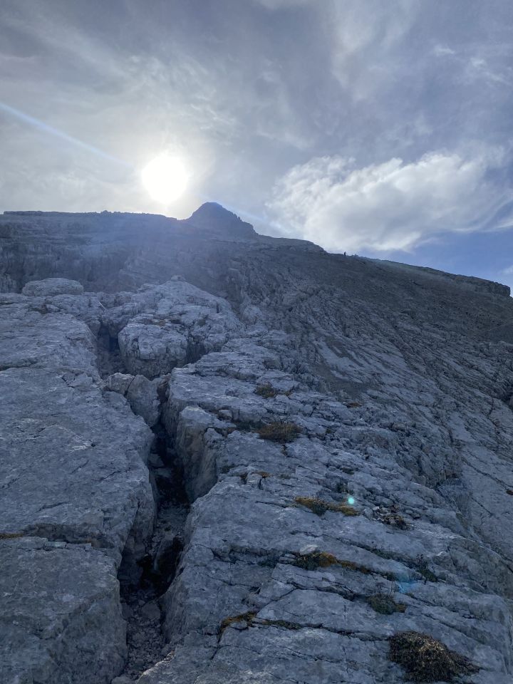 Die obere Laste ist steiler, dort hält man sich am besten an die „speckigen“ Bereiche, wo durch viele Begehungen kein Schutt aufliegt. Im Abstieg mühsamer, Schuhe mit guter Sohlenhaftung sind empfehlenswert. Vor einem recht ausgesetzten Stück nahe der Kante gibts einen Bohrhaken zum abseilen und paar Meter tiefer hängt ein dünnes Fixseil (mit Reepschnur verlängert).