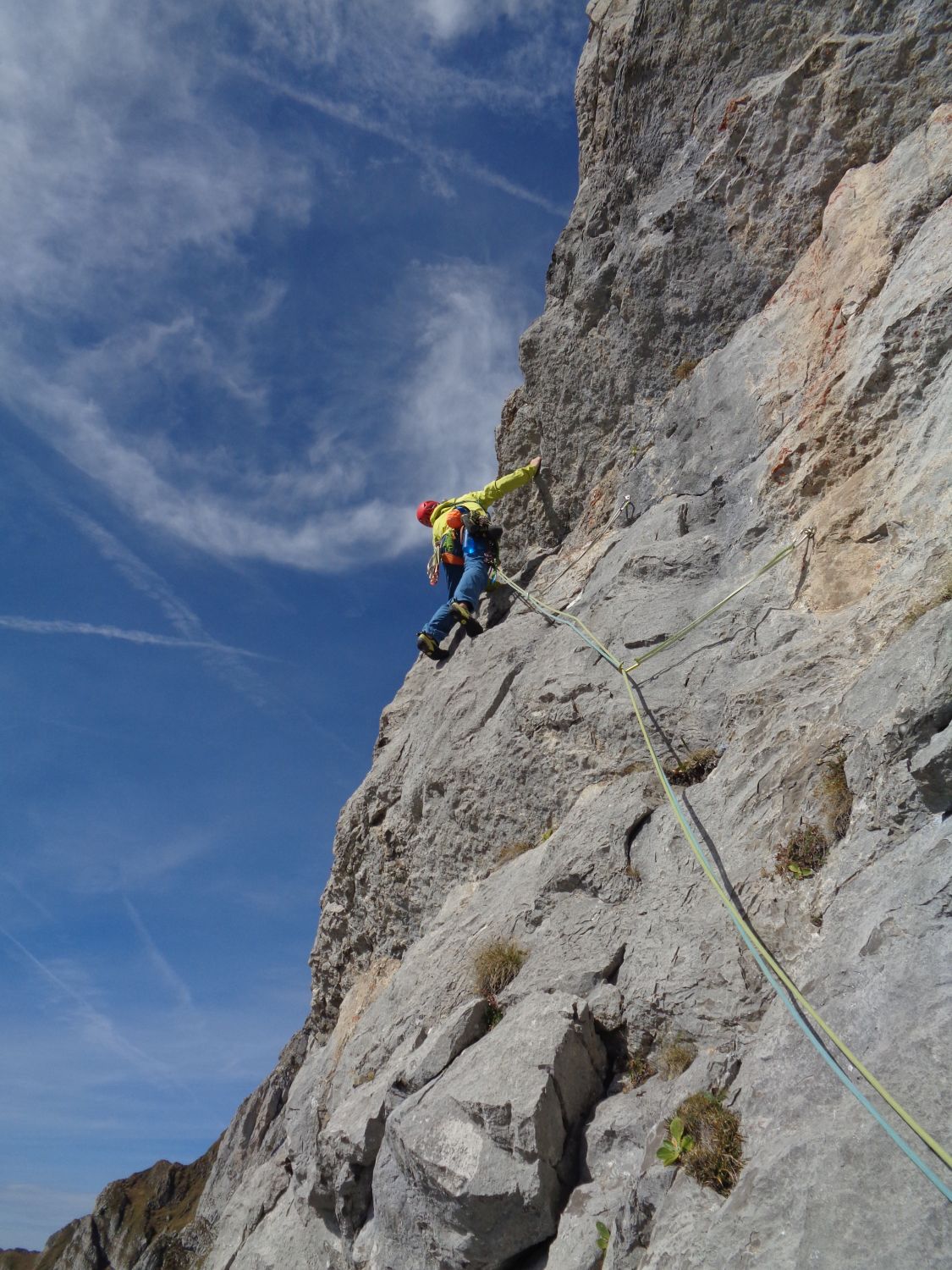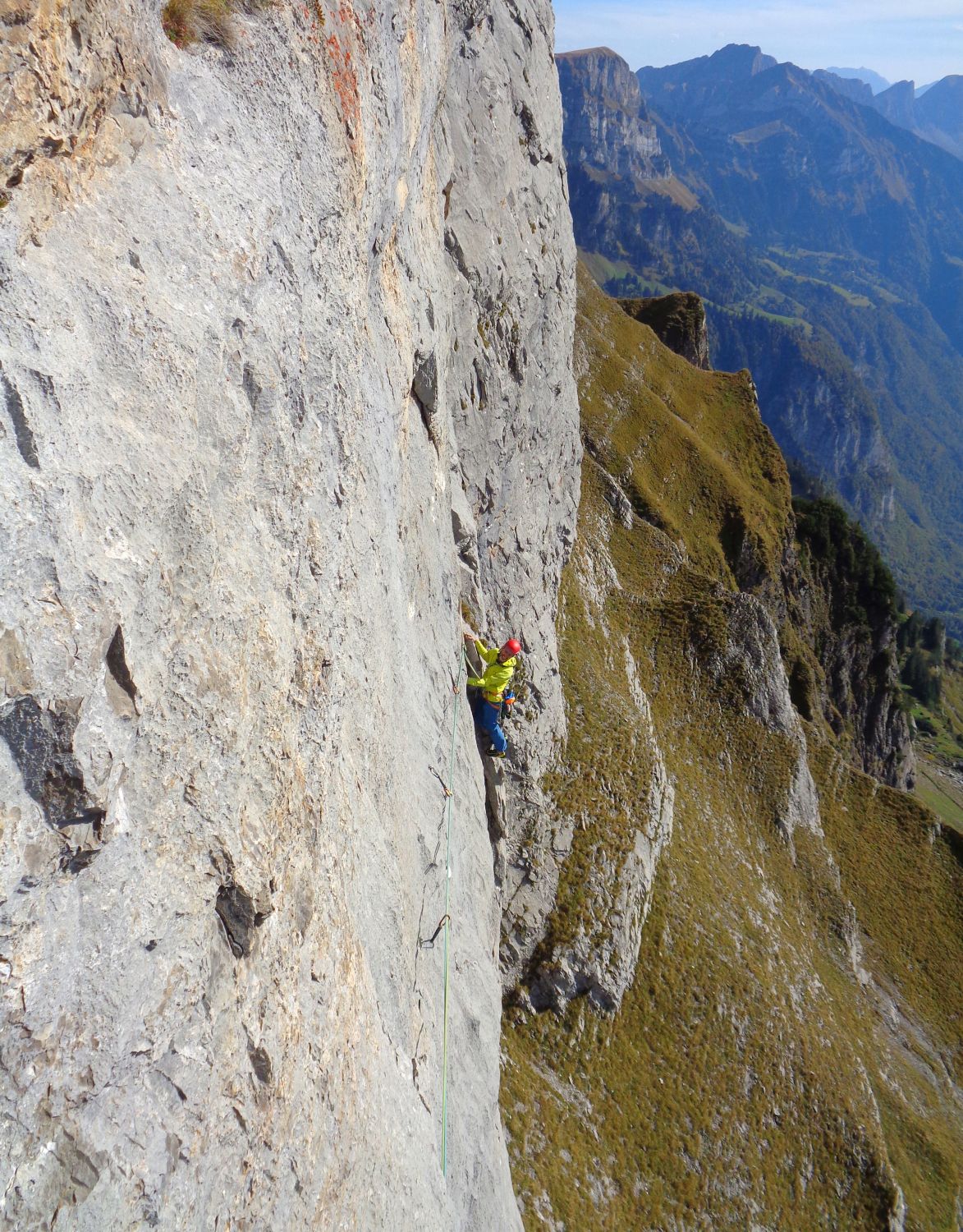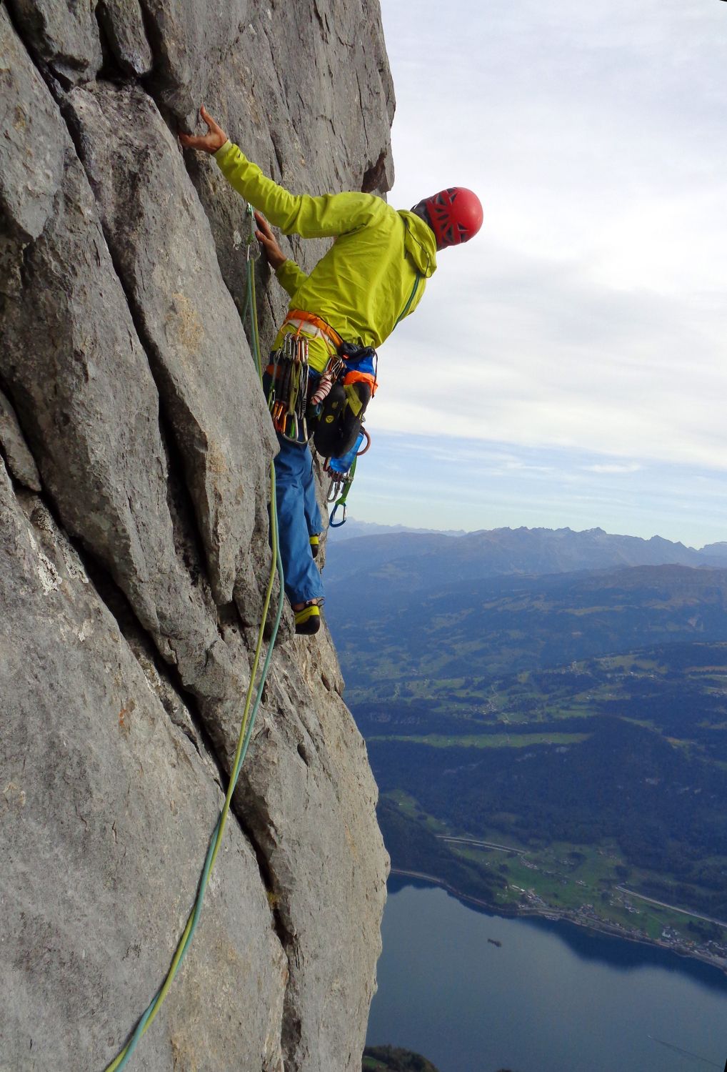 Siehe Routenbeschreibung: vermutlich die best-gesicherte Route im Churfirsten-Gebiet (neben Liechtblick). Es wäre schön, wenn es mehr davon gäbe. So lässt sich das Klettern voll genießen, auch wenn es ein paar lose Blöcke gibt. Insgesamt sehr guter Fels und extrem interessante Kletterstellen, vor allem die beiden unterschiedlichen Quergänge (unten plattig, oben athletisch)