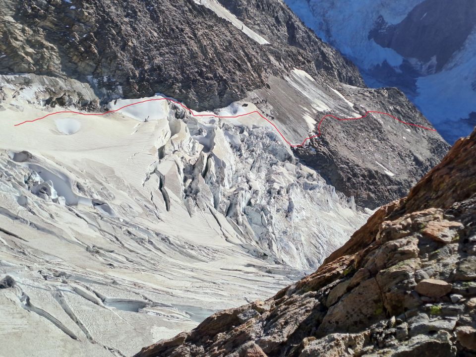 Während der Fels perfekt schneefrei war, ist die Gletscherquerung im Moment nicht ganz trivial. Die Querung nach dem Gaag sollte unbedingt auf den Felsen links unterhalb umgangen werden. Das geht tiptop. Danach muss man ca. 60 Meter gerade hinauf über Blankeis, dafür Eisschrauben mitnehmen. Der restliche Weg über den Gletscher ist noch einmal etwas heikel, sonst aber problemlos. s. dazu die angehängten Fotos mit dem Routenverlauf und einem Eindruck von der Blankeisflanke.