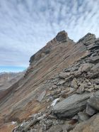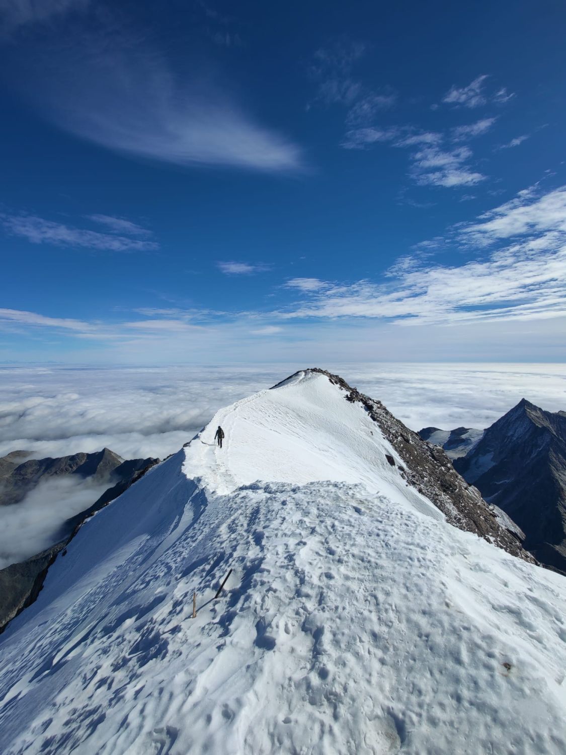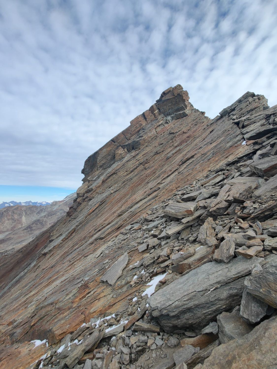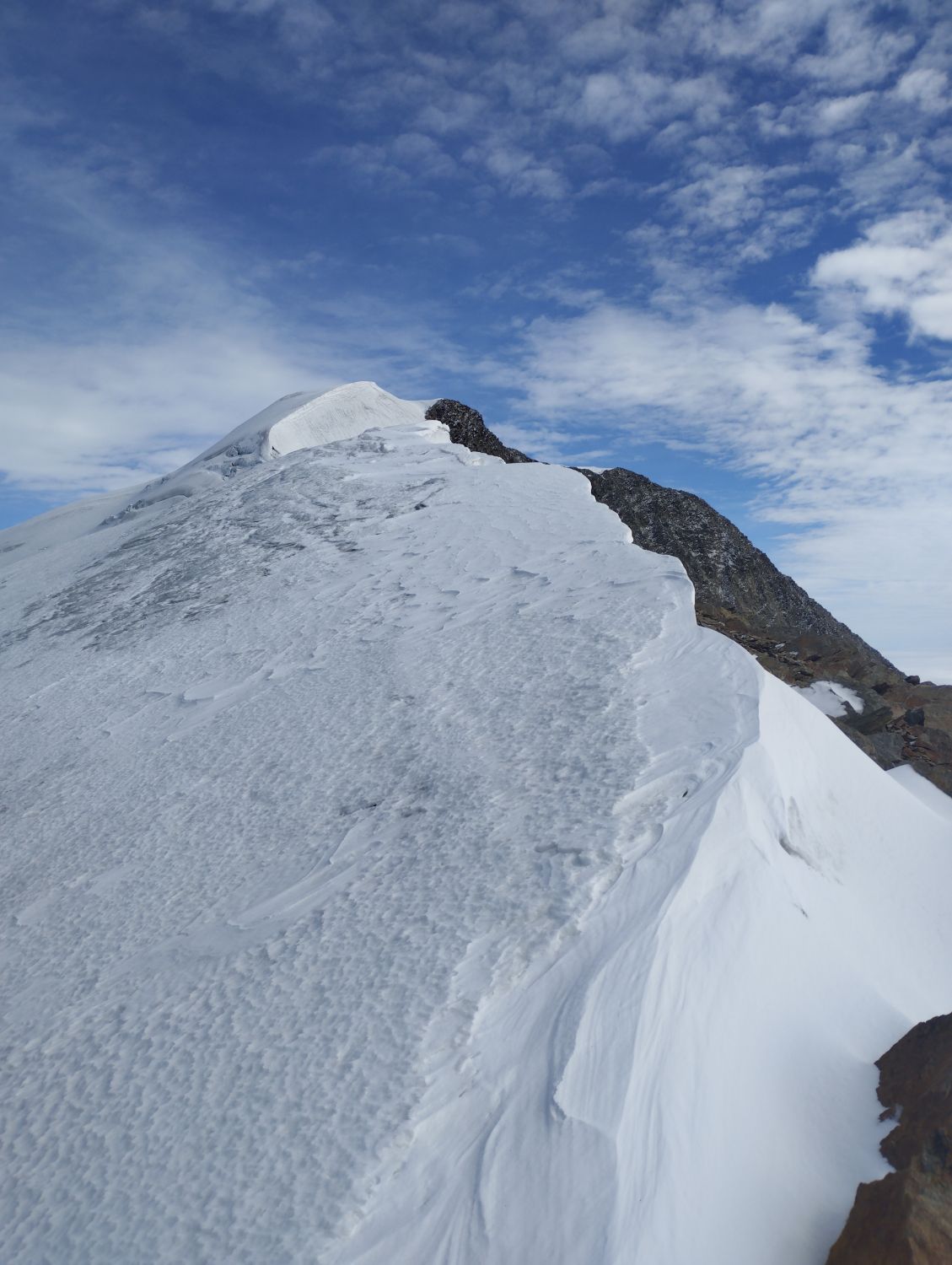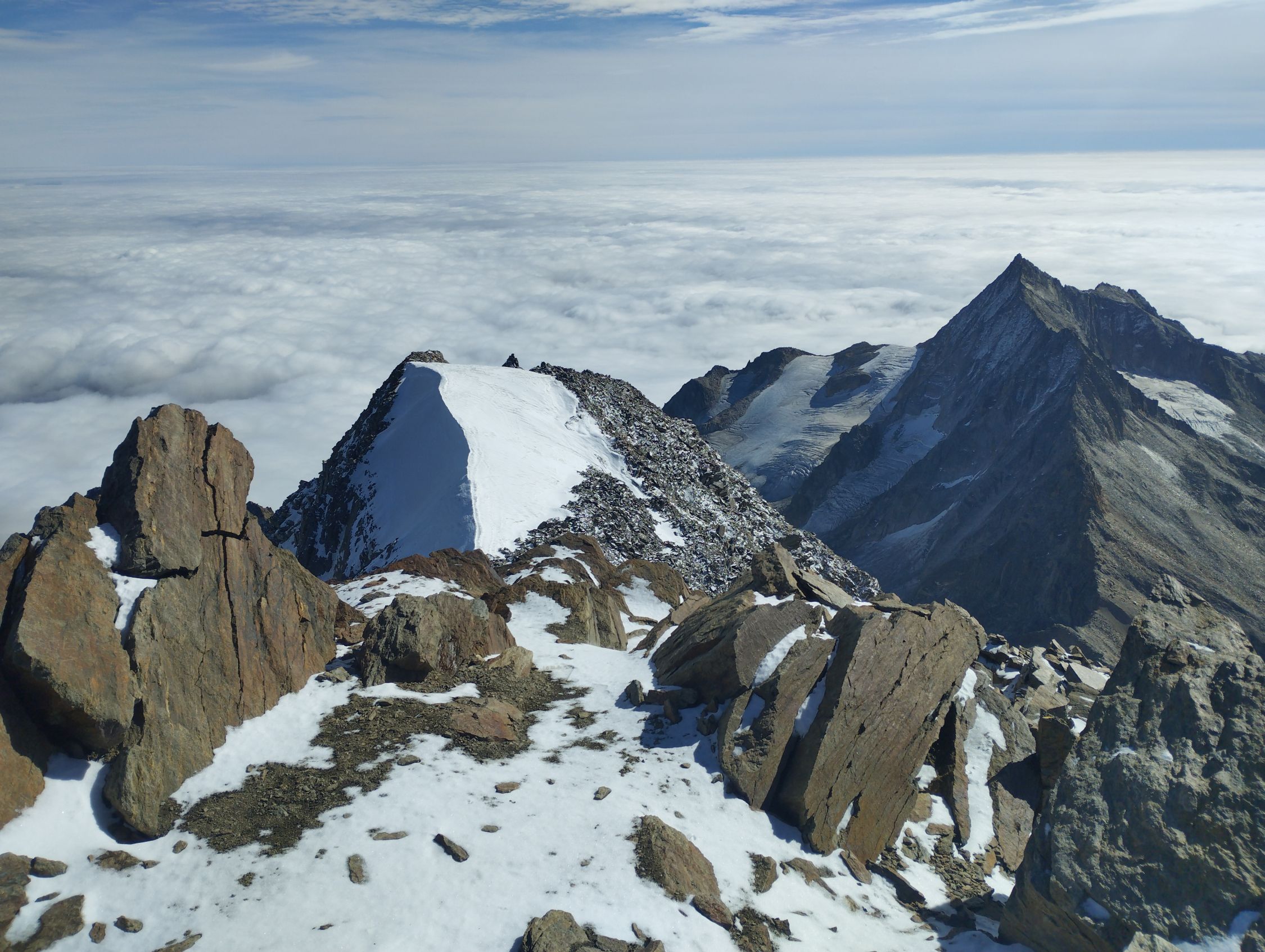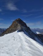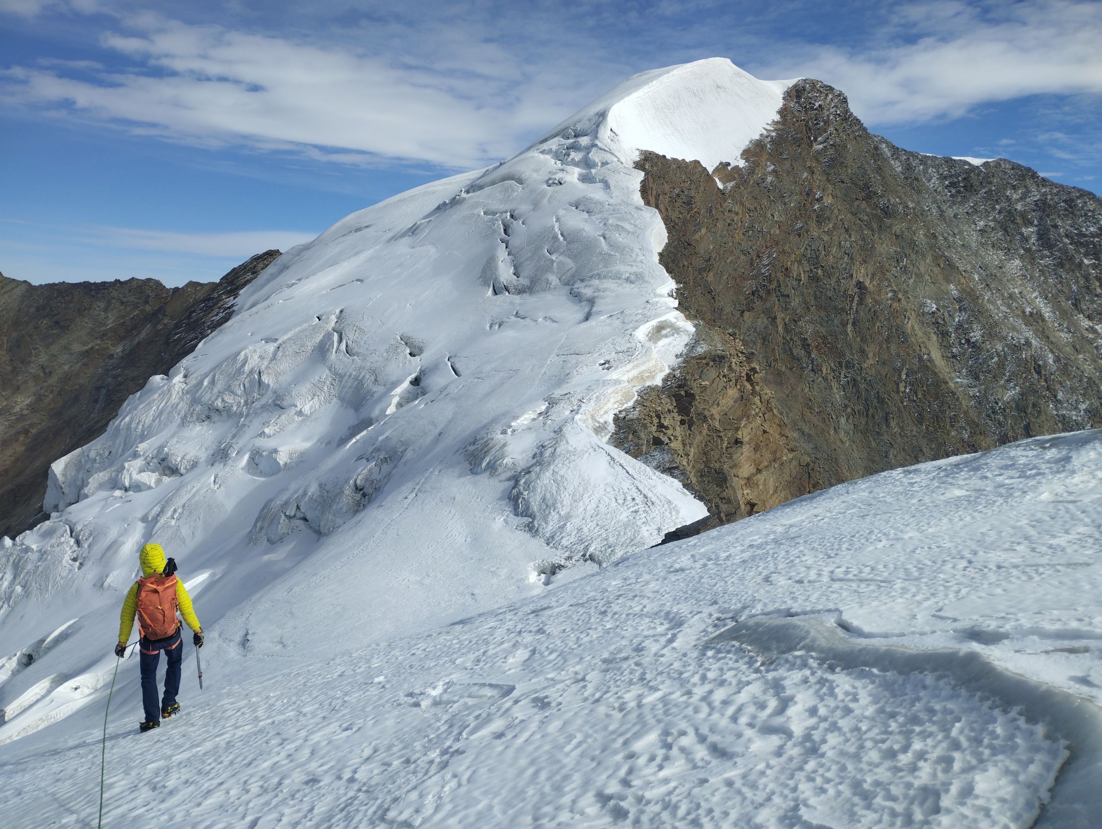 Kühle Temperaturen unter 0 °C aber top Verhältnisse auf der gesamten Überschreitung. Trotz unsicherer Wetterprognose war es, abgesehen von ein paar Schleierwolken, sehr sonnig! Die Hütte ist seit einer Woche geschlossen. Somit war außer uns keine Menschenseele am Berg. Die Kletterei am Rotgrat ist trocken und Genuss pur! Wir seilten am Gletscher an und stiegen direkt über die steile Firnschneide. Aufgrund des Windes kaum mehr Spuren vorhanden. Der Firn war hart gefroren, somit Eisen und Pickel obligatorisch. Danach zügiger Abstieg über den Südgrat. Wir beobachteten einen Steinschlag im Abstieg, der etwa bei Pt. 3814 abging (siehe Bilder). Ansonsten war es ruhig. Unglaublich wie verlassen die Umgebung ist, wenn die Hütten geschlossen sind! Ein wahrer Traum! Gratuliere meinem Kollegen zu seinem ersten 4000er!