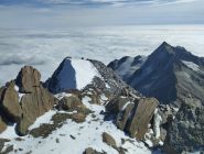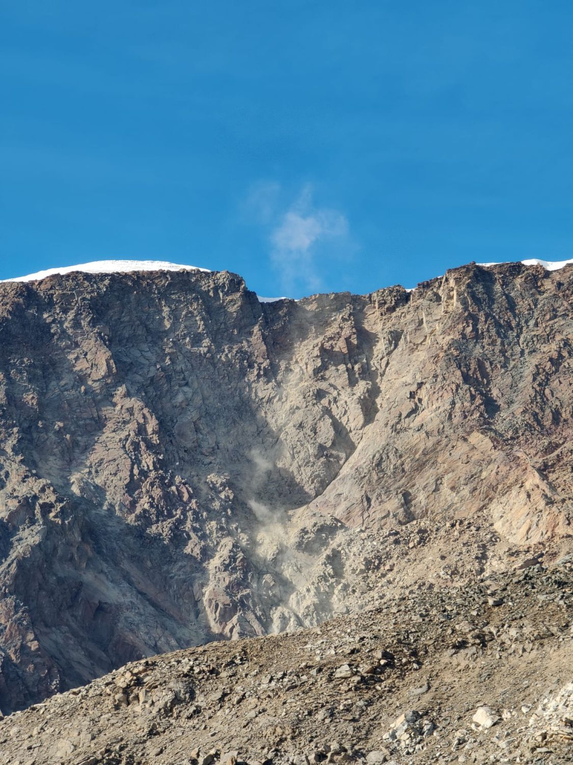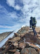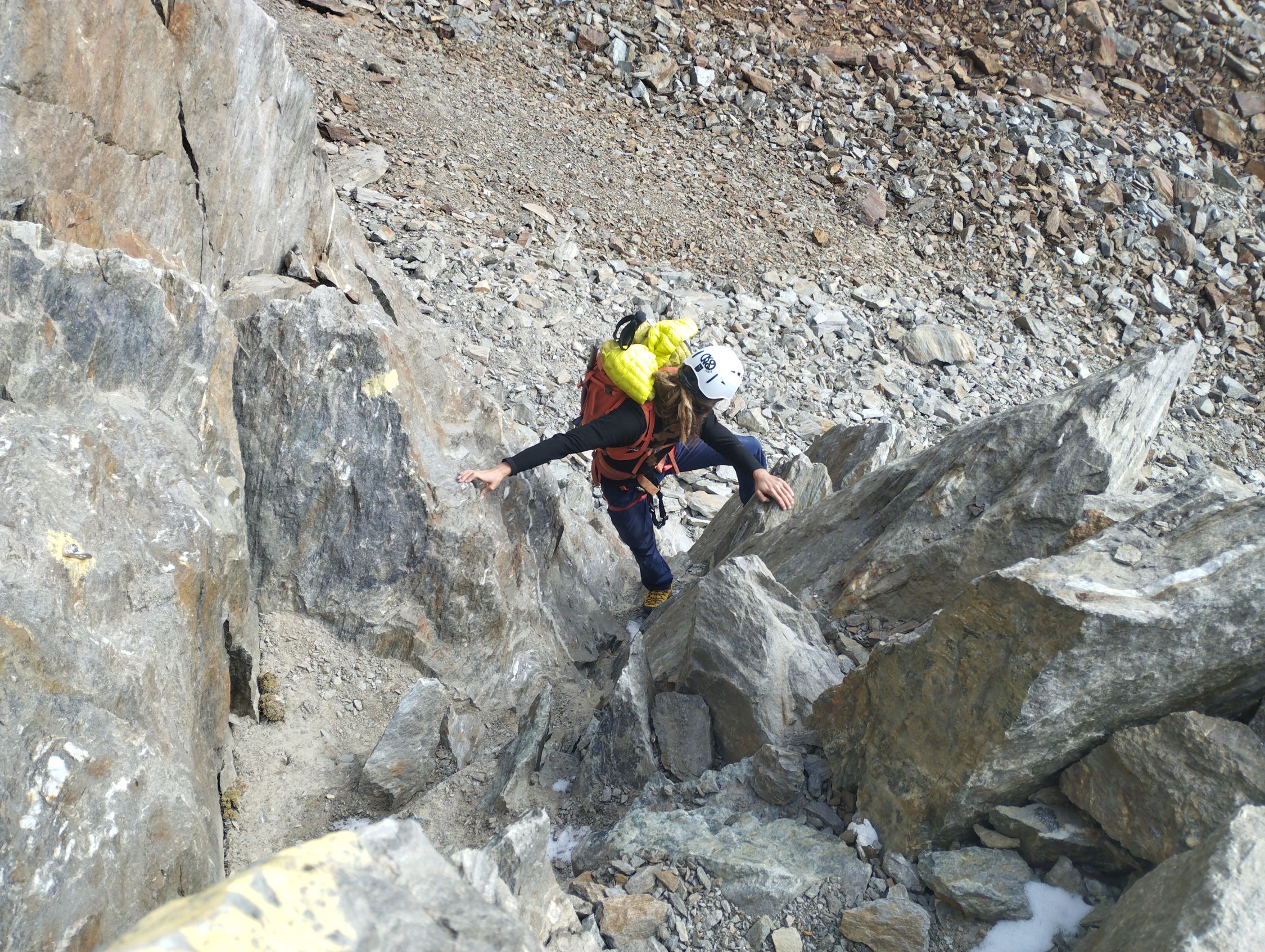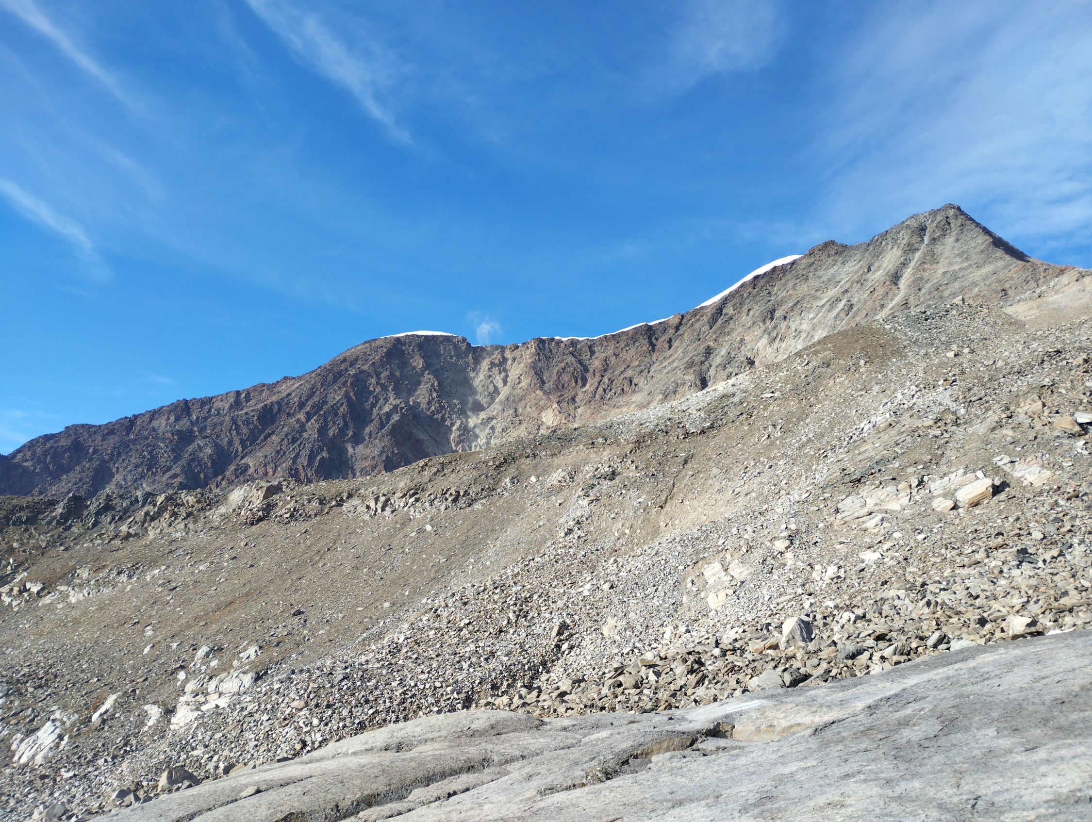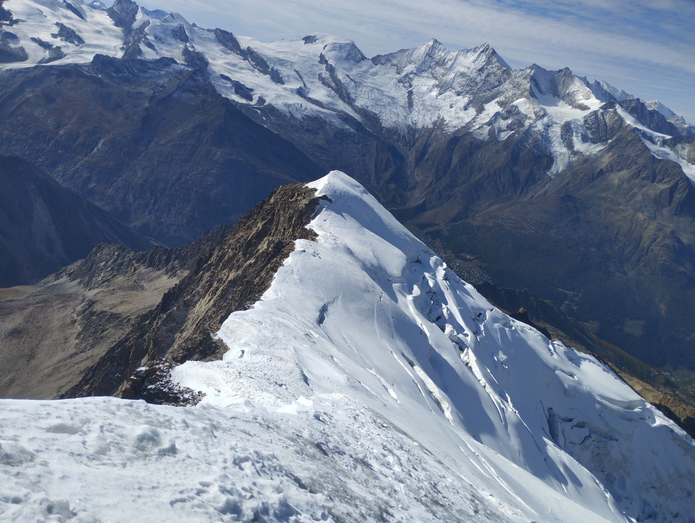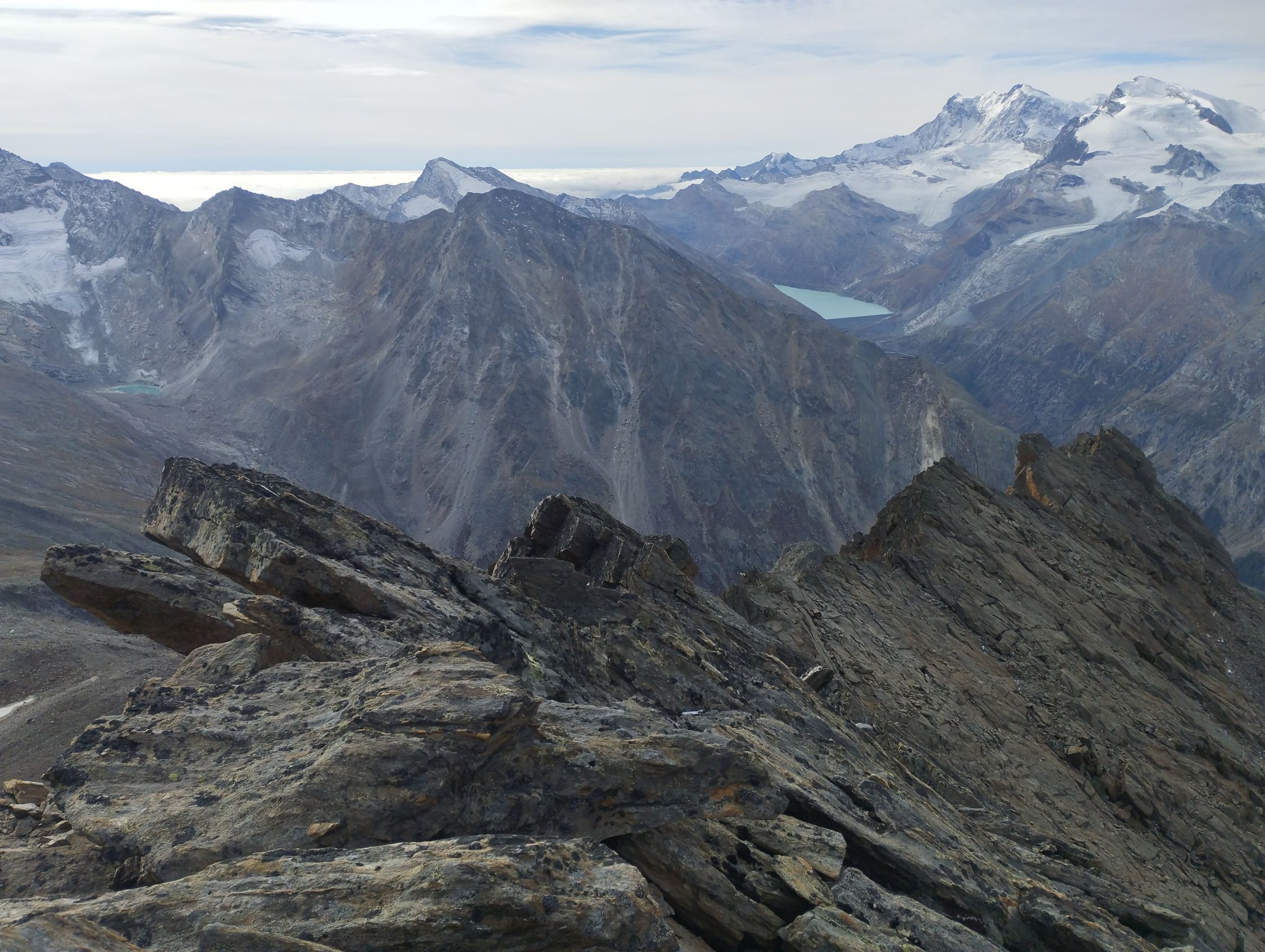 Kühle Temperaturen unter 0 °C aber top Verhältnisse auf der gesamten Überschreitung. Trotz unsicherer Wetterprognose war es, abgesehen von ein paar Schleierwolken, sehr sonnig! Die Hütte ist seit einer Woche geschlossen. Somit war außer uns keine Menschenseele am Berg. Die Kletterei am Rotgrat ist trocken und Genuss pur! Wir seilten am Gletscher an und stiegen direkt über die steile Firnschneide. Aufgrund des Windes kaum mehr Spuren vorhanden. Der Firn war hart gefroren, somit Eisen und Pickel obligatorisch. Danach zügiger Abstieg über den Südgrat. Wir beobachteten einen Steinschlag im Abstieg, der etwa bei Pt. 3814 abging (siehe Bilder). Ansonsten war es ruhig. Unglaublich wie verlassen die Umgebung ist, wenn die Hütten geschlossen sind! Ein wahrer Traum! Gratuliere meinem Kollegen zu seinem ersten 4000er!