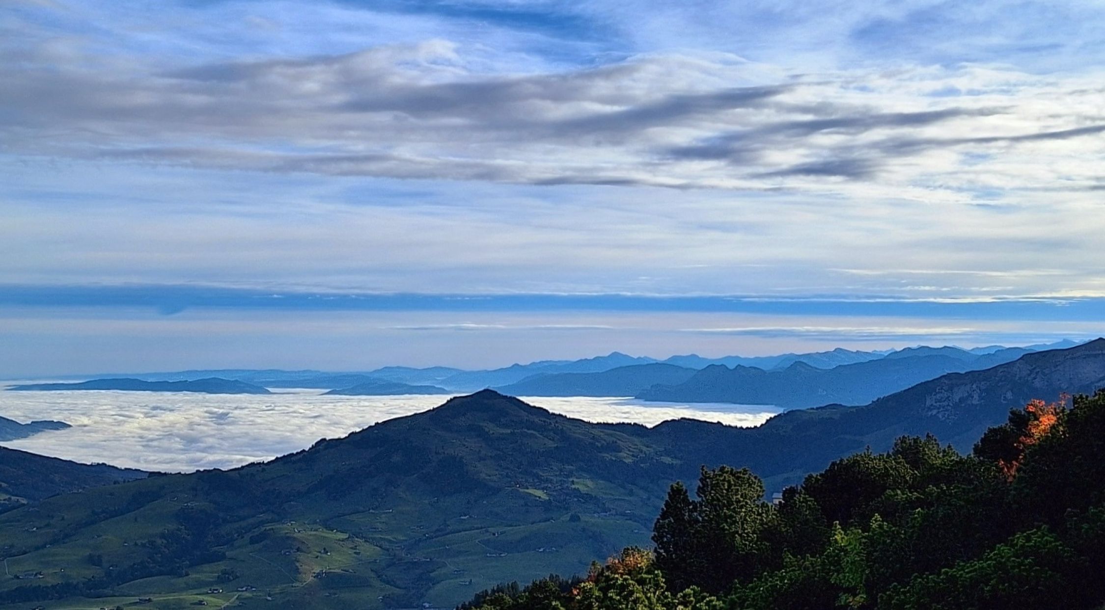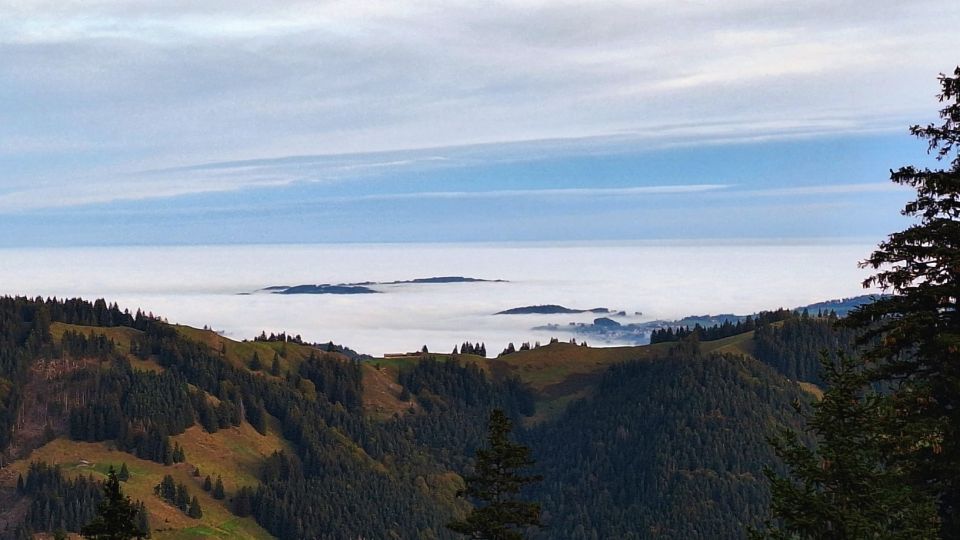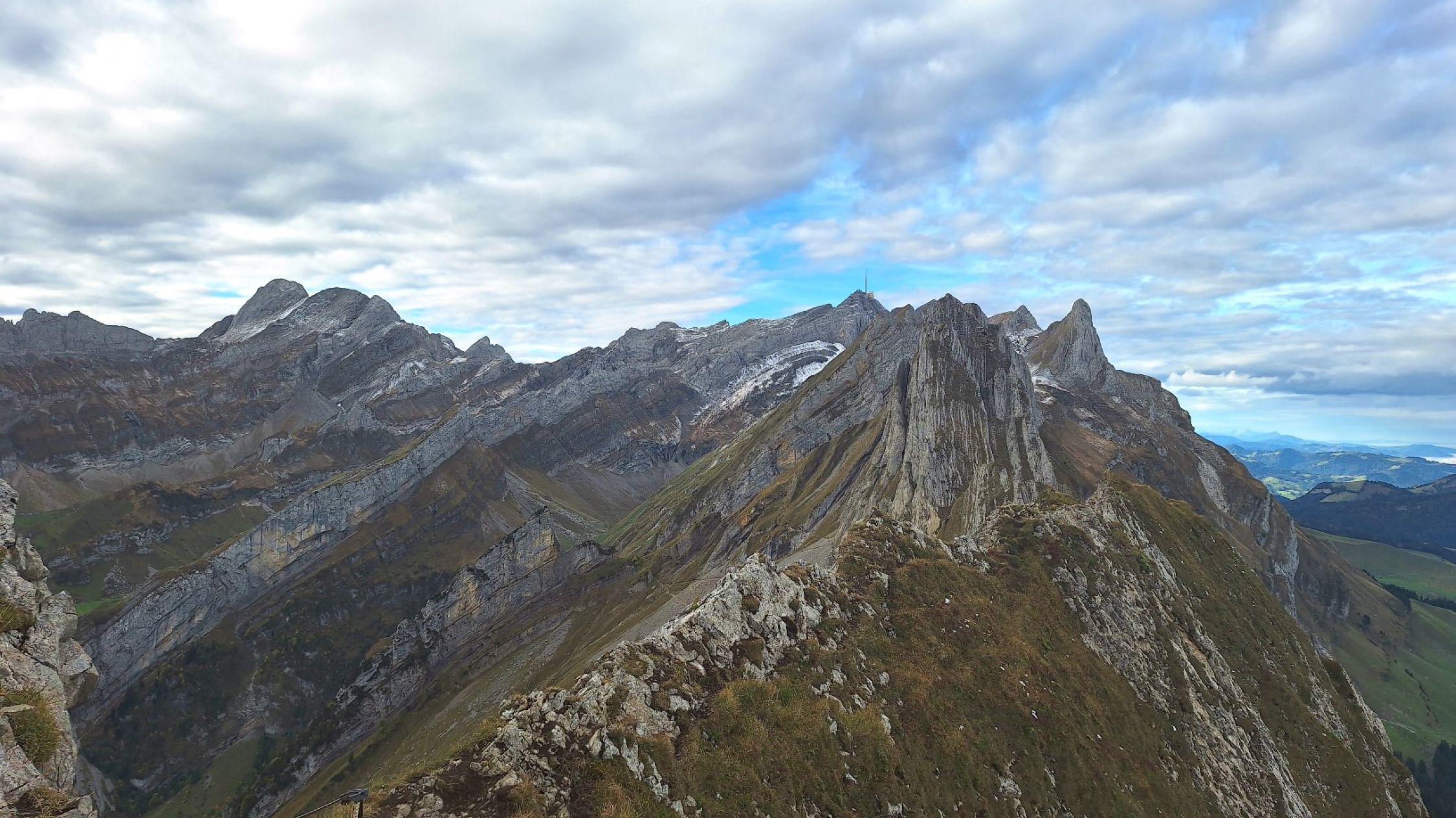 Gute Fernsicht bis weit in die Allgäuer Alpen. Hochnebel über dem Bodensee und dem Alpenvorland. Die ersten 4 Stunden haben wir nur 3 Wanderer getroffen, später um den Äscher/Ebenalp einige mehr.