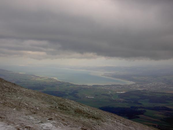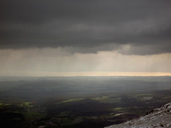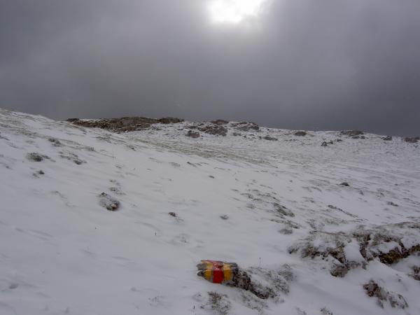 Kaum Schnee. Hochnebeldecke mit kleine Lücken, aber Untergrenze auf etwa 1600-1700 m. Deshalb relativ gute Sicht. Auf den Gipfel -7 mit stürmische Bise.
