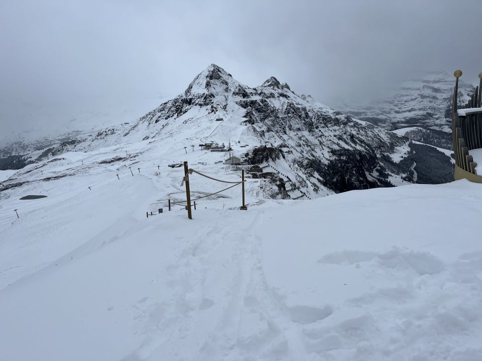 Jägerweg in gutem Zustand, diverse Drahtseile und künstliche Tritte. Schnee ab etwa 1500 m, ab etwa 1800 m auch etwas tiefer. Dennoch mit Stöcken und Gamaschen problemlos begehbar. Föhn am Vormittag zum Glück noch wenig spürbar. Da die Bahnen am Männlichen bis Mitte Dezember zu sind, auch oben sehr ruhig. Nur ein Biker war zuvor schon da, wohl von Grindelwald her…