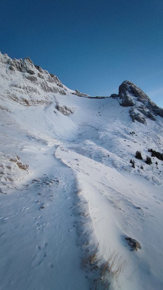 Bis kurz vor Alp Fräkmünt trocken, anschl. Schnee. Mit der Höhe zunehmend und im Schlussaufstieg auf dem Wanderweg kaum machbar da zu viel eingeblasener Schnee. Am Besten Gerade hinauf, ging ganz gut. Oben starker, kalter Wind...und keine Menschenseele.