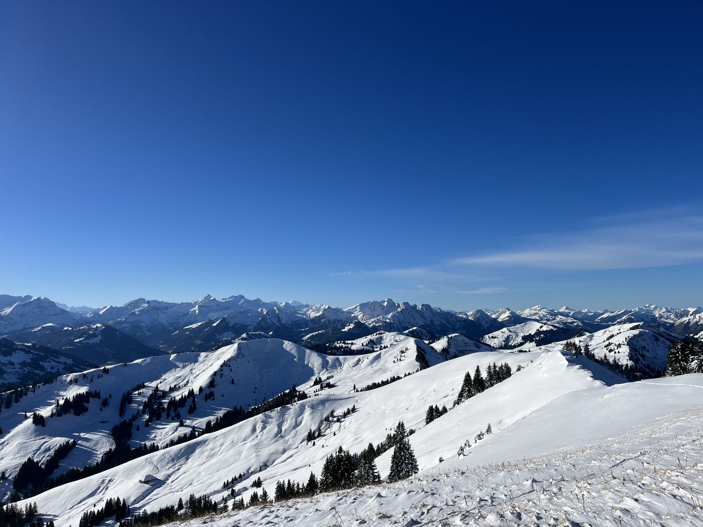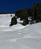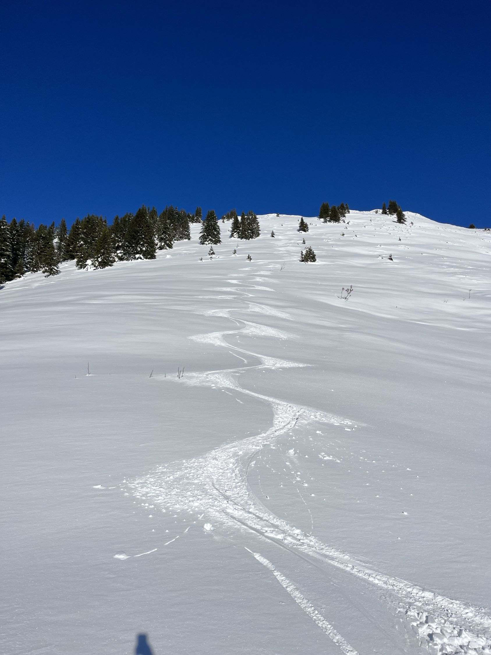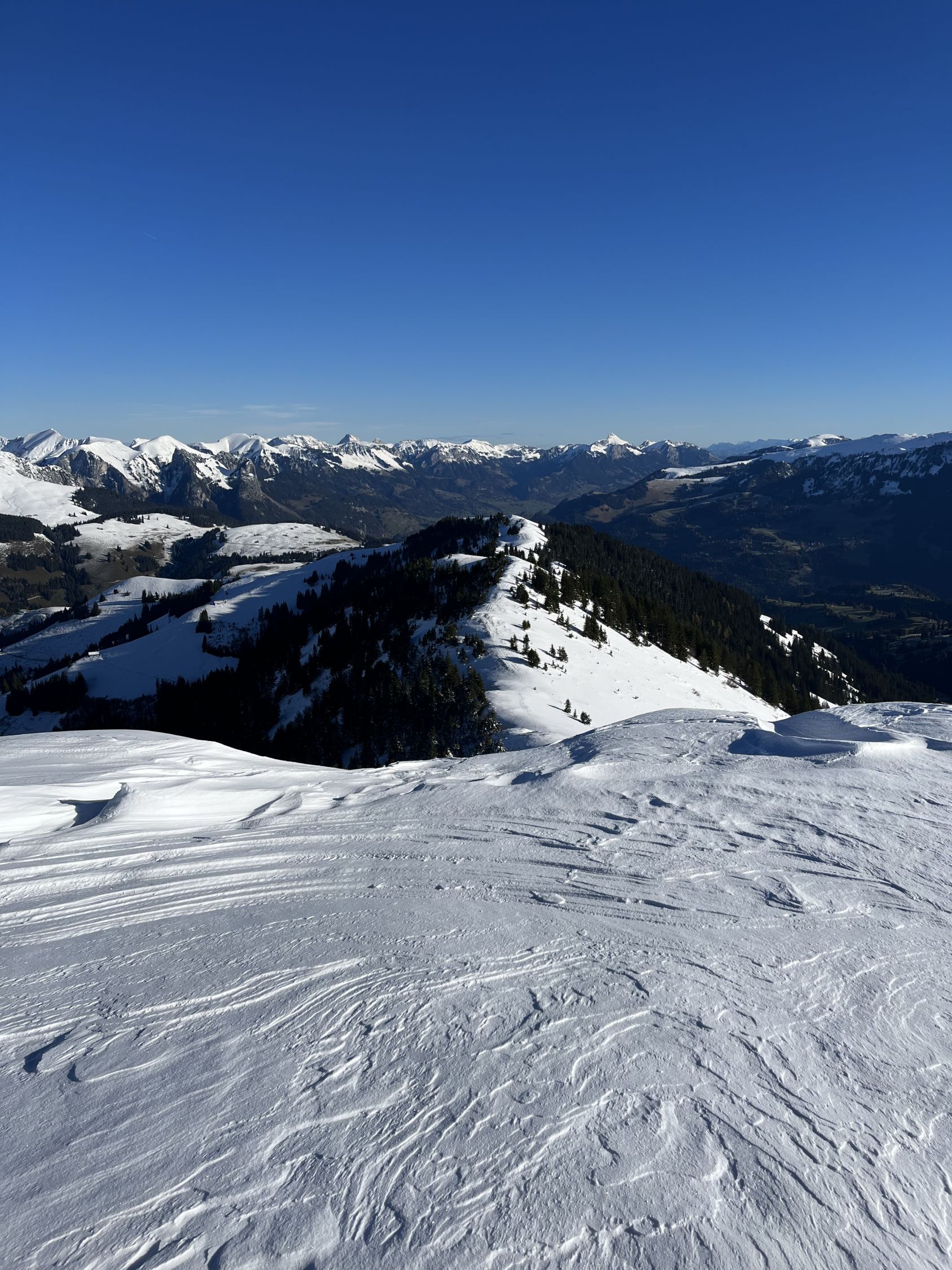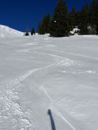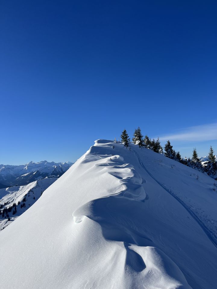 Der Grat ist vom Südwestwind etwas abgeblasen. Bin dann über den Erbetlaubgrat und Richtung Erbetlaub abgefahren. Top Schnee Verhältnisse mit einer soliden Grundlage und einem schönen Pülverchen drauf. Bin erstaunt, dass es ab 1600 Meter schon so schön Schnee hat. Wunderschönes Wetter.