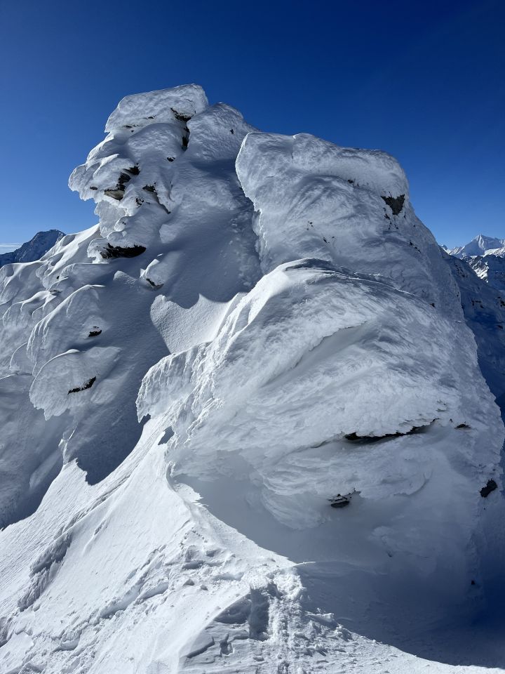 Pulvriger Schnee in überschaubarer Menge, gegen oben jedoch recht gut. Für Ski noch nicht machbar, für Schneeschuhe durchaus gut für Anfang November (dennoch altes Material ratsam…) Heute Prachtswetter mit relativ wenig Wind (für Simplon-Verhältnisse). Schneeschuhe ab dem Hospiz montiert, dann etwa von 2450 - 2650 aufgebunden (Blockfeld). Schlussgrat gut begehbar ohne Steigeisen.