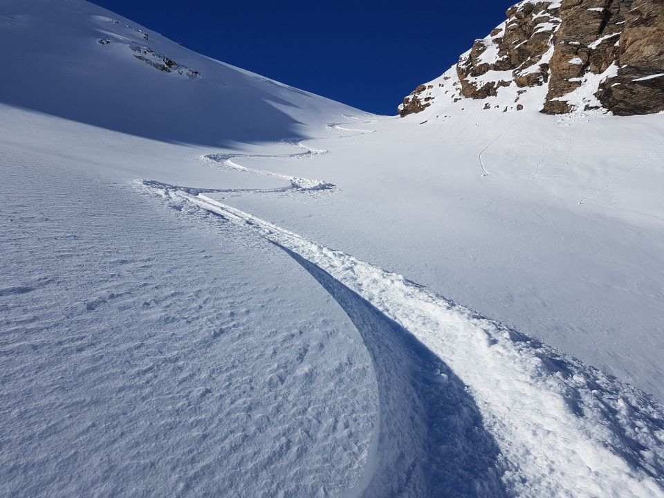 Ich bin von Juf (2125 m) los auf den Piz Surparé und dann nach Bivio (1769 m) abgefahren. Es liegt durchgehend Schnee. Schneequalität bei der Abfahrt bis runter auf 2750 m: Pulver bei 1,10 m Schneetiefe; Dann liegt bis auf 2550 m teilweise nur 10 bis 30 cm Schnee mit viel Steinkontakt, weil dort auch viel Blockwerk rumliegt. Darunter wird es erstaunlicherweise wieder besser mit konstant 30 cm und Pulver bis ins Dorf.