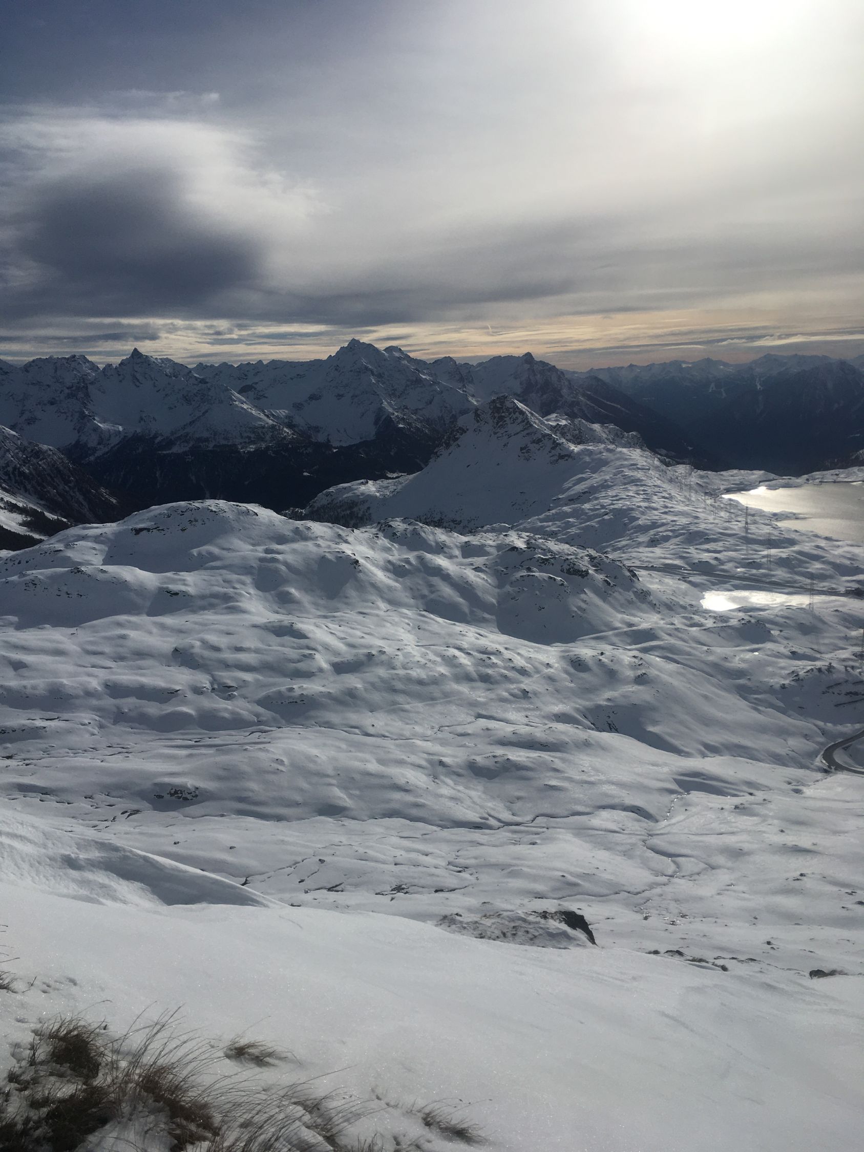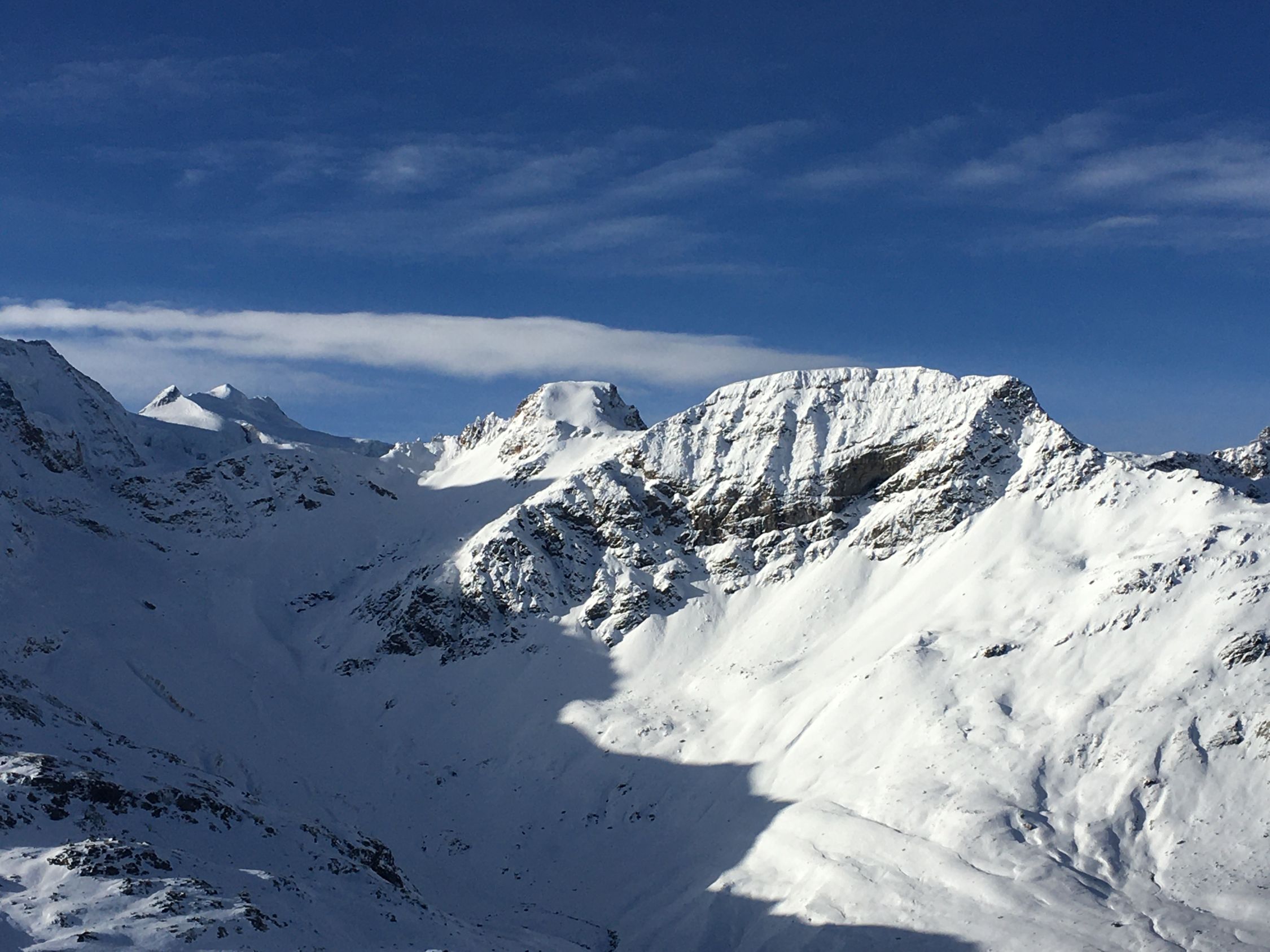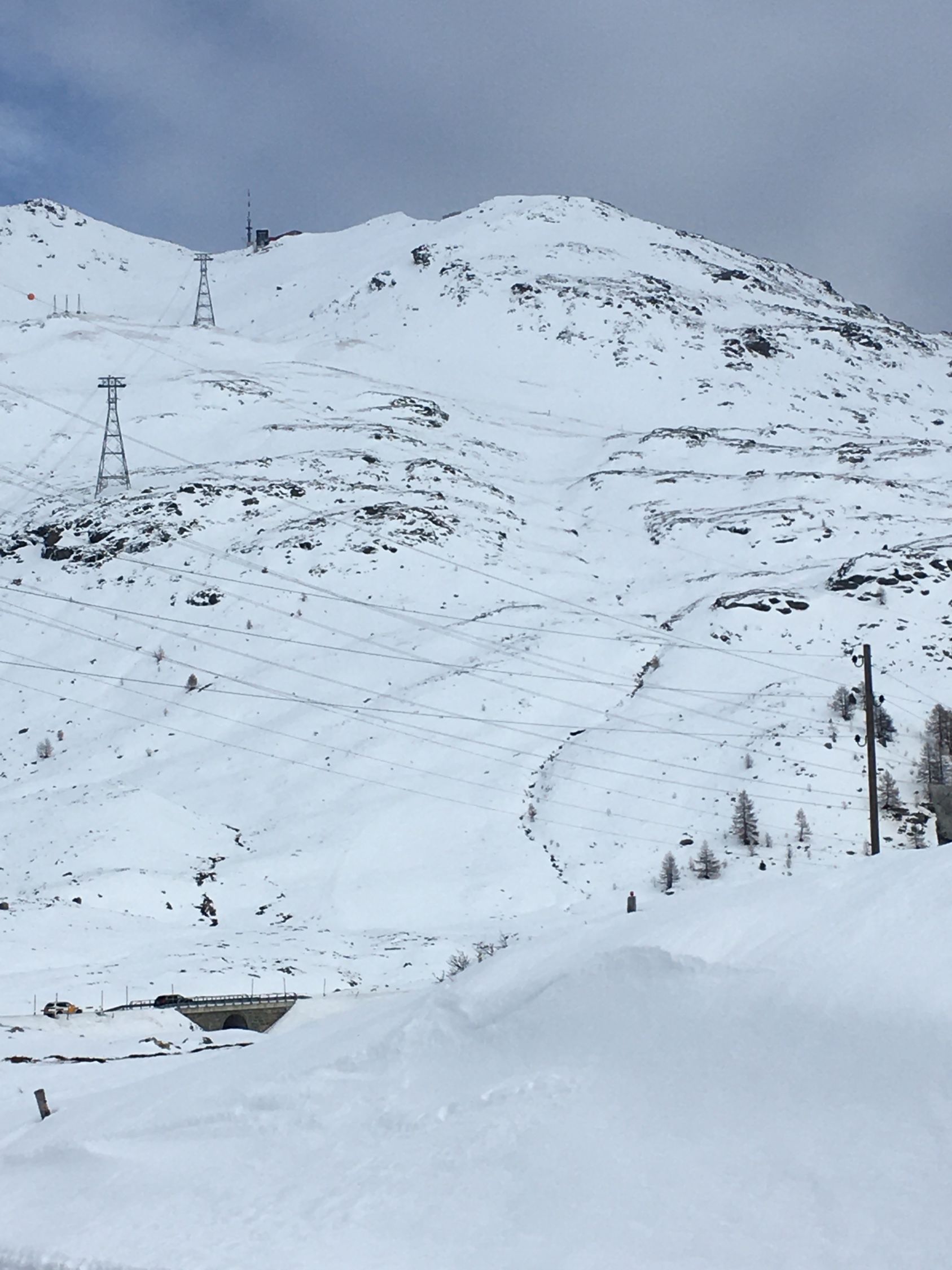 Rundtour ab Berninapasstrasse unterhalb Ospizio zum Aussichtsgipfel und Westabfahrt zur Talstation. Start 8.45 Uhr, minus 4 Grad, blauer Himmel, Südwind. Alles pickelhart, bin mit Harscheisen bis Höhe 2844. Hier verschlechterte sich das Wetter schnell und ich machte mich bereit für die Westabfahrt. Leider hatte ich sehr schlechte Sicht vor allem im oberen Teil. Auch machte mir die breite Ratracspur der Pistenpräparierung zu schaffen, sehr grobes Profil und mühsam zu befahren. Da die Sicht sehr diffus war hielt sich das Abfahrtsvergnügen in engen Grenzen. Bei guter Sicht hat es genügend Platz neben der groben Pistenspur. Bei dieser schlechten Sicht Abfahrt „machbar“, bei guter Sicht „gut“. Oben ein kurzes Stück Pulverschnee, dann alles hart mit guter Unterlage. Bergbahn Lagalb ab 20. Dezember in Betrieb.