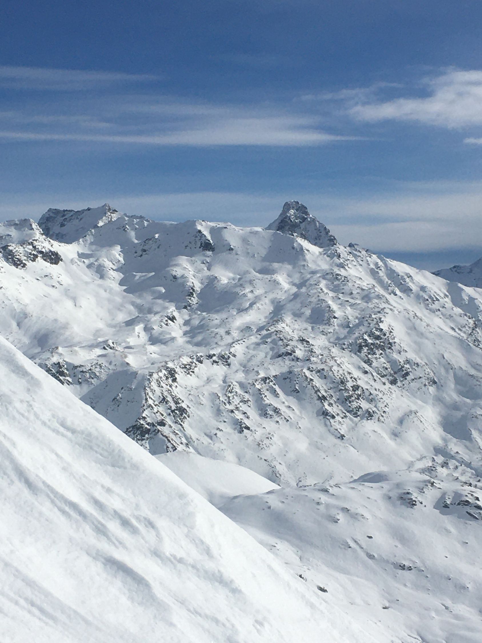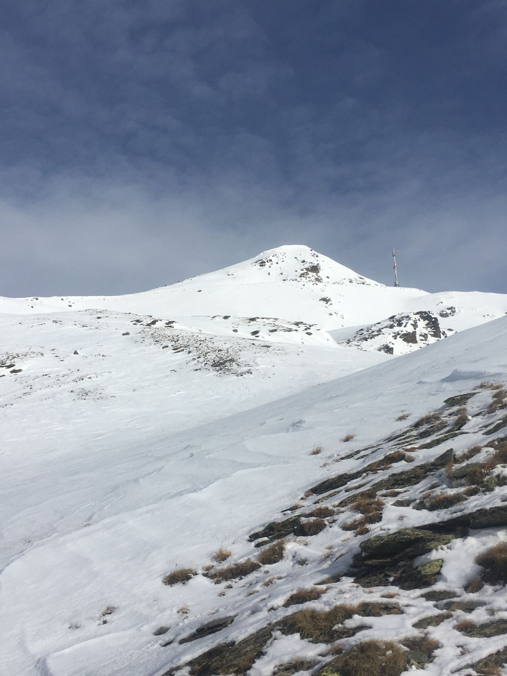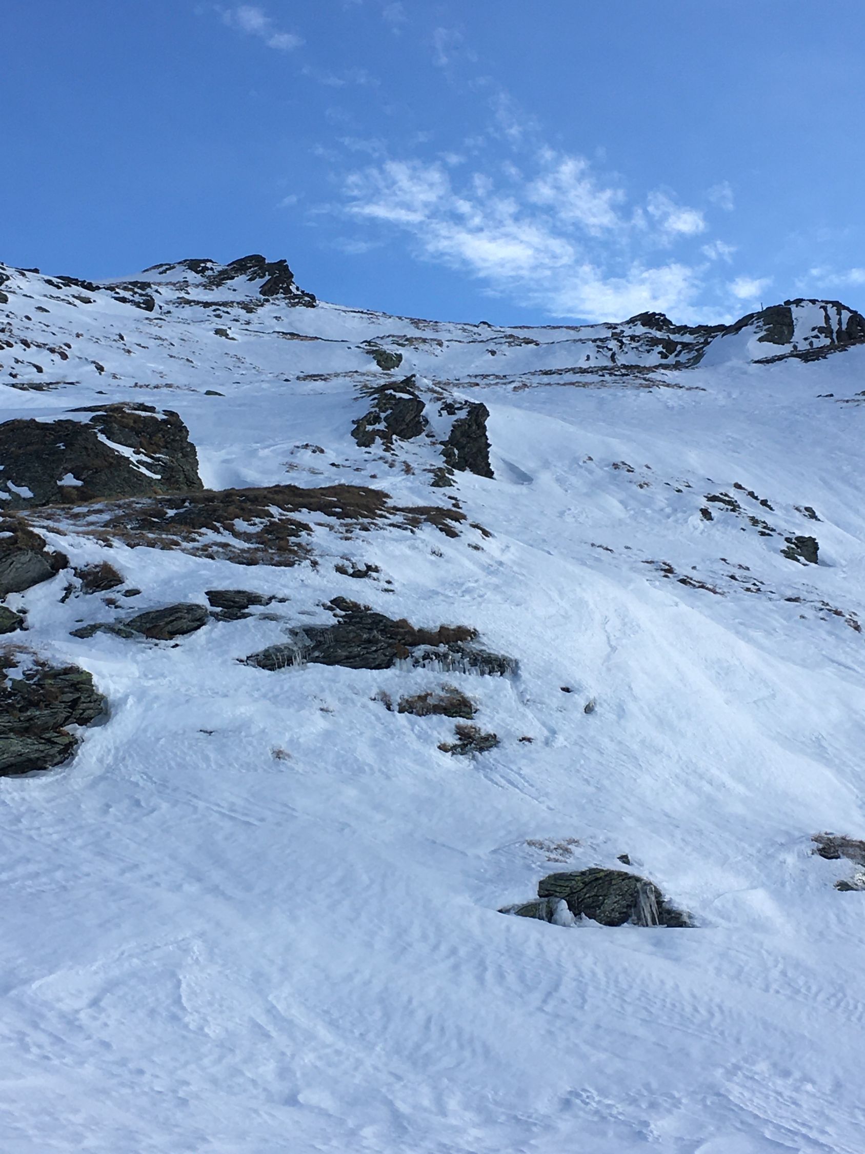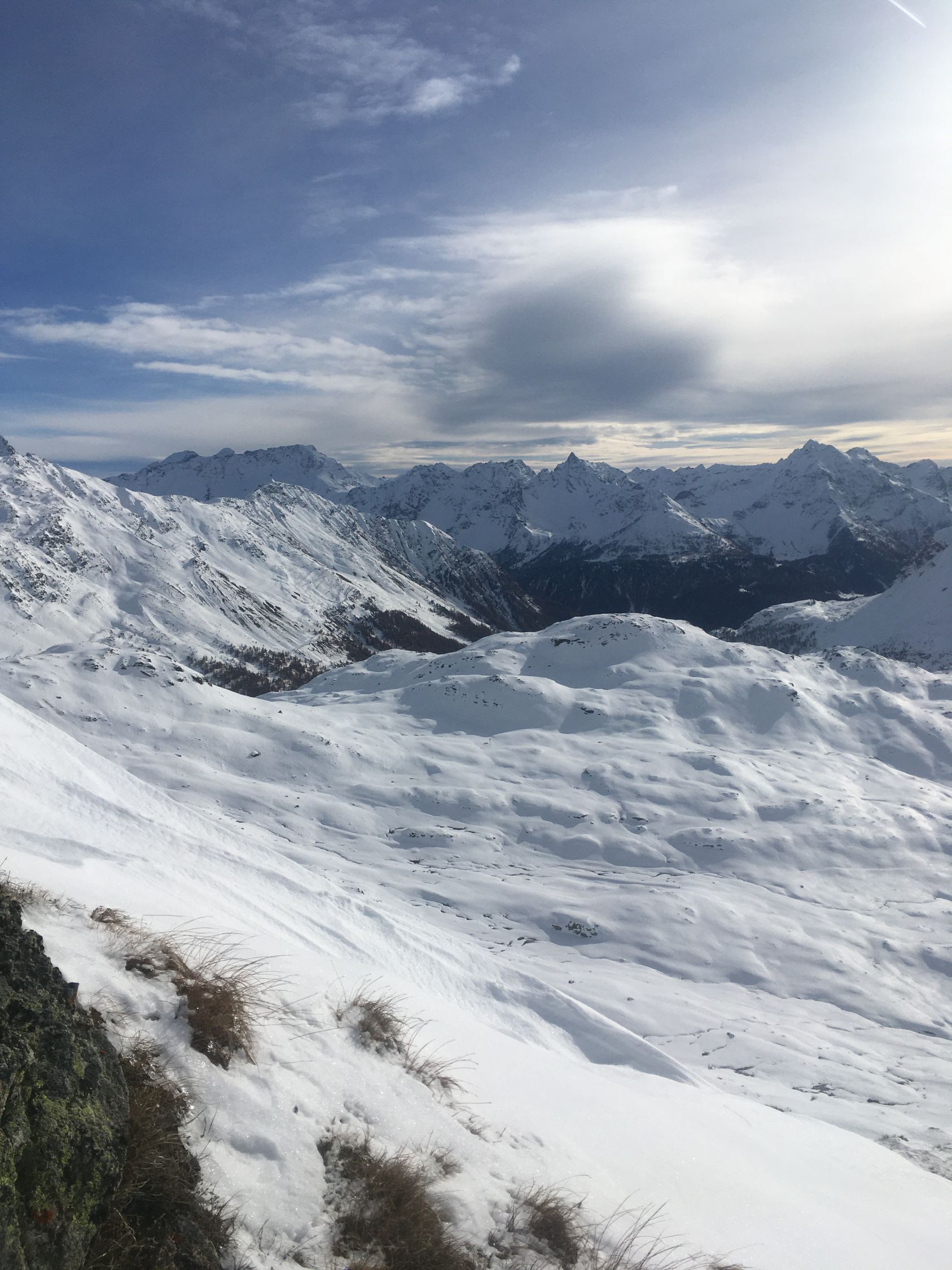 Rundtour ab Berninapasstrasse unterhalb Ospizio zum Aussichtsgipfel und Westabfahrt zur Talstation. Start 8.45 Uhr, minus 4 Grad, blauer Himmel, Südwind. Alles pickelhart, bin mit Harscheisen bis Höhe 2844. Hier verschlechterte sich das Wetter schnell und ich machte mich bereit für die Westabfahrt. Leider hatte ich sehr schlechte Sicht vor allem im oberen Teil. Auch machte mir die breite Ratracspur der Pistenpräparierung zu schaffen, sehr grobes Profil und mühsam zu befahren. Da die Sicht sehr diffus war hielt sich das Abfahrtsvergnügen in engen Grenzen. Bei guter Sicht hat es genügend Platz neben der groben Pistenspur. Bei dieser schlechten Sicht Abfahrt „machbar“, bei guter Sicht „gut“. Oben ein kurzes Stück Pulverschnee, dann alles hart mit guter Unterlage. Bergbahn Lagalb ab 20. Dezember in Betrieb.