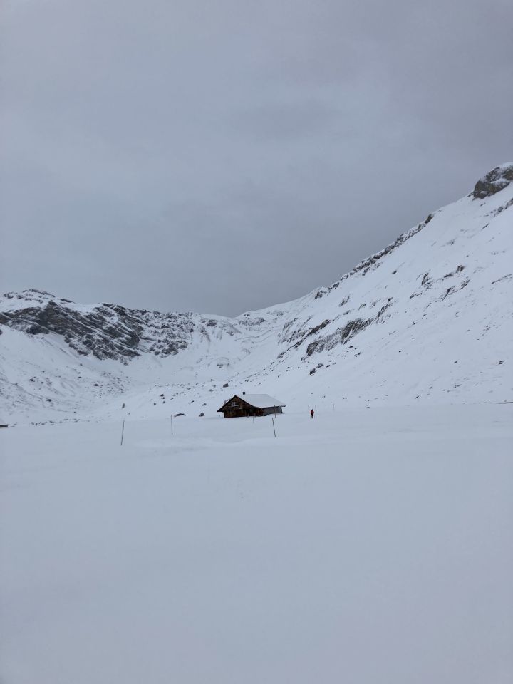 Nach dem ich in der Ebene aufgefellt hatte, verflogen diese aber. Es gab eine tragende Unterlage mit ca. 5 - 15 cm Pulver als Auflage. Im Aufstieg immer wieder auch lokal sehr viel mehr, oder gar nichts. Tendenziell waren die Mulden aber gut gefüllt. Zu sagen, der einzige Steinkontakt im Aufstieg sei die Querung des Baches in der Ebene gewesen, wäre gelogen. Aber ich hab mir auch nicht so viel Mühe gegeben. Steinski und Grasfelle.