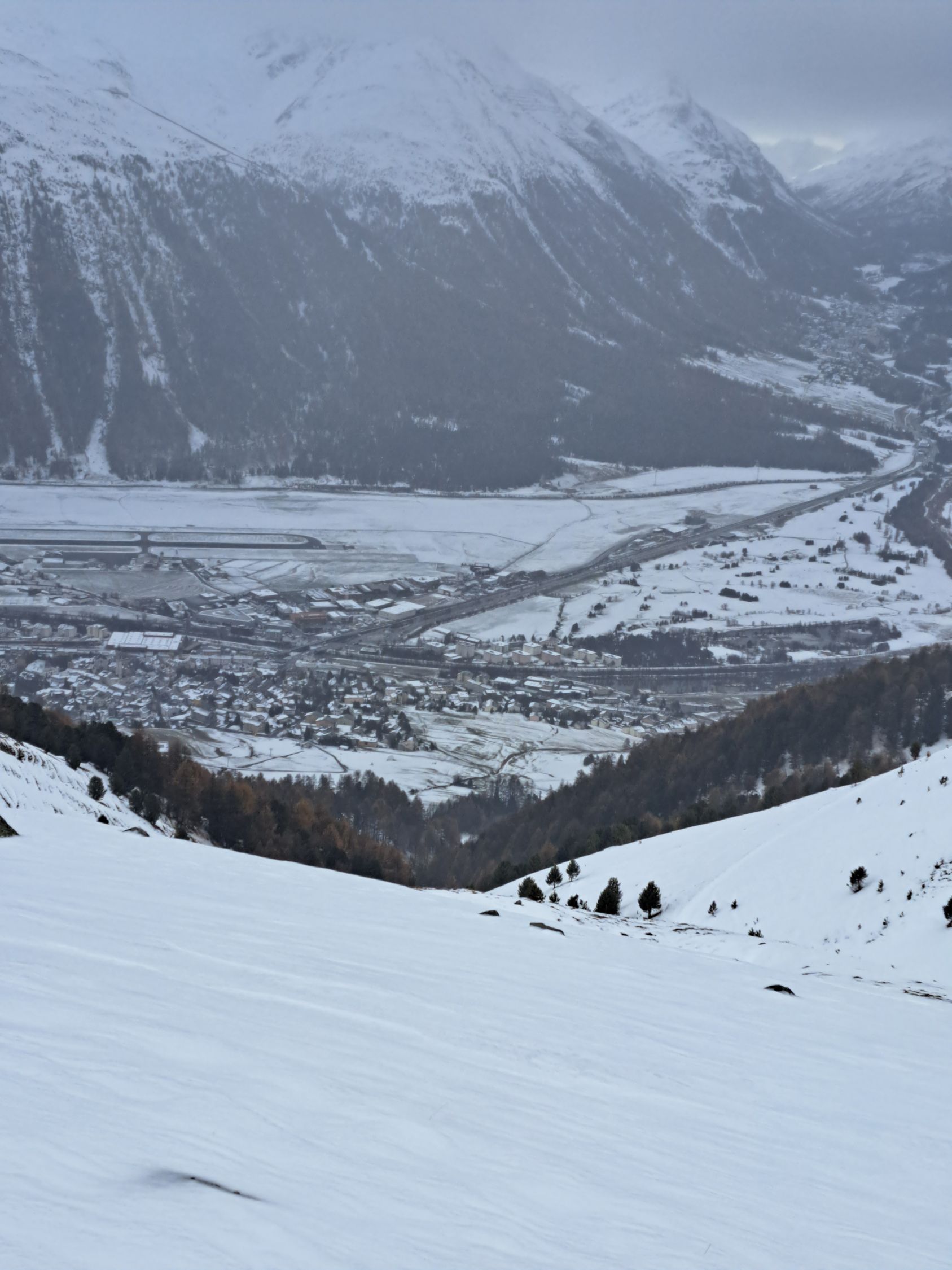 Regen bis 2600 m, entsprechende Stollenbildung. Bis 2300 m zu wenig Schnee (nur Aufstieg möglich). Deshalb Abfahrt über Skipiste nach Celerina gewählt wo genügend Schnee bereit ist.