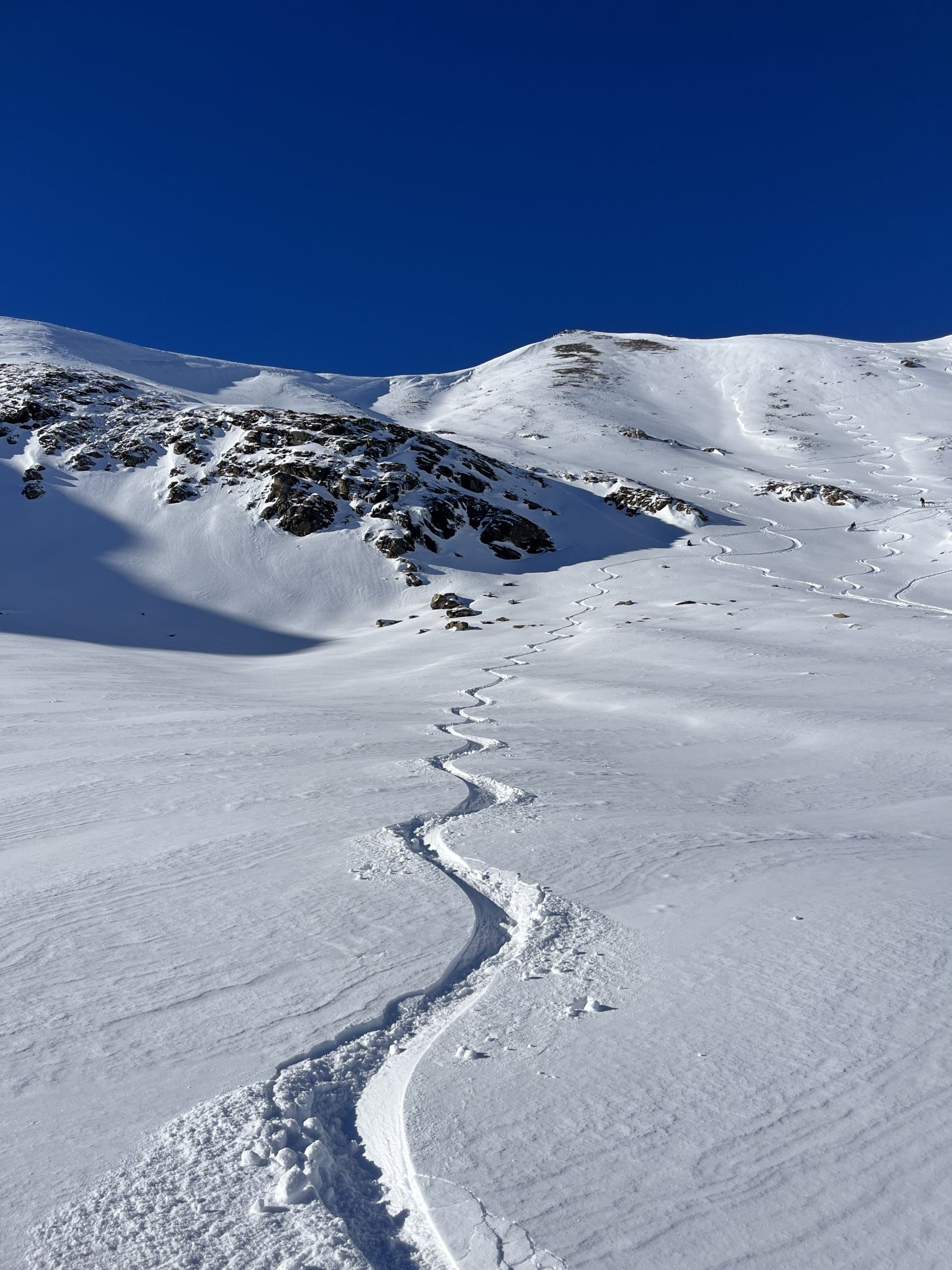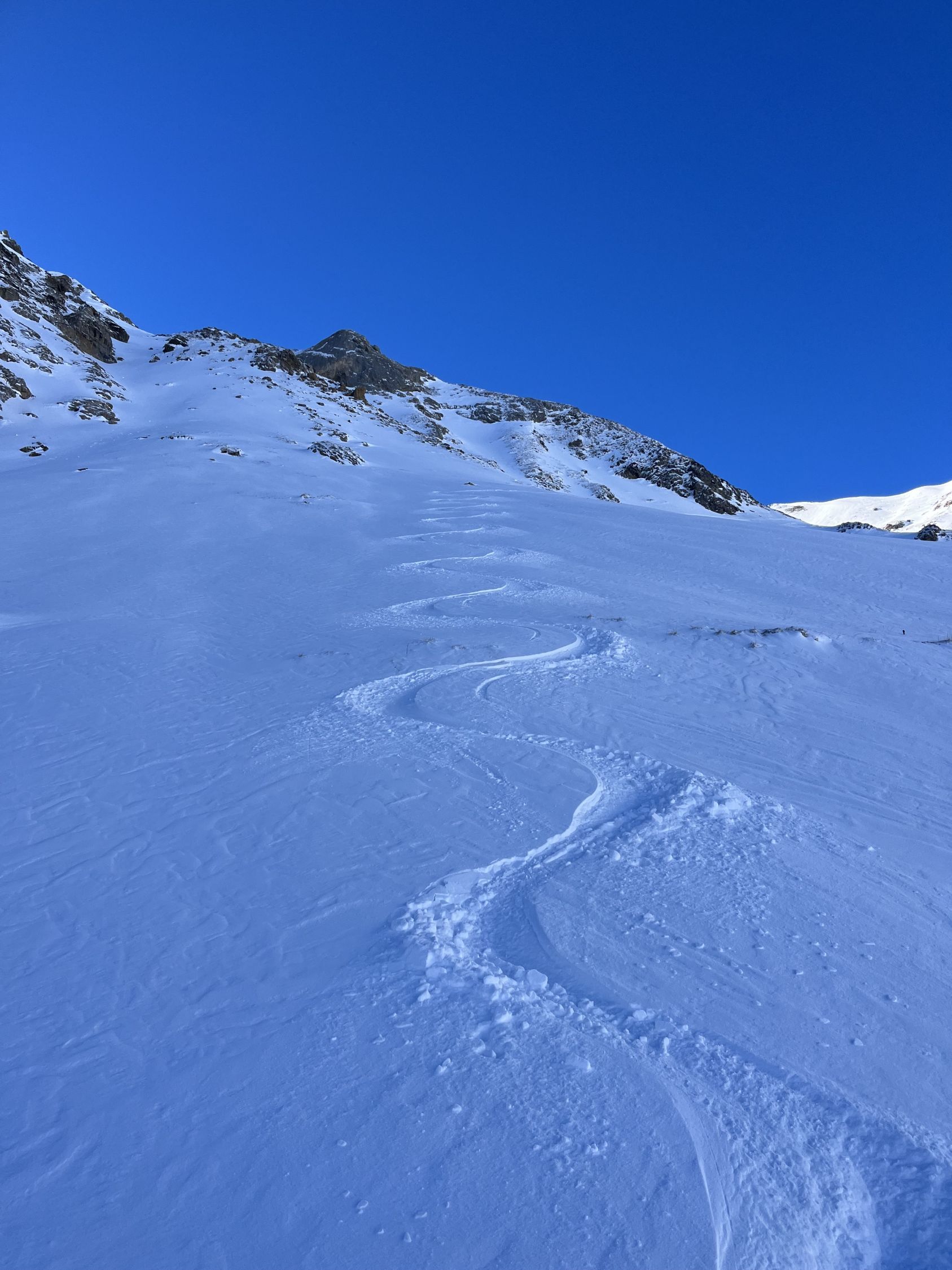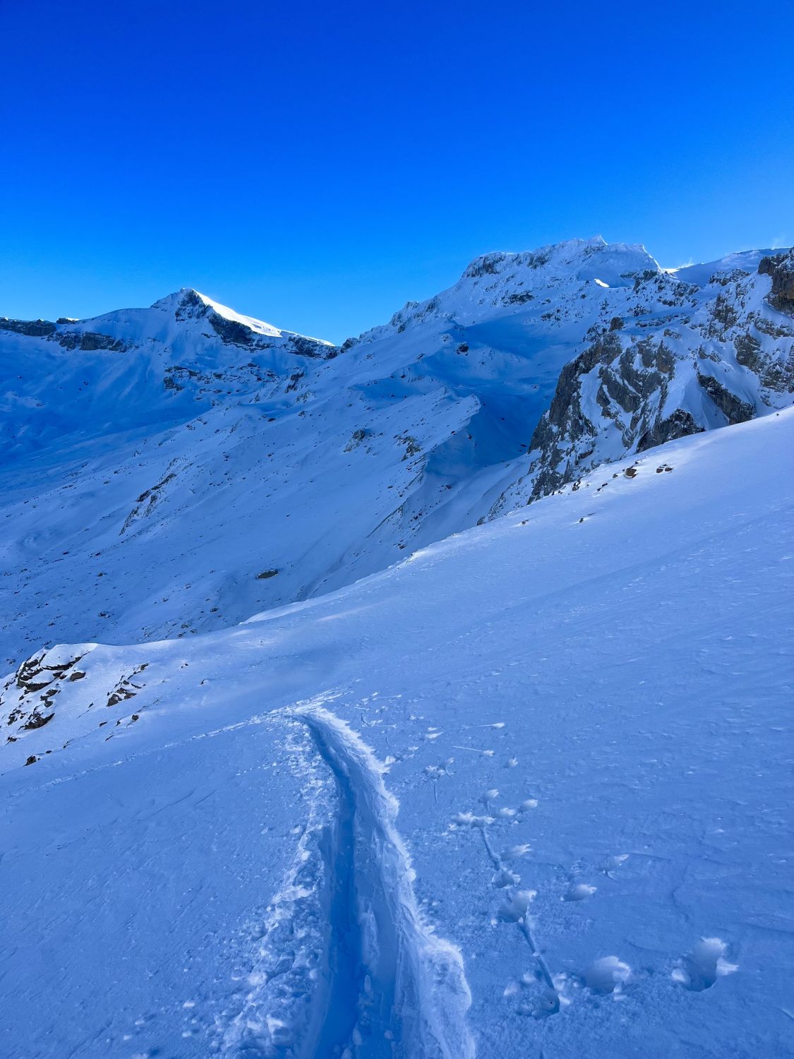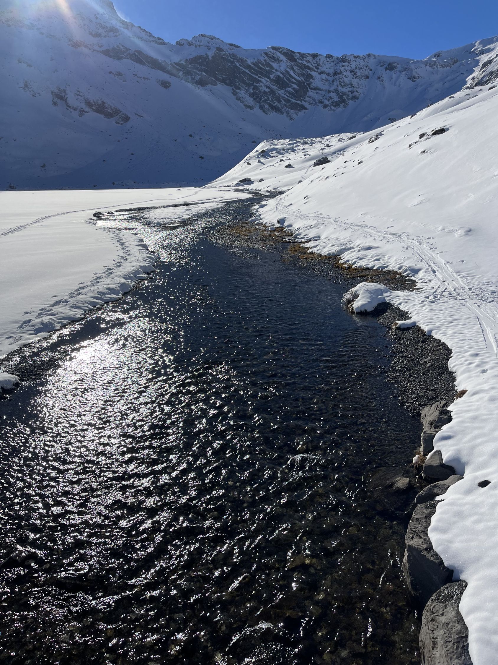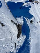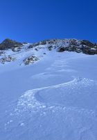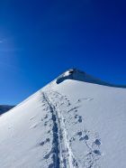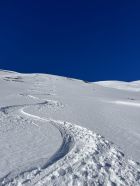 Top Verhältnisse mit guter Grundlage und frischem Pulverschnee (20-30cm) von oben bis unten. Besser kann’s nicht sein. Traumhaft schönes Wetter und angenehm warm. Kaum Wind. Der Brücke über den Bach fehlen die Gitter. Mann muss über die Eisenbalken laufen. Es ist auch möglich weiter nach hinten auf der linken Seite dem Bach entlang zu gehen, bis man zu einer Brücke kommt. Dort überqueren ist angenehmer.