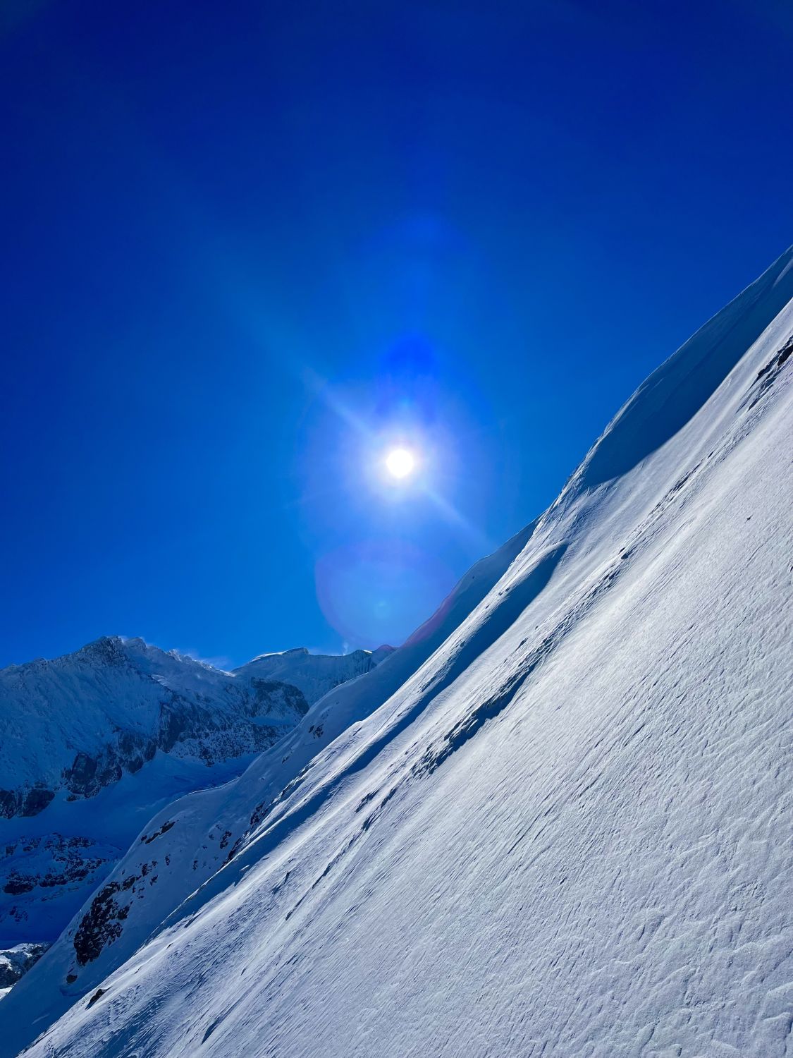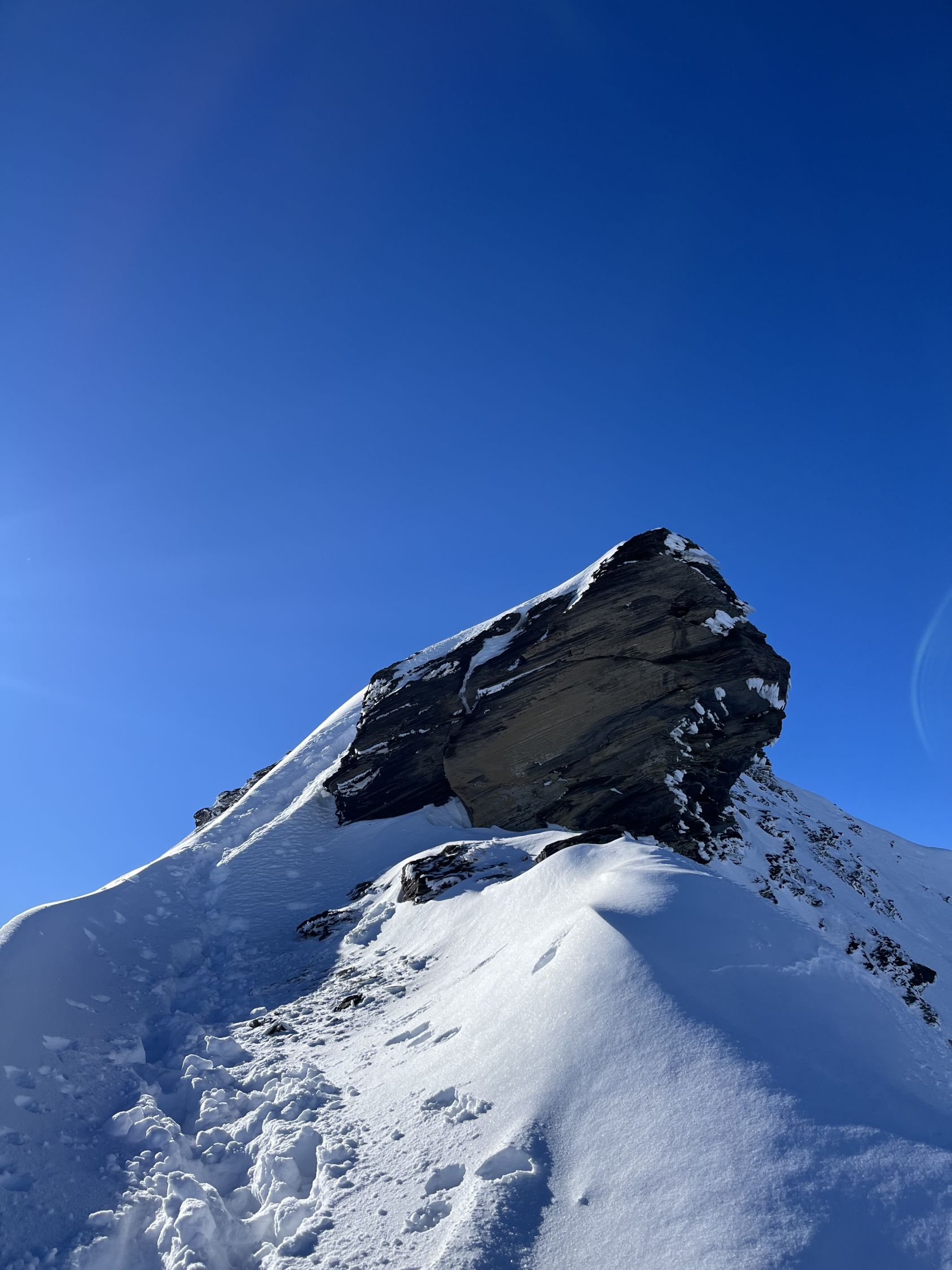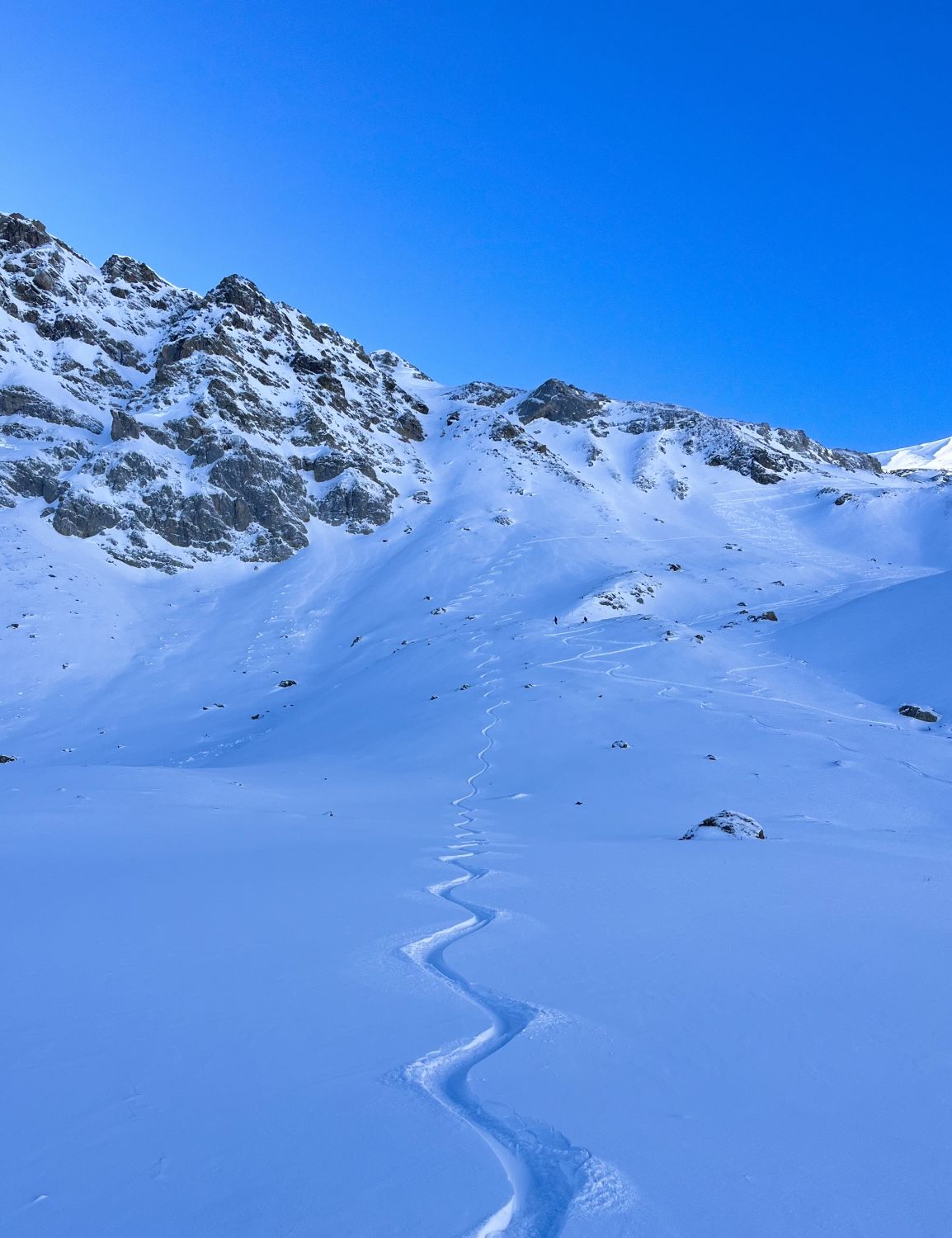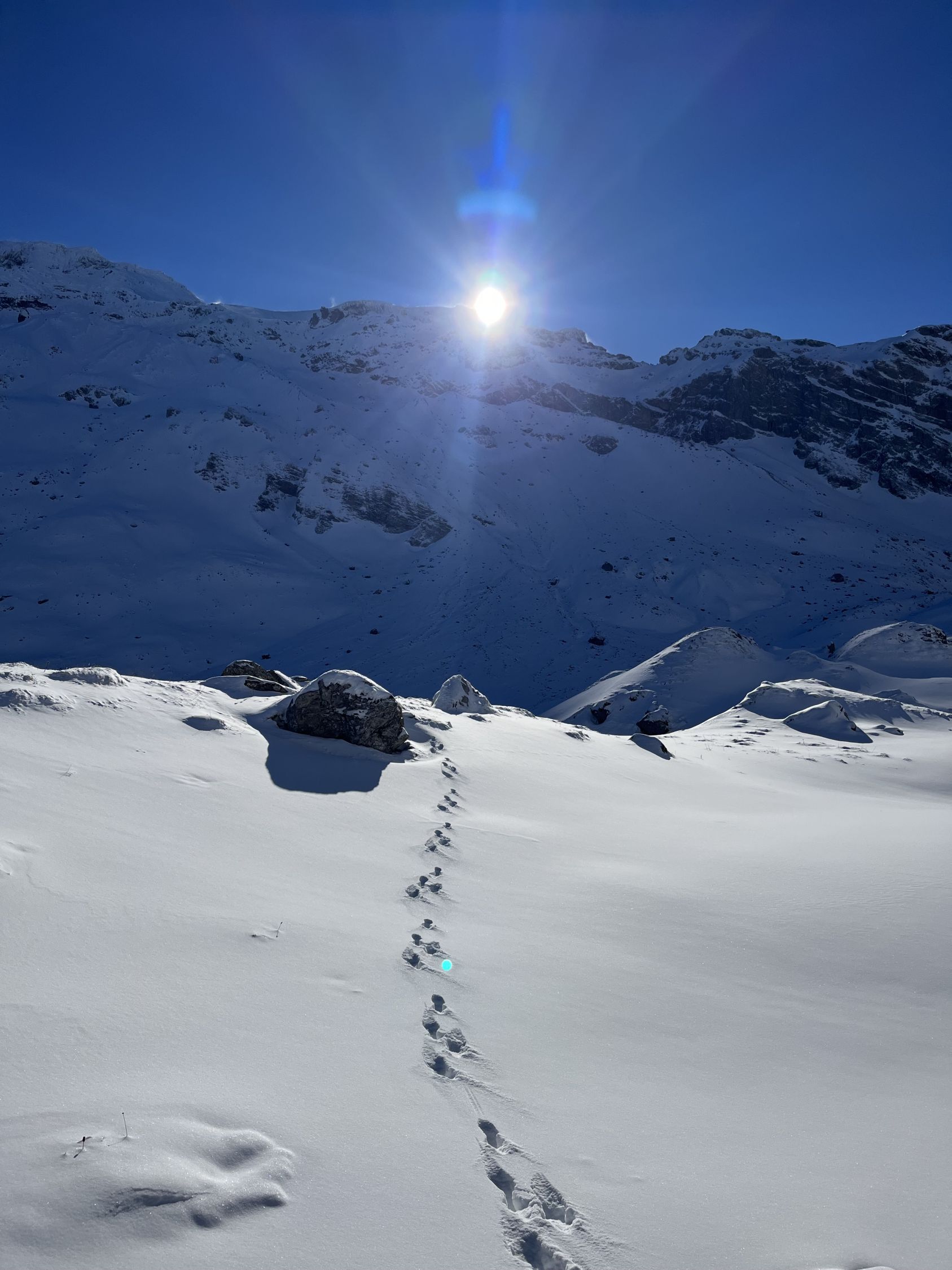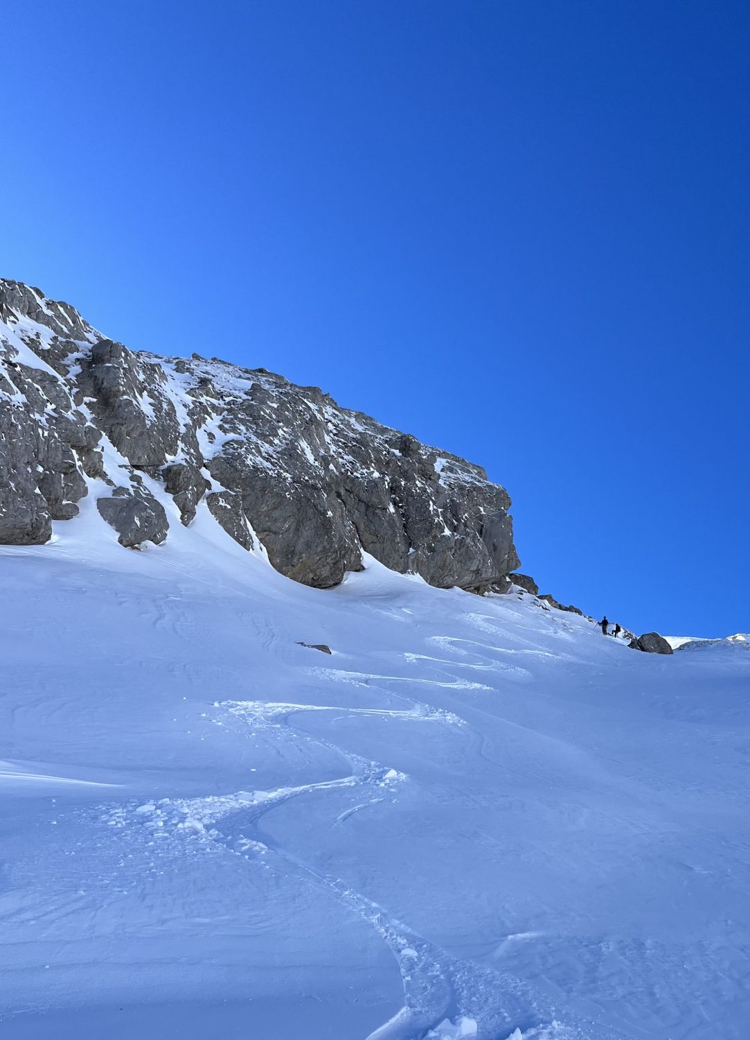 Top Verhältnisse mit guter Grundlage und frischem Pulverschnee (20-30cm) von oben bis unten. Besser kann’s nicht sein. Traumhaft schönes Wetter und angenehm warm. Kaum Wind. Der Brücke über den Bach fehlen die Gitter. Mann muss über die Eisenbalken laufen. Es ist auch möglich weiter nach hinten auf der linken Seite dem Bach entlang zu gehen, bis man zu einer Brücke kommt. Dort überqueren ist angenehmer.